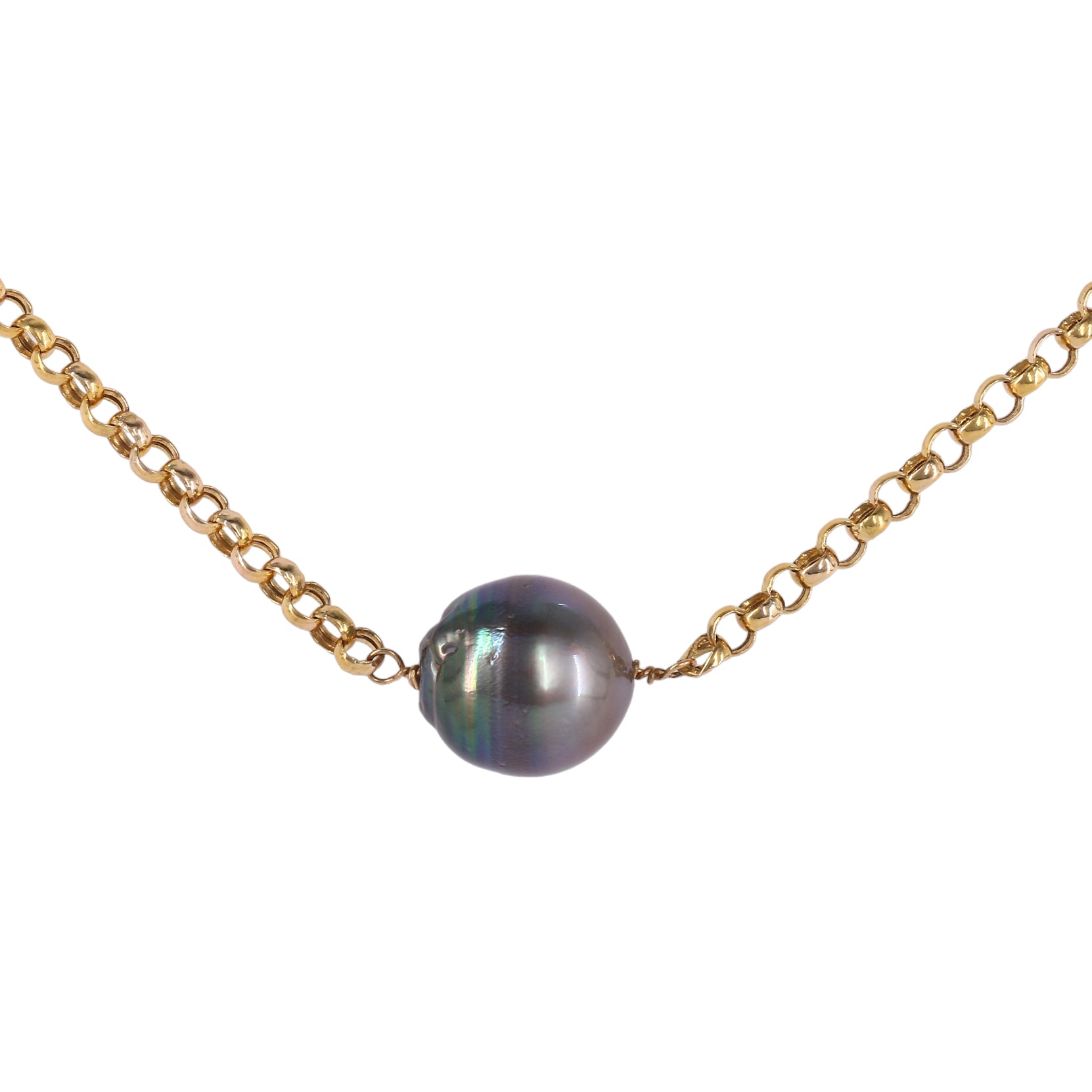 Collar de oro macizo amarillo de 14 quilates adornado con 5 grandes perlas grises. Esta pieza única presenta una clásica cadena de eslabones rolo, que proporciona el telón de fondo perfecto para las brillantes perlas. Abraza la belleza atemporal con este exquisito collar, ideal para añadir sofisticación a cualquier look.