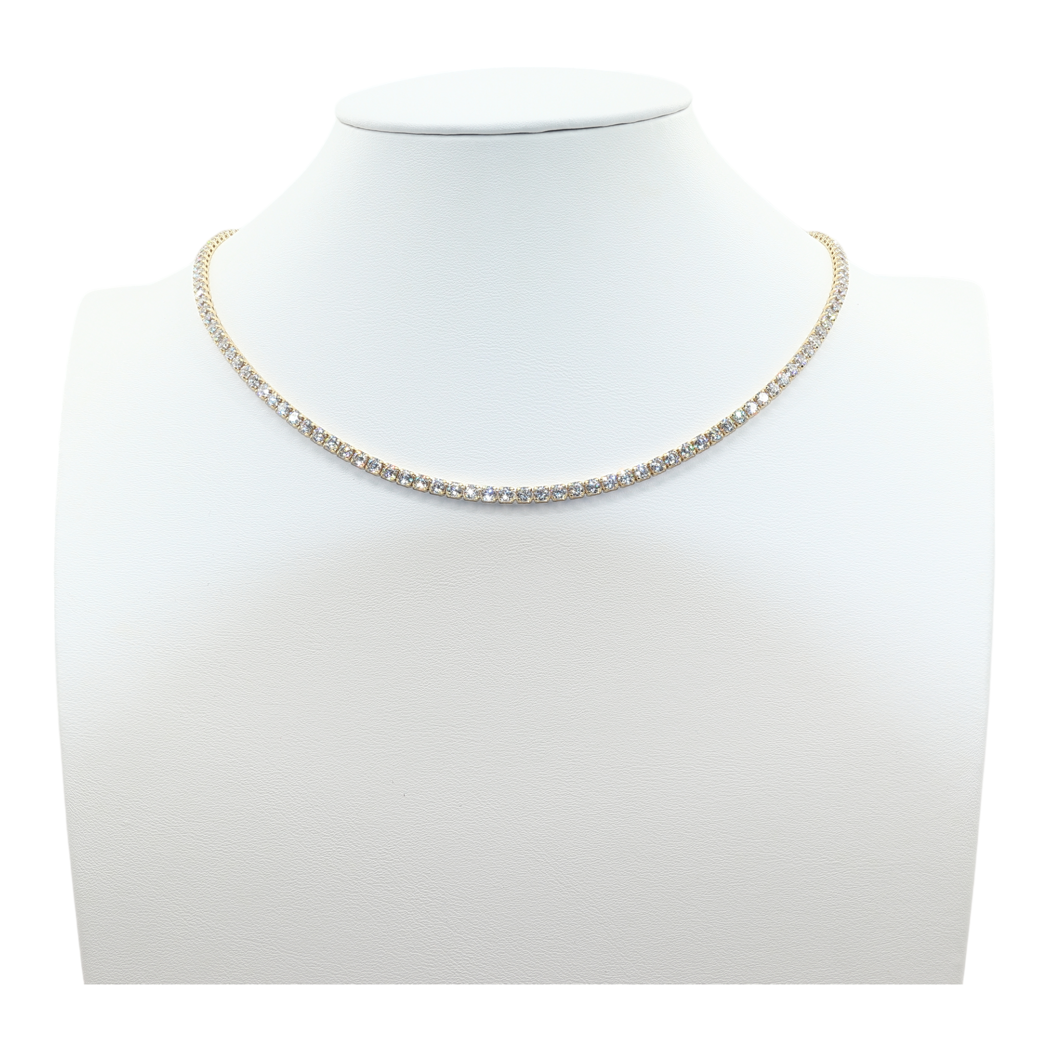 La elegancia y la sofisticación definen nuestro collar de cadena tipo tenis de oro amarillo de 14k y 18” para mujer. Este collar, que mide 18 pulgadas de largo y presenta una cadena delgada de 2,85 mm de ancho, realza maravillosamente cualquier escote. Su cierre de caja seguro garantiza seguridad y facilidad de uso. Adornando la cadena hay 143 deslumbrantes piedras de circonita cúbica de talla redonda, estimadas en 0,08 quilates cada una, lo que contribuye a un peso total aproximado en quilates de 11,44 quilates. Elaborado con exquisito oro amarillo de 14k, este collar pesa 11,6 g, lo que simboliza tanto la opulencia como la calidad duradera. Eleva tu estilo con este collar de cadena de tenis, una verdadera declaración de lujo y glamour.
