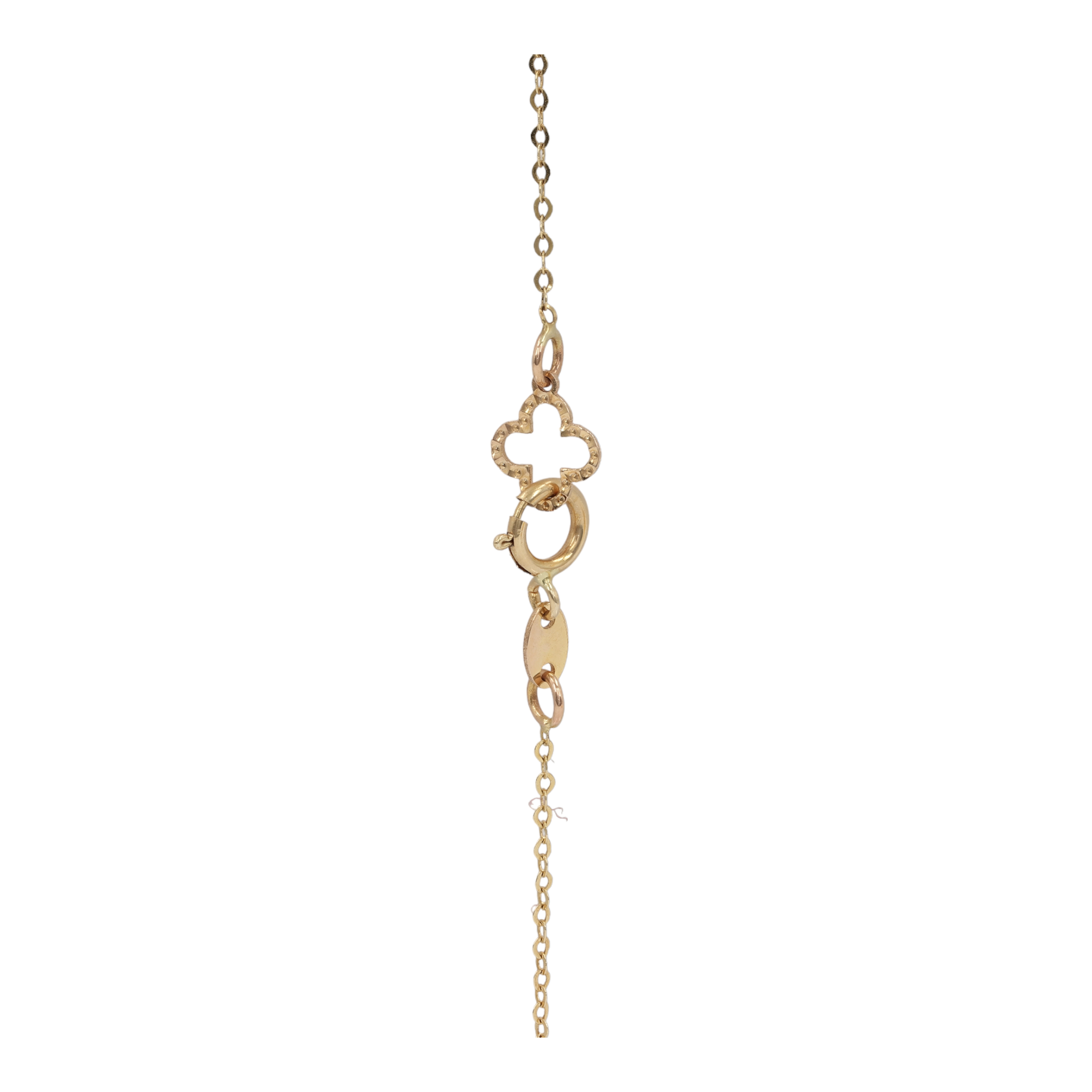 Realce su estilo con este exquisito collar de cuatrifolio de nácar de oro amarillo de 14 k, diseñado para darle un toque de sofisticación sin esfuerzo. La cadena de 18 pulgadas, delicadamente elaborada con un delgado ancho de 1,1 mm, presenta un encantador colgante que mide 13x13 mm. La cadena, asegurada con un cierre de anillo de resorte, presenta un elegante eslabón estilo cable. El colgante, adornado con lustroso nácar, crea una fascinante interacción de luz y color contra el fondo dorado. Con un peso de tan solo 1,7 g, este collar es un epítome de elegancia, adecuado para cualquier ocasión que justifique una declaración refinada.