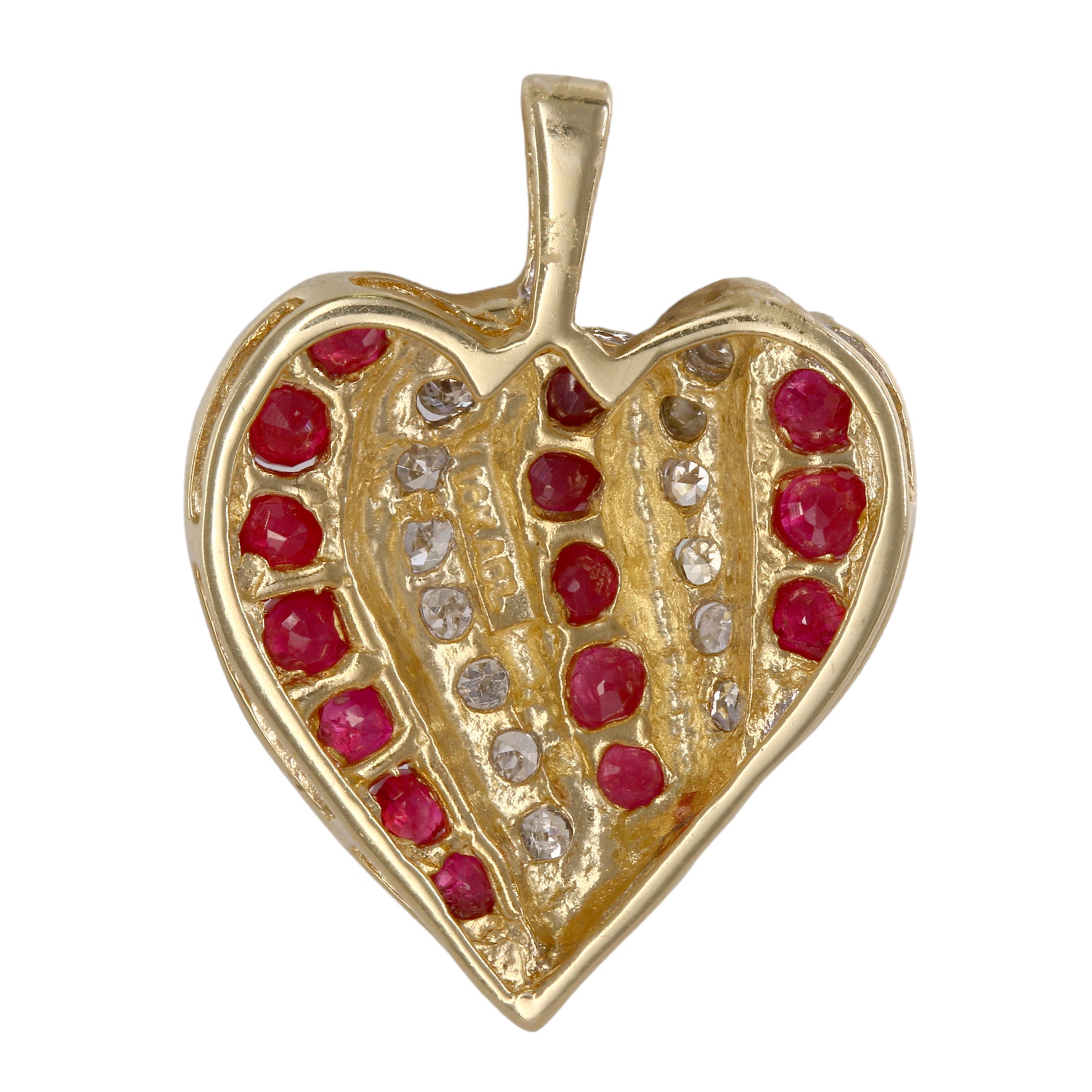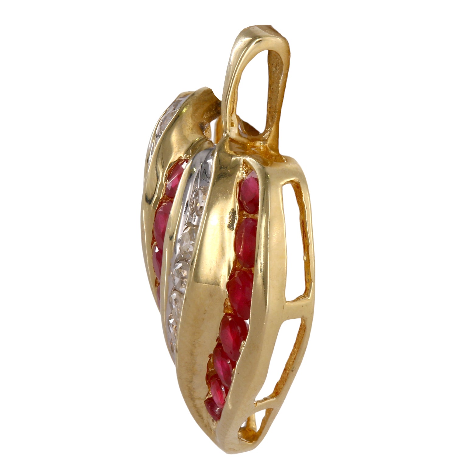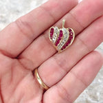 10k solid gold pendant in the shape of a heart, adorned with radiant ruby gems and natural diamonds. It is a timeless and elegant accessory for any occasion and a perfect gift for a loved one.