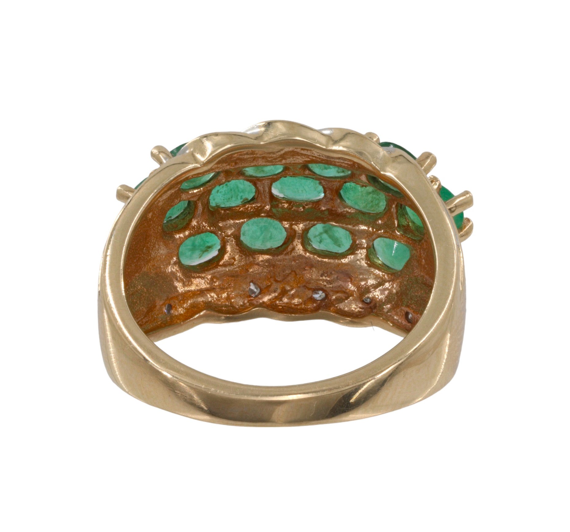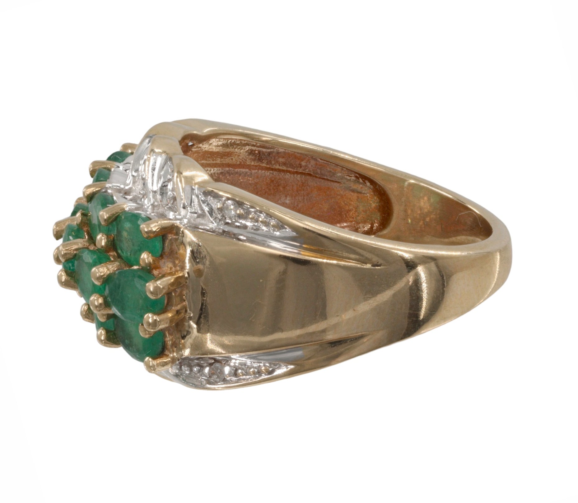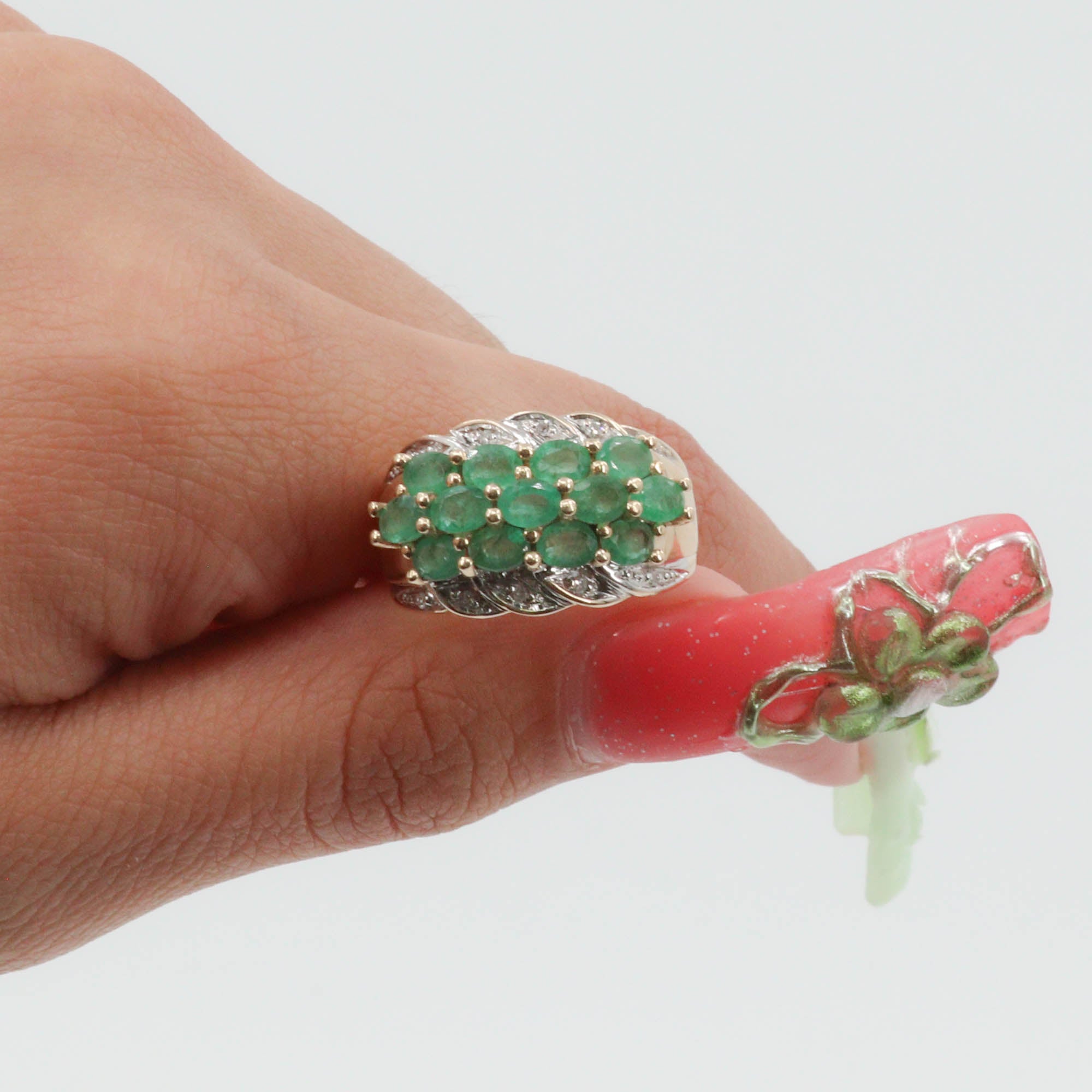 Crafted in 10k two-tone gold, this captivating cocktail ring exudes elegance and sophistication. The shank size measures 2.5mm, leading to a head size of 13.25mm adorned with 13 oval-cut emeralds, each estimated at 0.14ct. Surrounding these vibrant gemstones are 10 accent round brilliant cut diamonds, each weighing 0.01ct. With a total carat weight of 0.10ctw and an estimated total stone weight of 1.92ctw, this ring is a stunning addition to any jewelry collection. Weighing 5.6g, it is both luxurious and versatile.