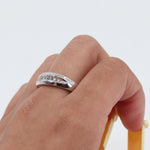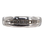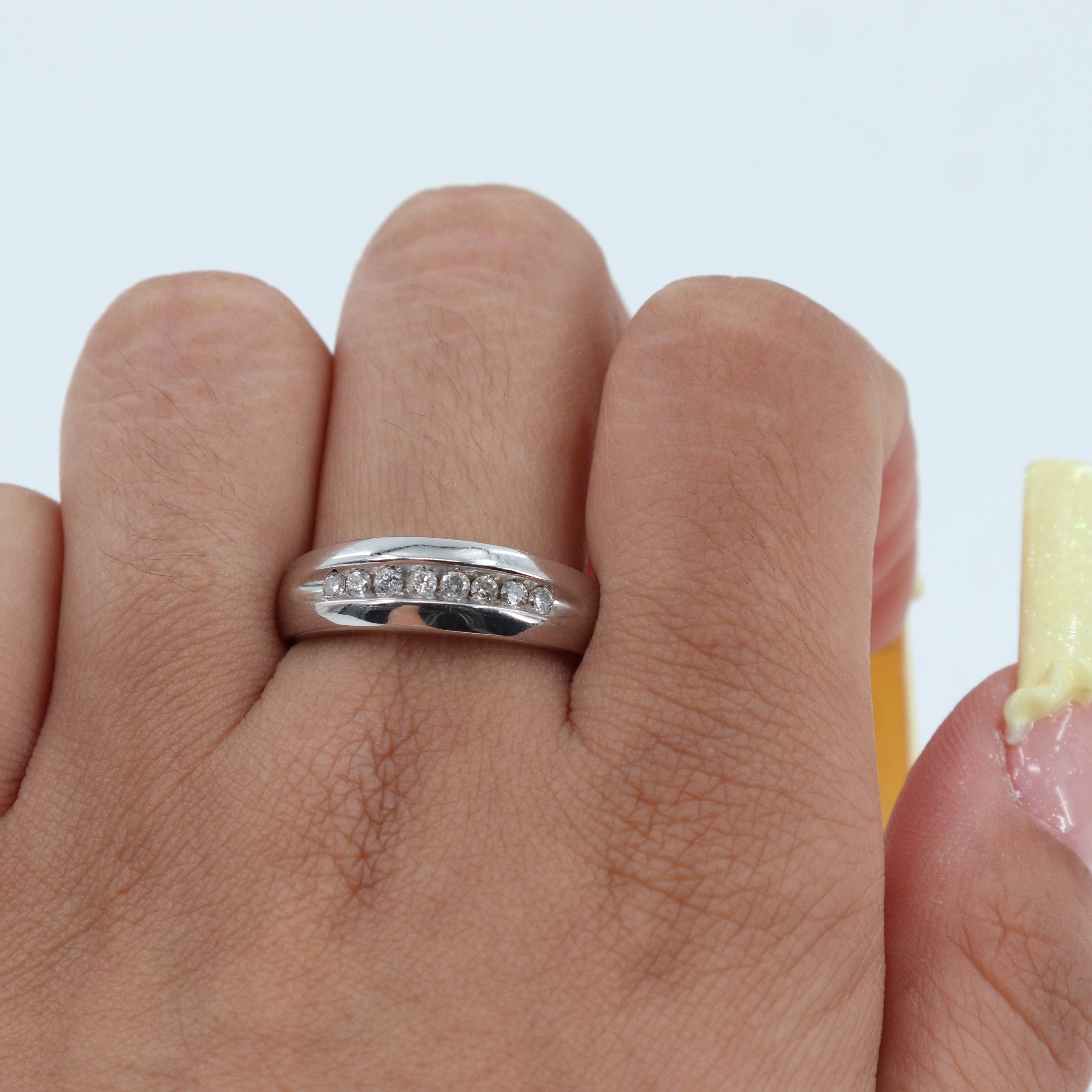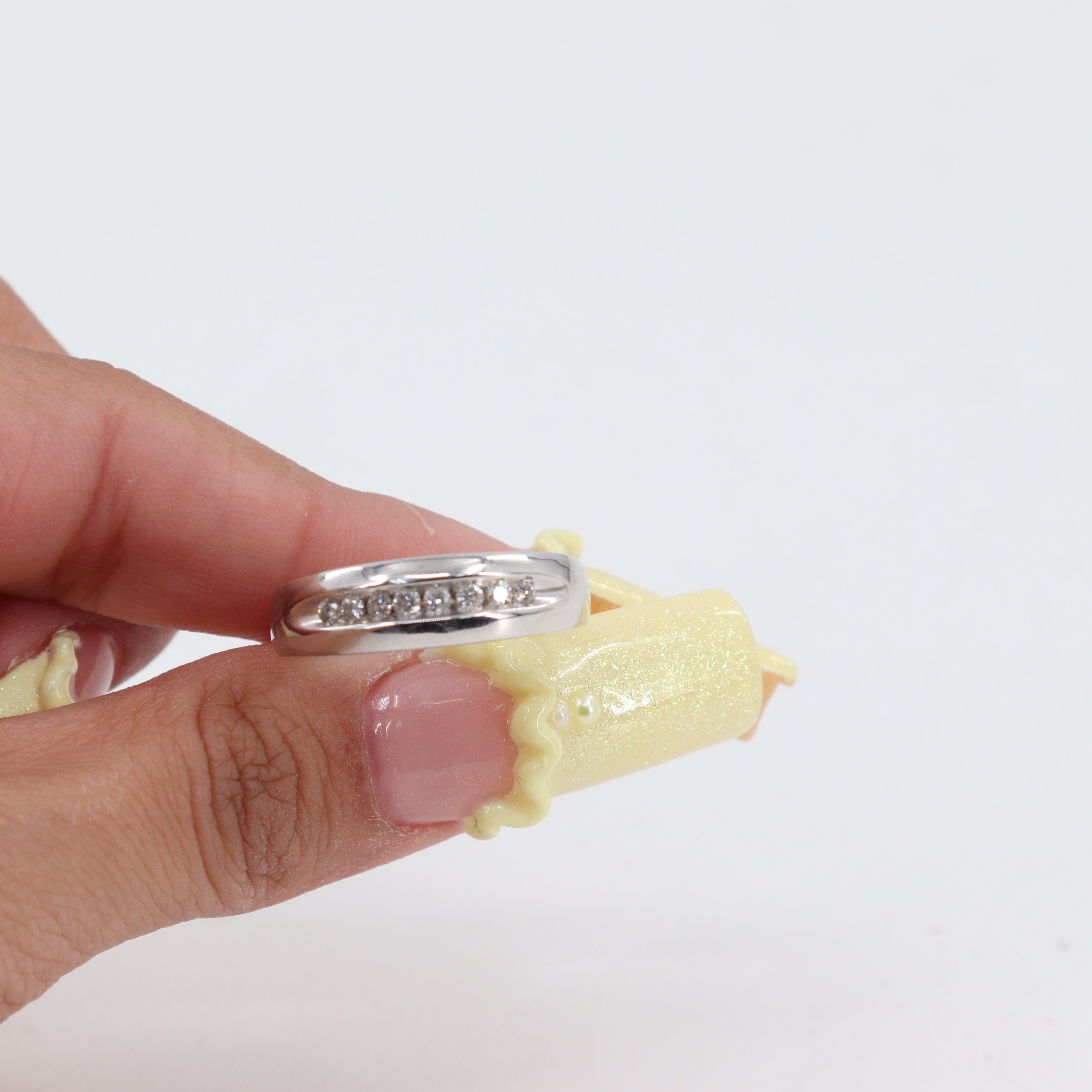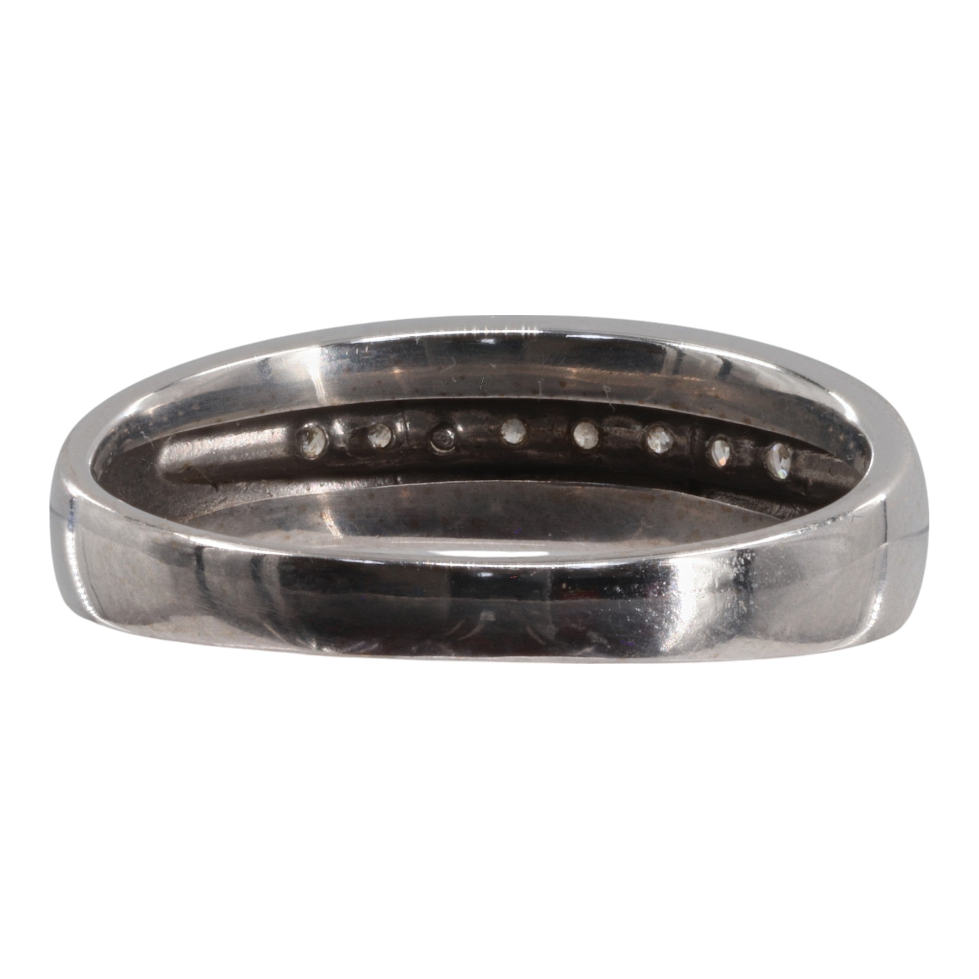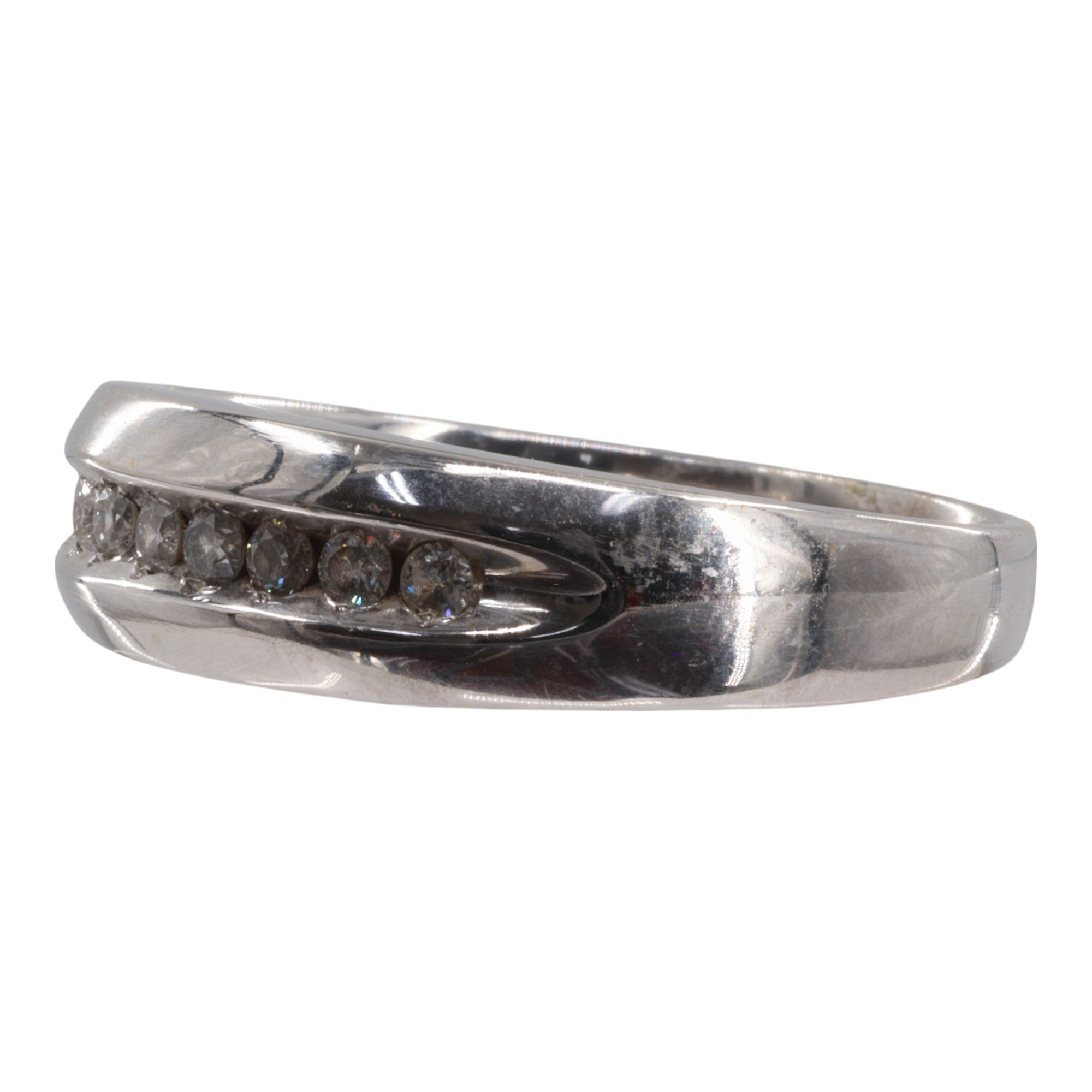 This sophisticated 10k white gold band features a classic channel setting, showcasing eight sparkling round brilliant cut diamonds. Each diamond is estimated at 0.025 carats, contributing to a total carat weight of approximately 0.20 carats. The diamonds, with I2 clarity and G-H color, offer a radiant sparkle. With a 2.8mm shank and a 6.7mm head, this ring is sized at 10.5 and weighs 3.3 grams, making it a timeless and elegant choice.