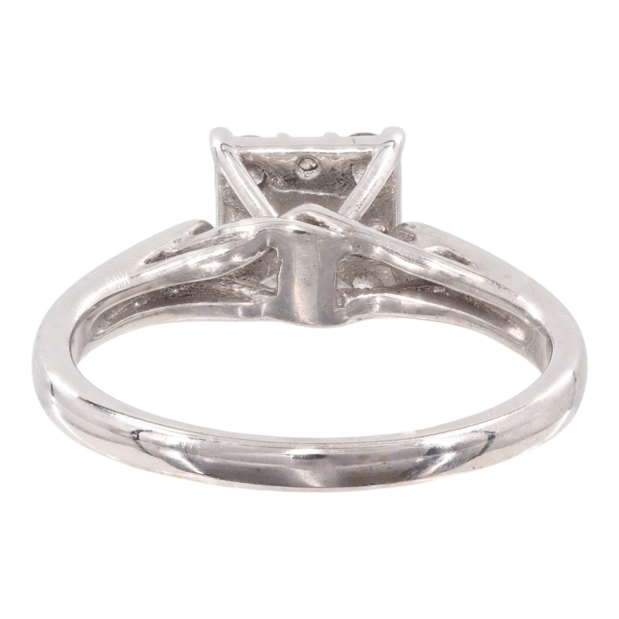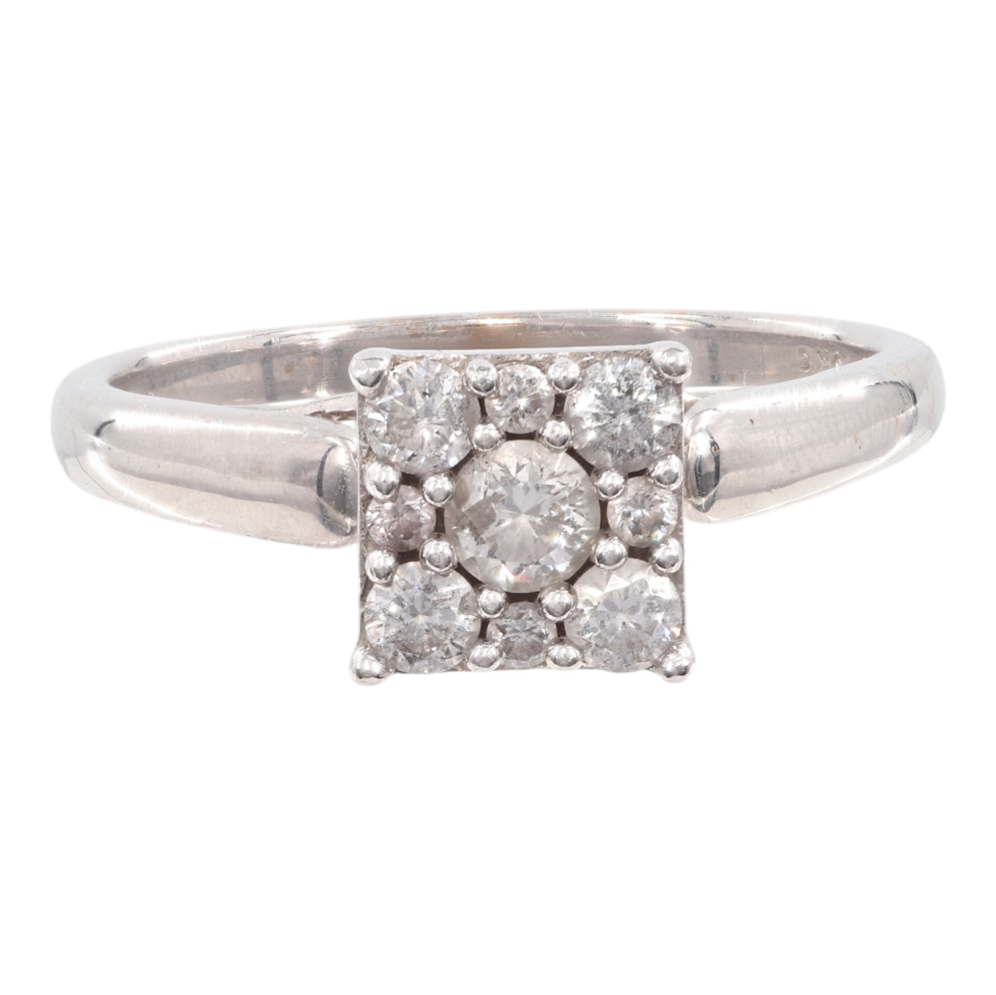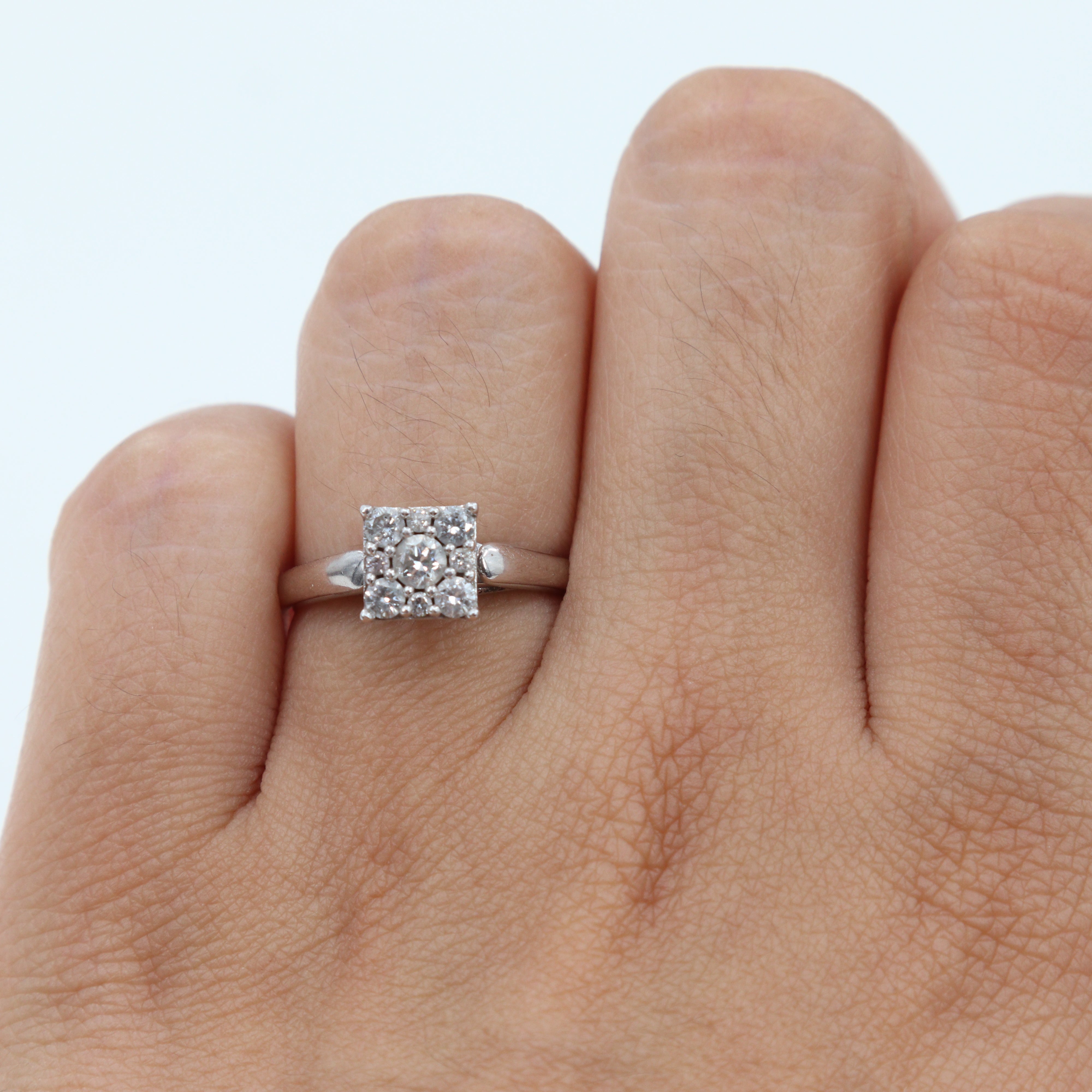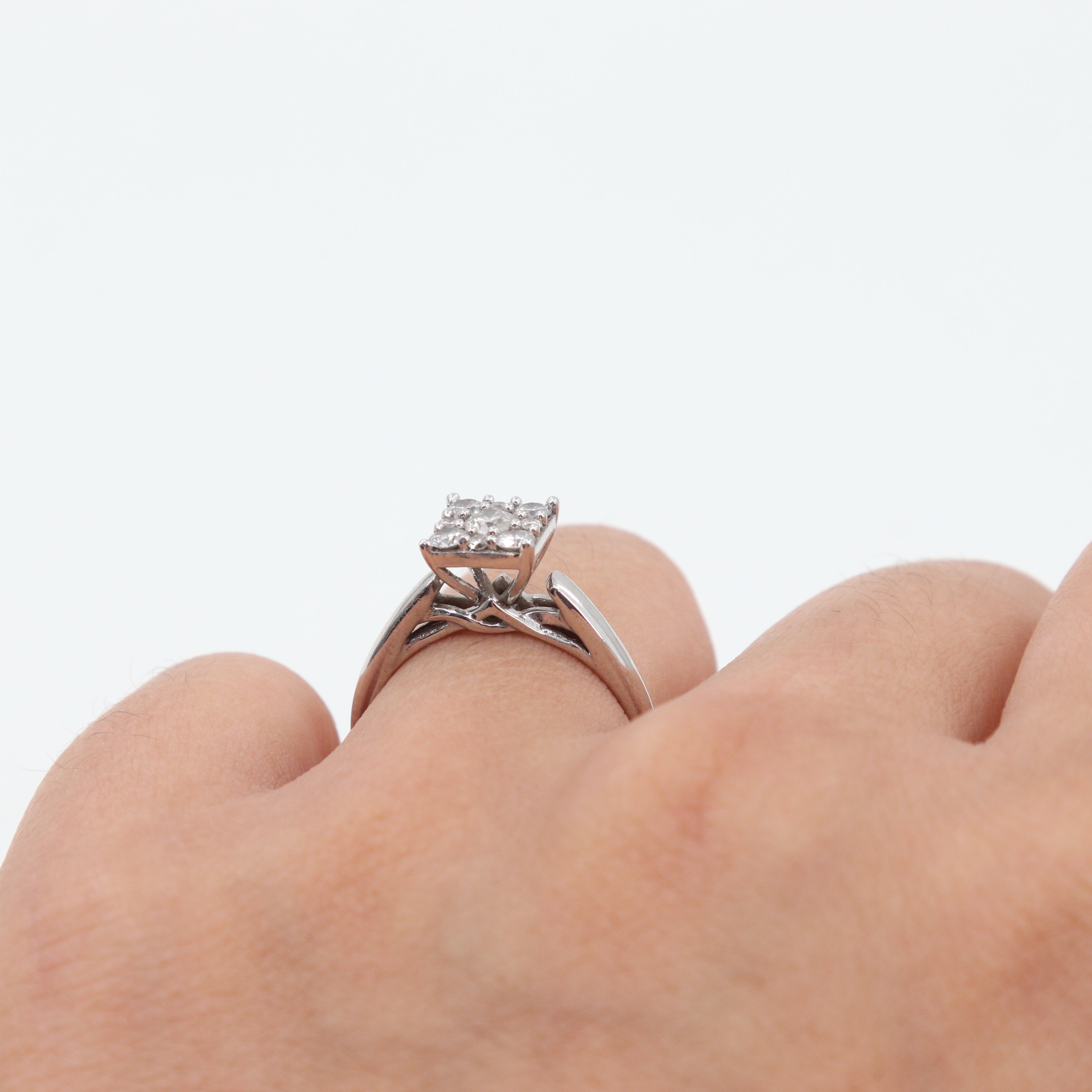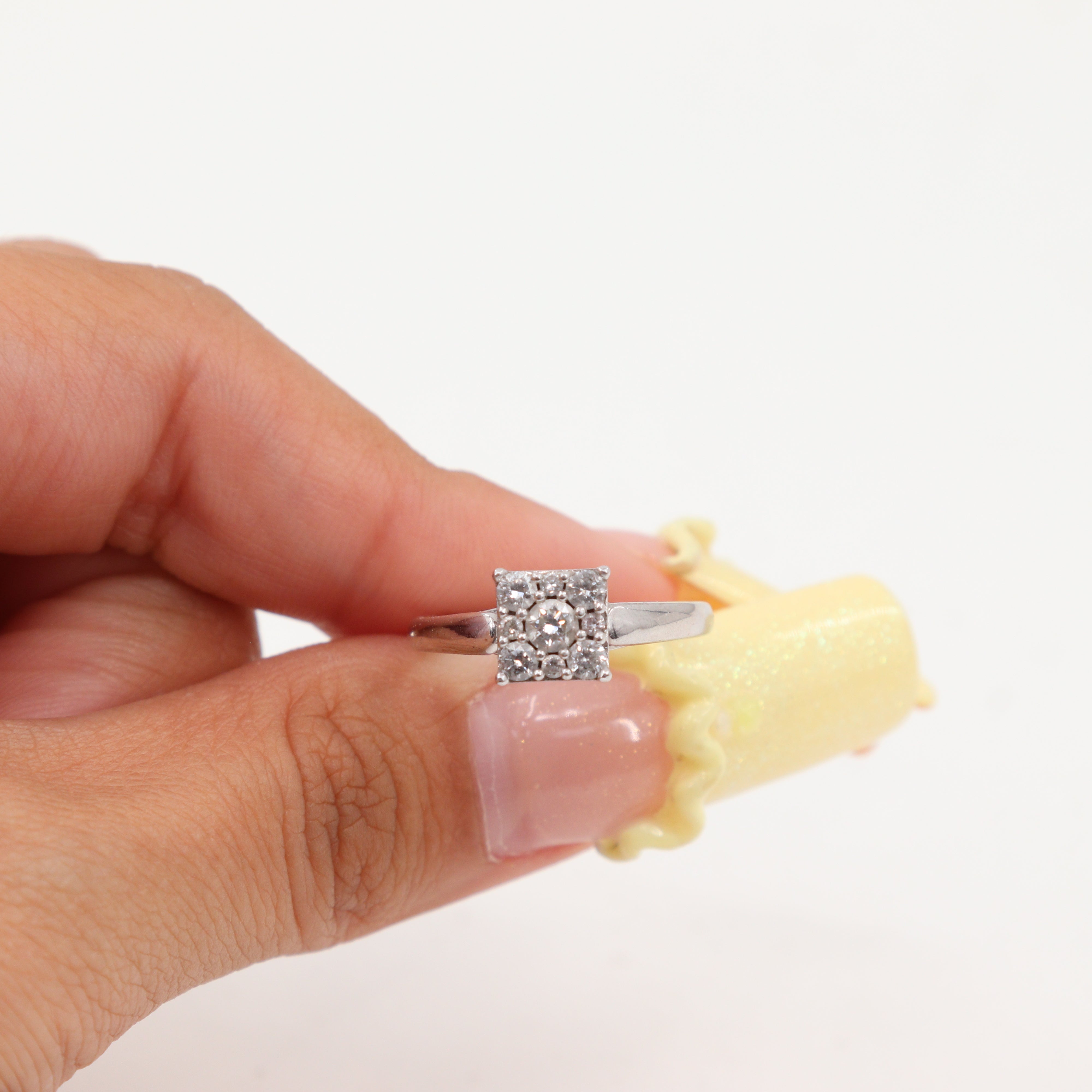 This dazzling 10k white gold cocktail ring showcases a captivating cluster of diamonds, featuring a prominent 0.10 carat center round brilliant cut diamond surrounded by four 0.01 carat and four 0.005 carat round brilliant cut diamonds, creating a total diamond weight of approximately 0.34 carats with I1 clarity and I-J color, all set on a 1.9mm shank with a 7.35mm head, sized at 6.5 and weighing 3.3 grams, making it a truly glamorous statement piece.