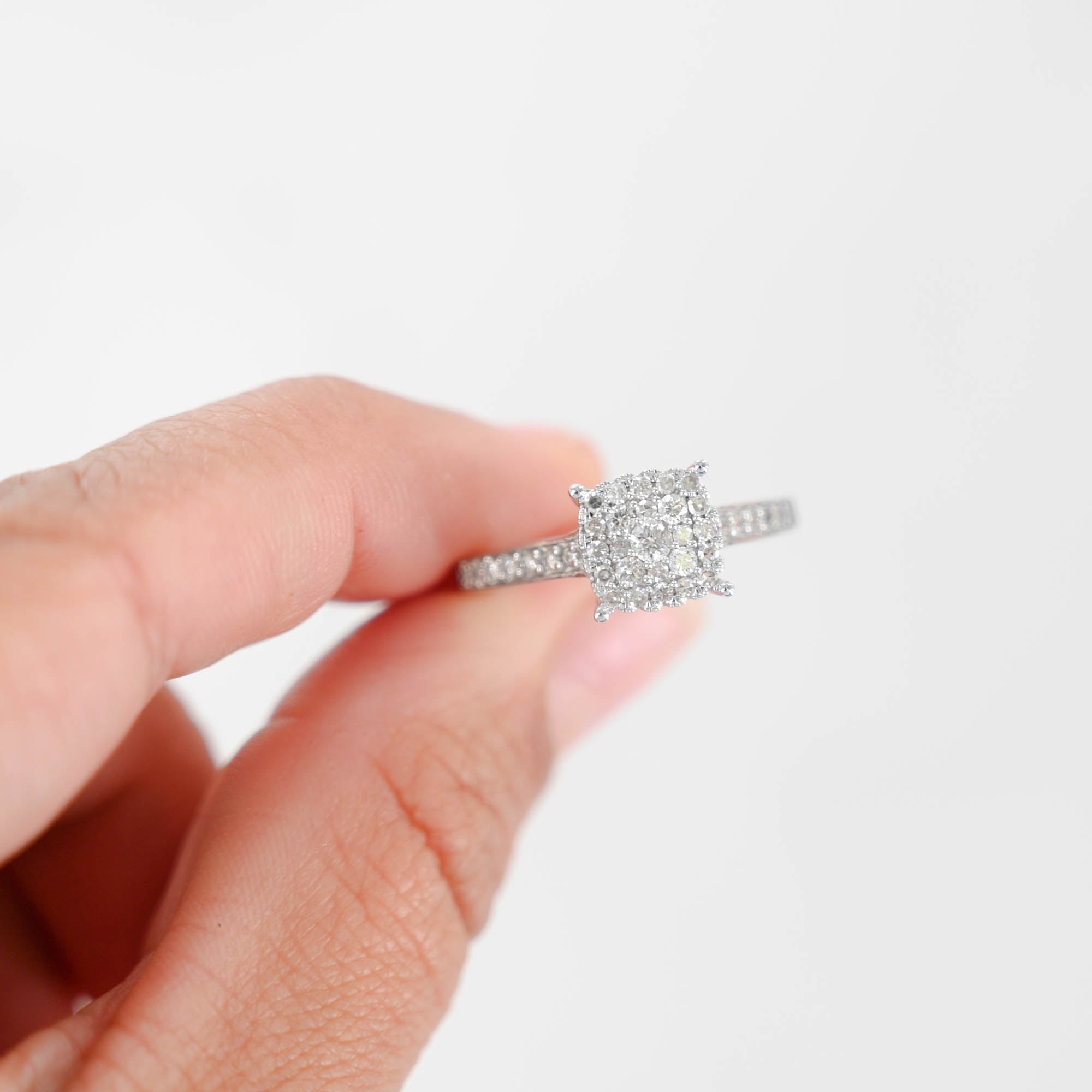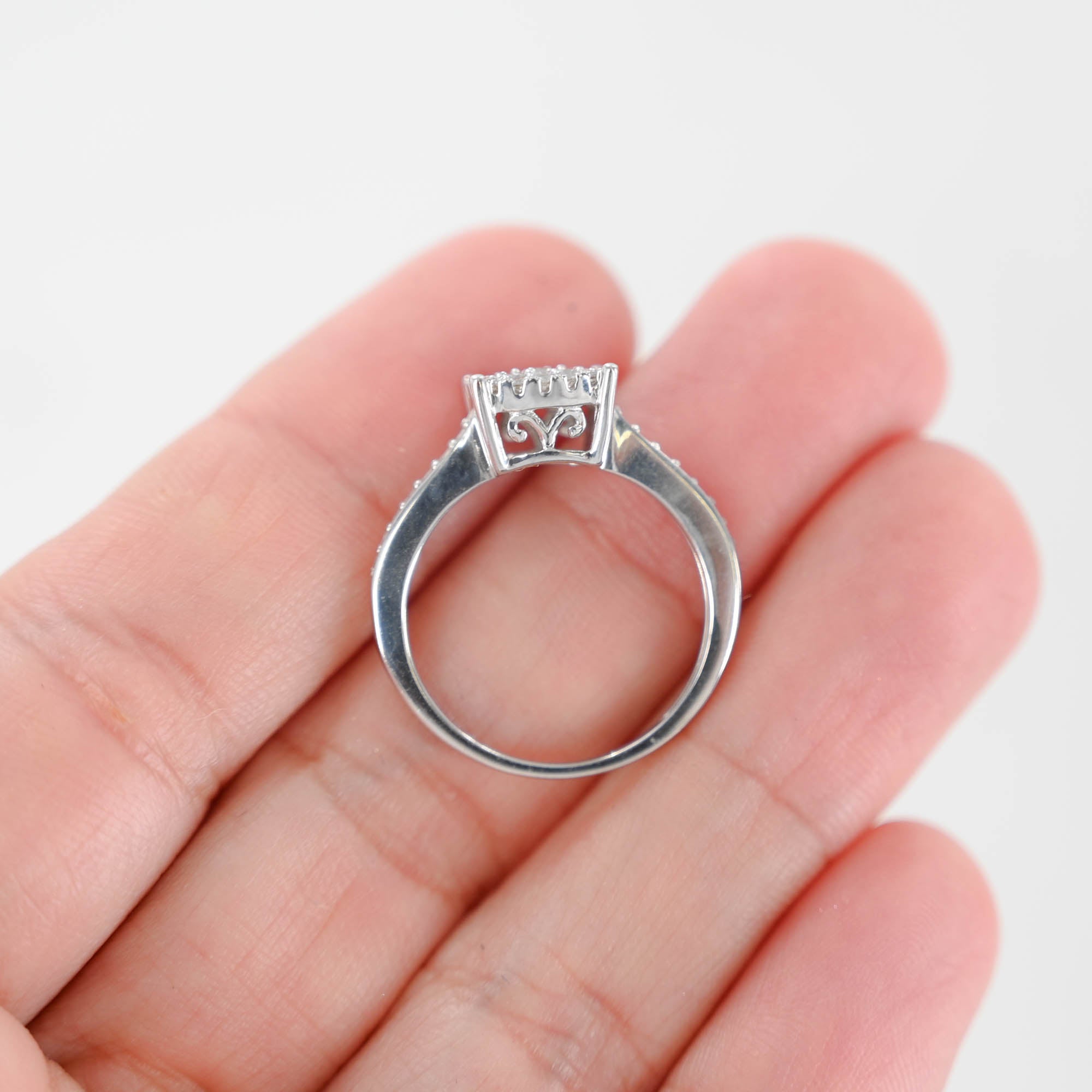 This elegant 10K White Gold Diamond Cluster Engagement Ring features a dazzling 0.39 carat total weight of sparkling diamonds, beautifully arranged in a classic cluster design. The timeless white gold setting enhances the brilliance of the diamonds, making it a perfect choice for a meaningful proposal or a special celebration.