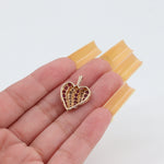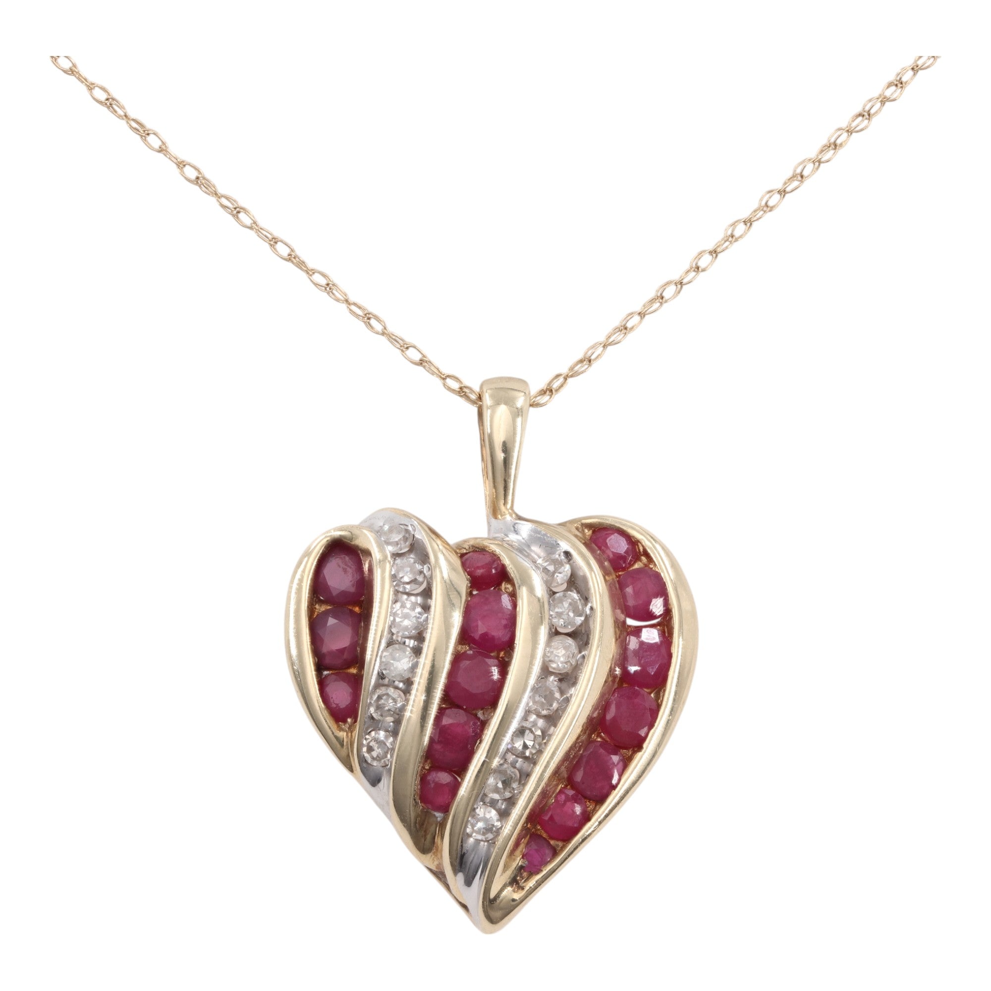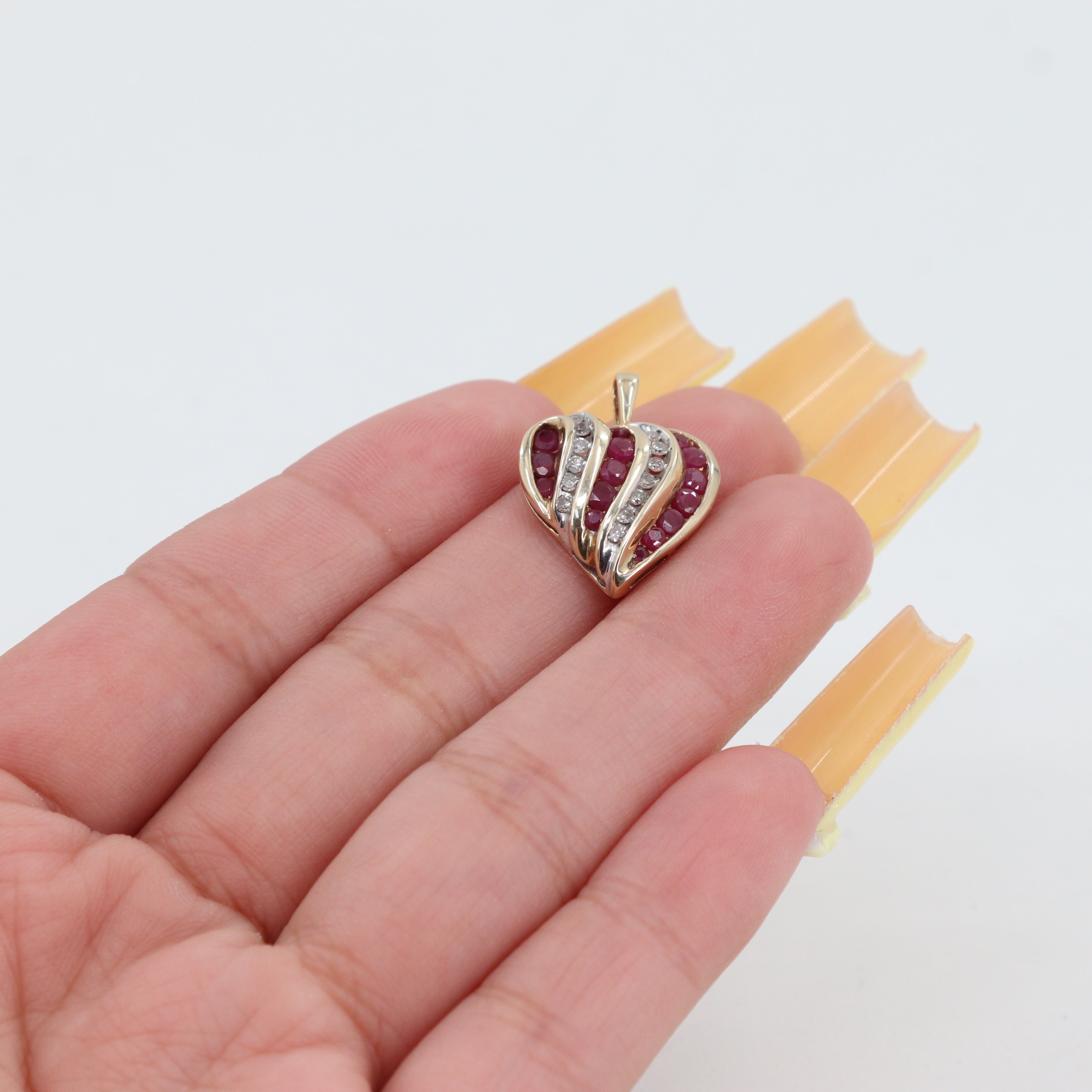 This lovely 10k yellow gold heart pendant is a charming blend of vibrant rubies and sparkling diamonds. The heart design is beautifully crafted with a channel setting, showcasing 15 brilliant round cut rubies, each approximately 0.03 carats, for a total ruby weight of approximately 0.45 carats. Adding to the brilliance are 13 round brilliant cut diamonds, each averaging 0.01 carats, with I2 clarity and H-J color, totaling 0.13 carats. Measuring 23mm in length and 16.9mm in width, this delightful pendant weighs 2.6 grams and is a perfect symbol of love and affection.