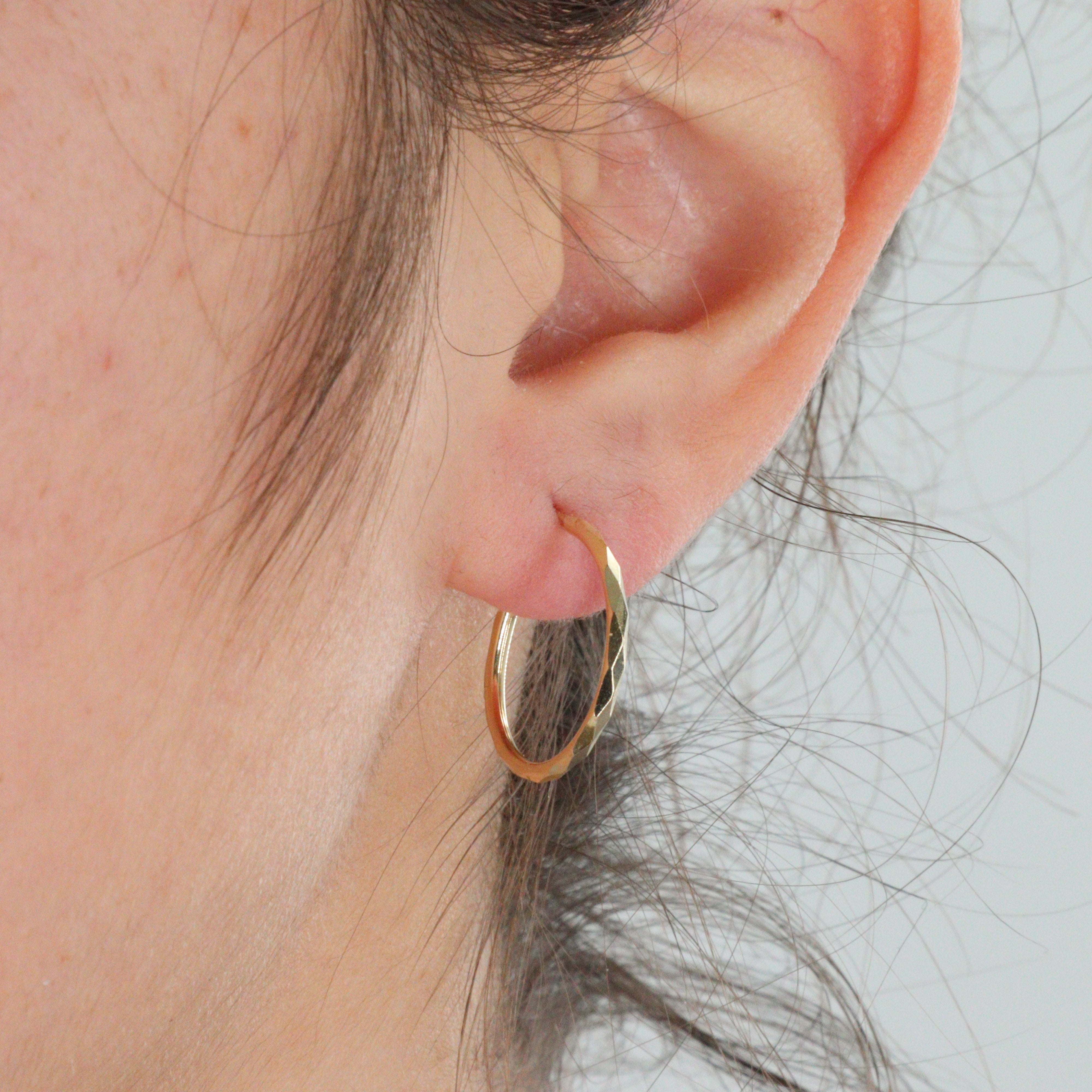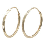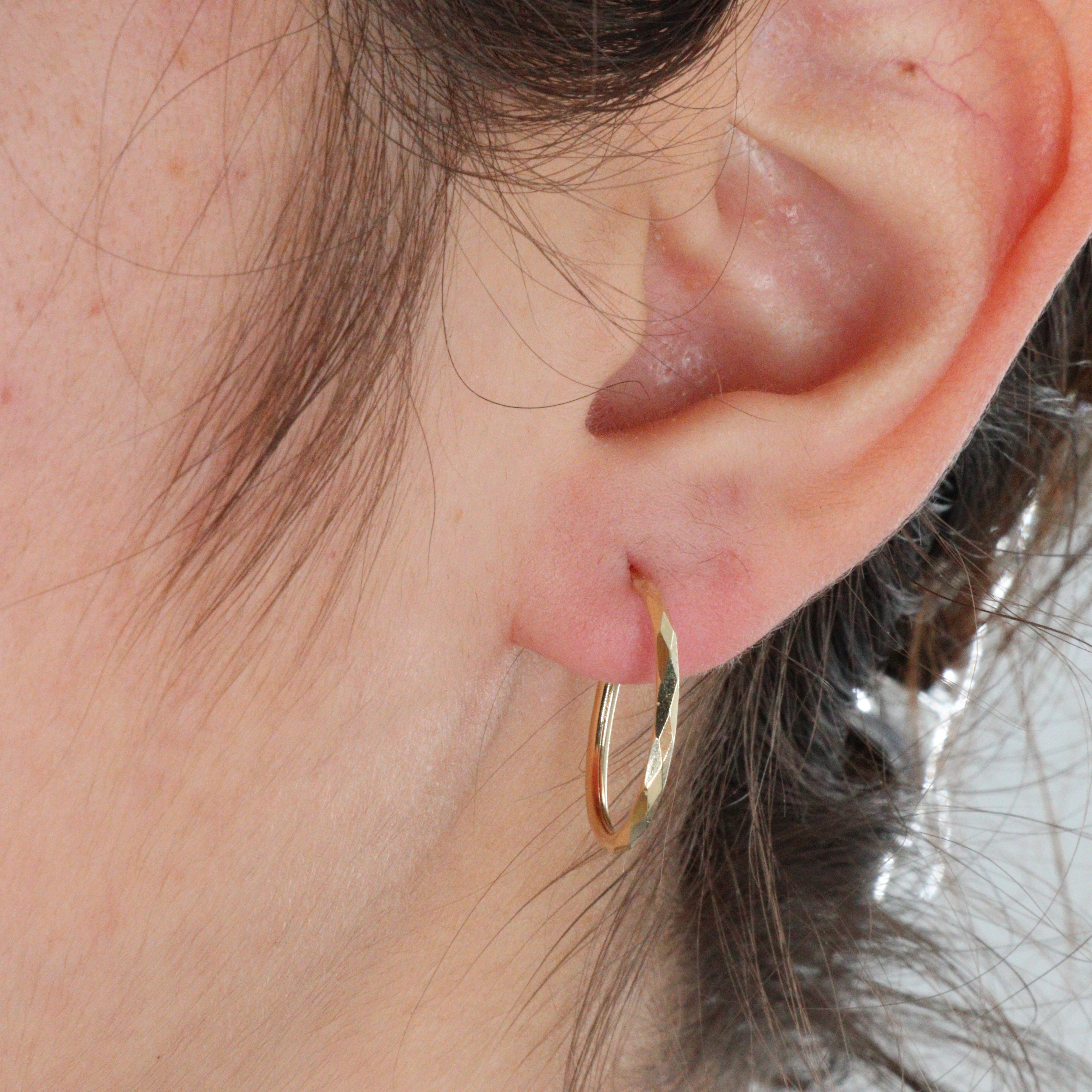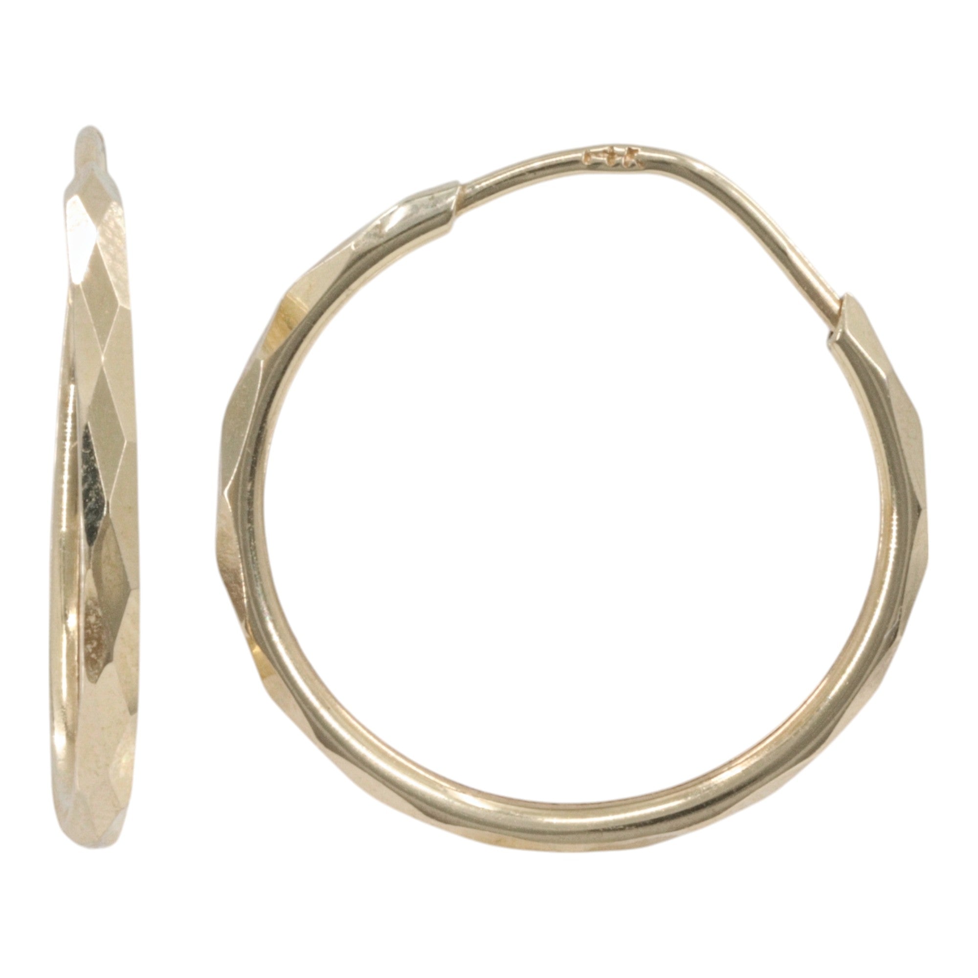 These 14k Yellow Gold Faceted Hoop Earrings offer a touch of sophistication with a subtle sparkle. Measuring 18.25mm in diameter and 1.5mm in width, these lightweight hoops (1.1g) feature a classic spring hoop closure for easy wear. Crafted in radiant 14k yellow gold, their faceted design adds dimension and charm, perfect for everyday elegance.