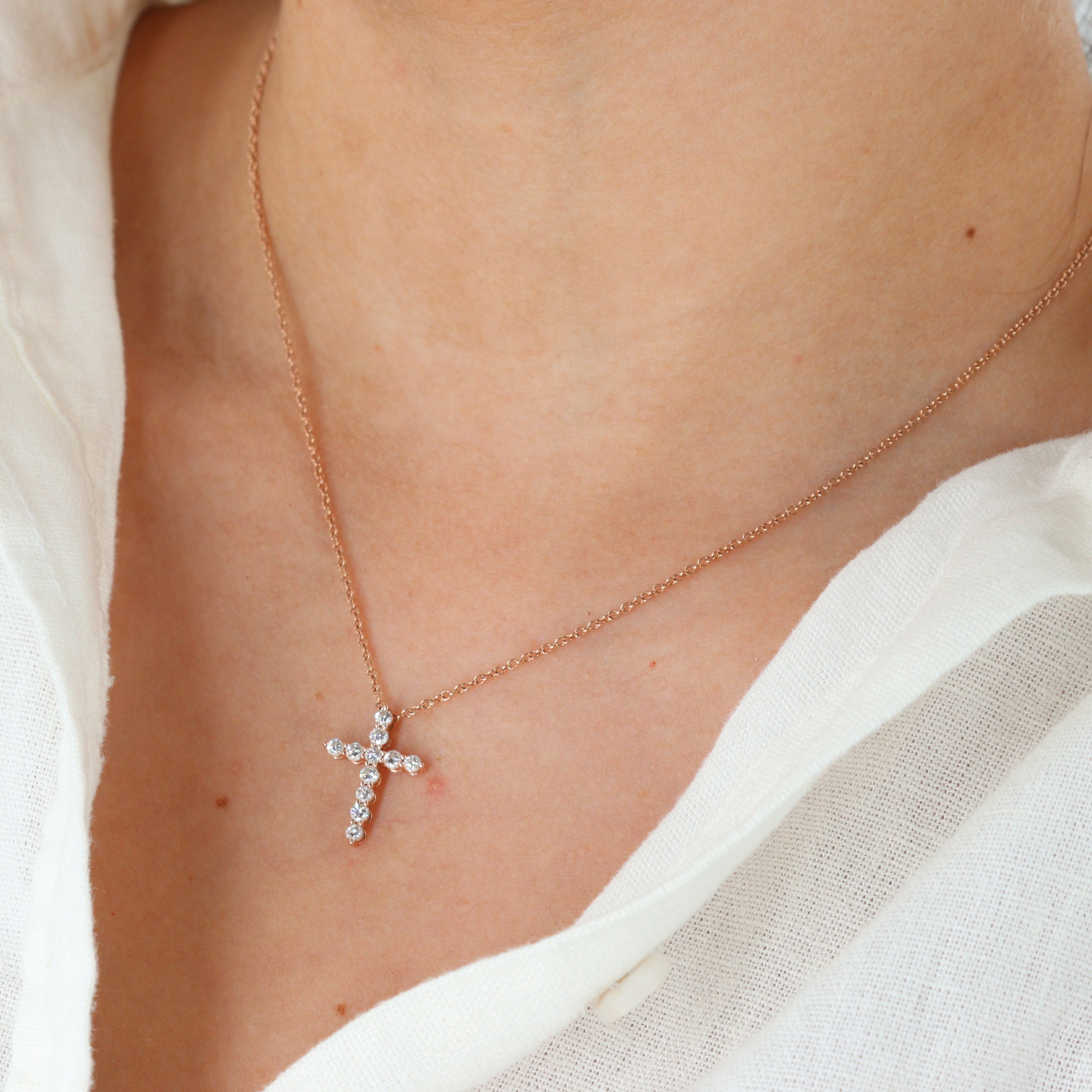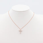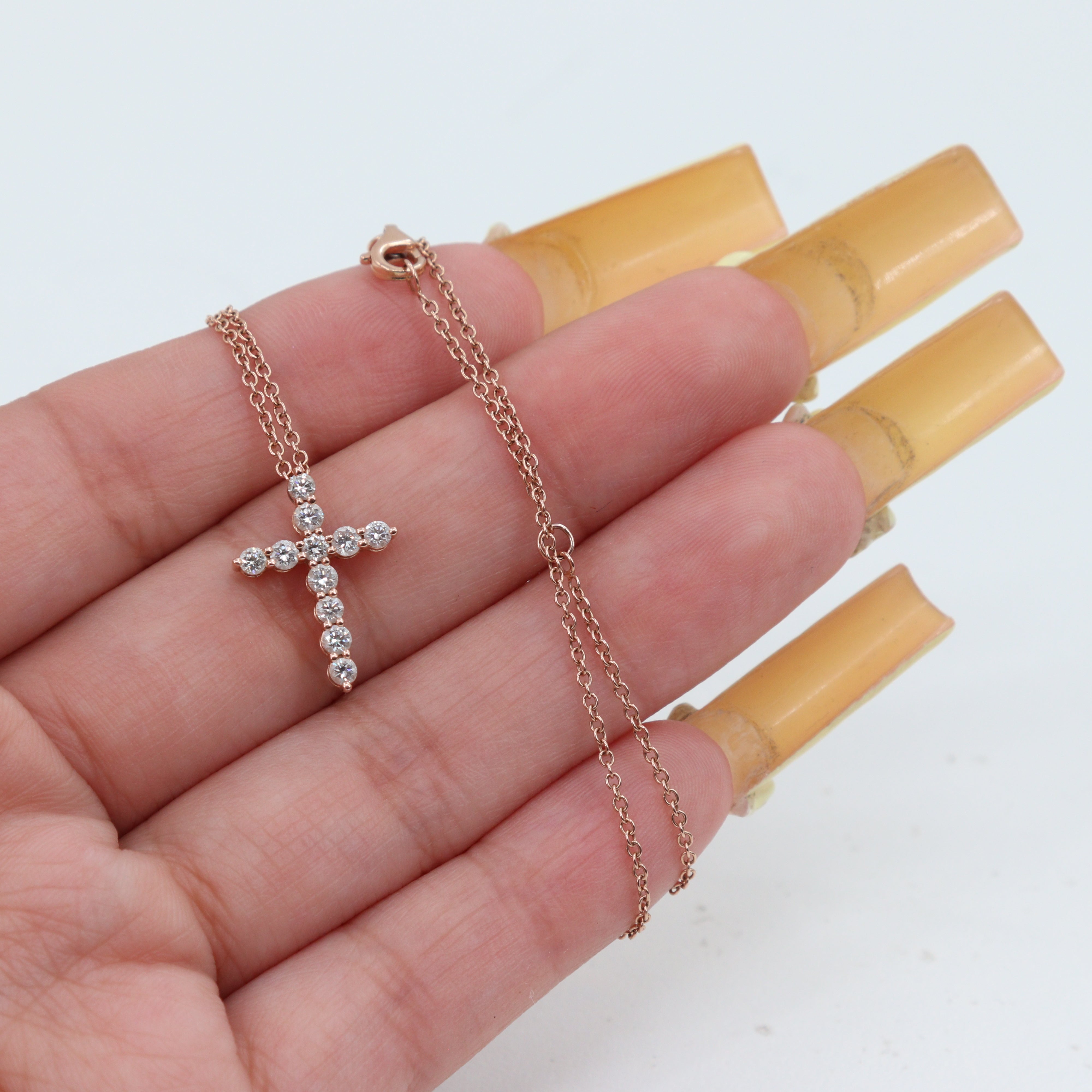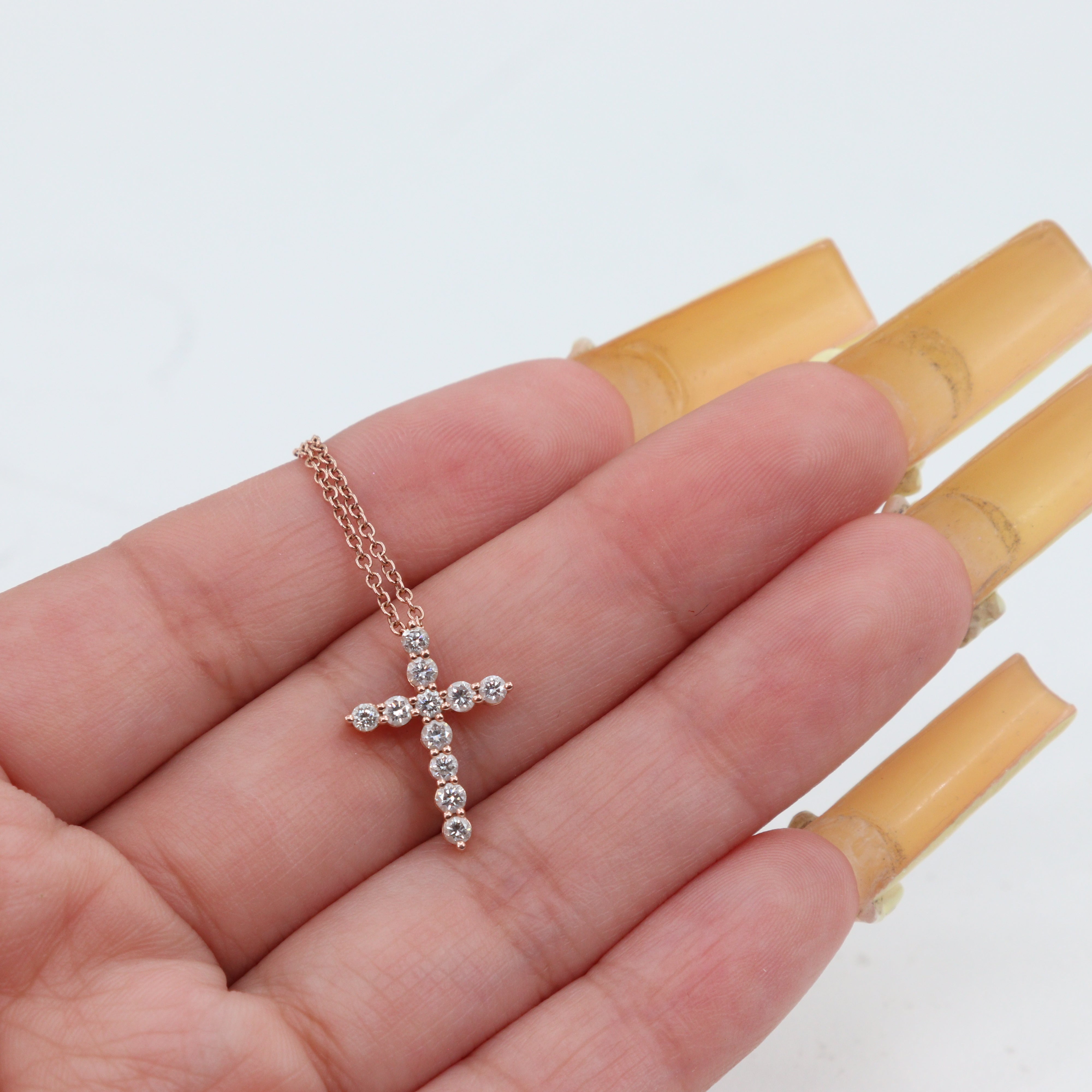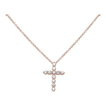 This delicate and adjustable 14k rose gold chain-link necklace offers versatile wear from 15 to 16 inches. Suspended from the .75mm wide chain is an elegant cross pendant measuring 18.2mm in length and 13.3mm in width, adorned with a total of 11 sparkling round brilliant cut diamonds. Five larger diamonds are estimated at 0.04 carats each, while six smaller diamonds are estimated at 0.03 carats each, bringing the total carat weight to approximately 0.38 carats. The diamonds, with SI2-I1 clarity and I-J color, add a touch of subtle brilliance. Secured with a lobster clasp and weighing 2.6 grams, this necklace is a beautiful symbol of faith and style.
