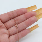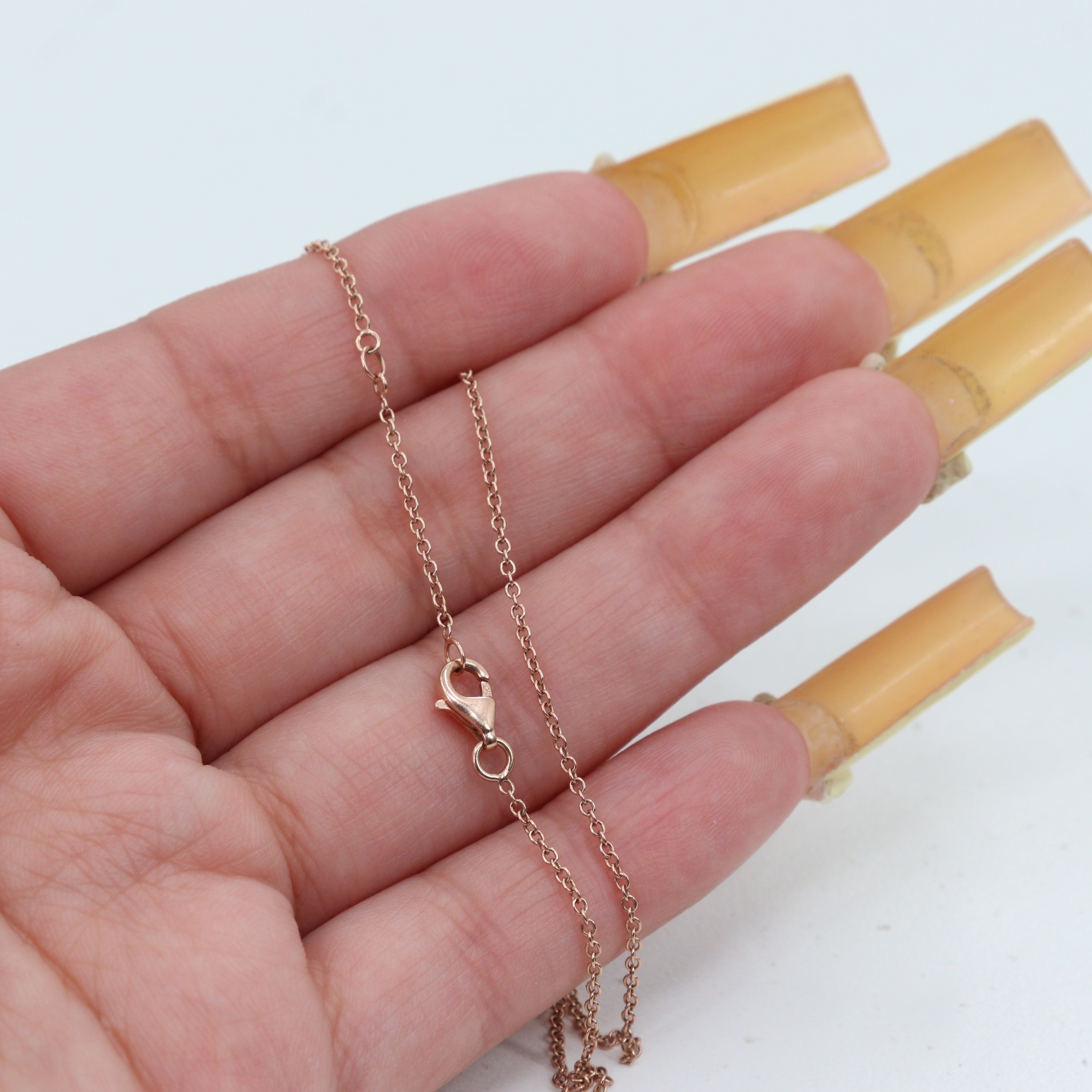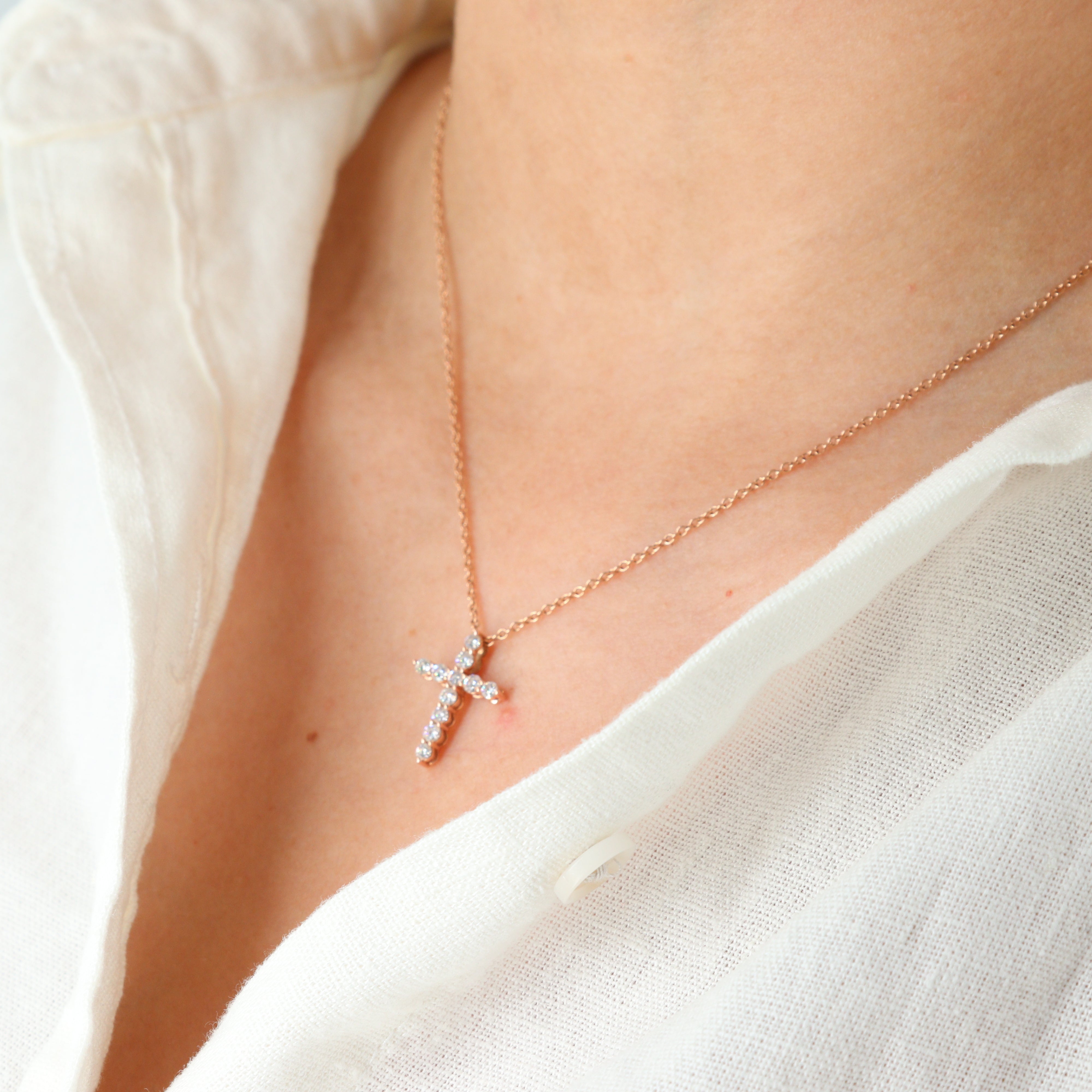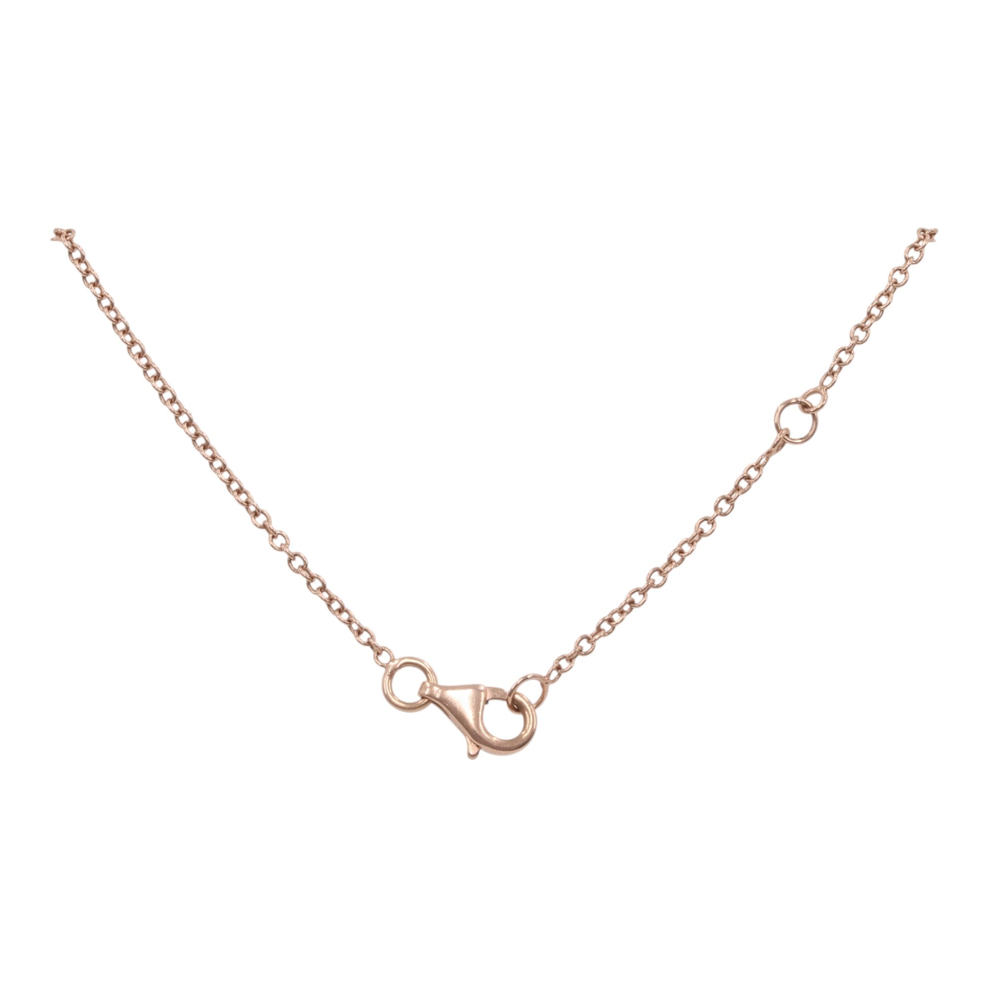 This delicate and adjustable 14k rose gold chain-link necklace offers versatile wear from 15 to 16 inches. Suspended from the .75mm wide chain is an elegant cross pendant measuring 18.2mm in length and 13.3mm in width, adorned with a total of 11 sparkling round brilliant cut diamonds. Five larger diamonds are estimated at 0.04 carats each, while six smaller diamonds are estimated at 0.03 carats each, bringing the total carat weight to approximately 0.38 carats. The diamonds, with SI2-I1 clarity and I-J color, add a touch of subtle brilliance. Secured with a lobster clasp and weighing 2.6 grams, this necklace is a beautiful symbol of faith and style.