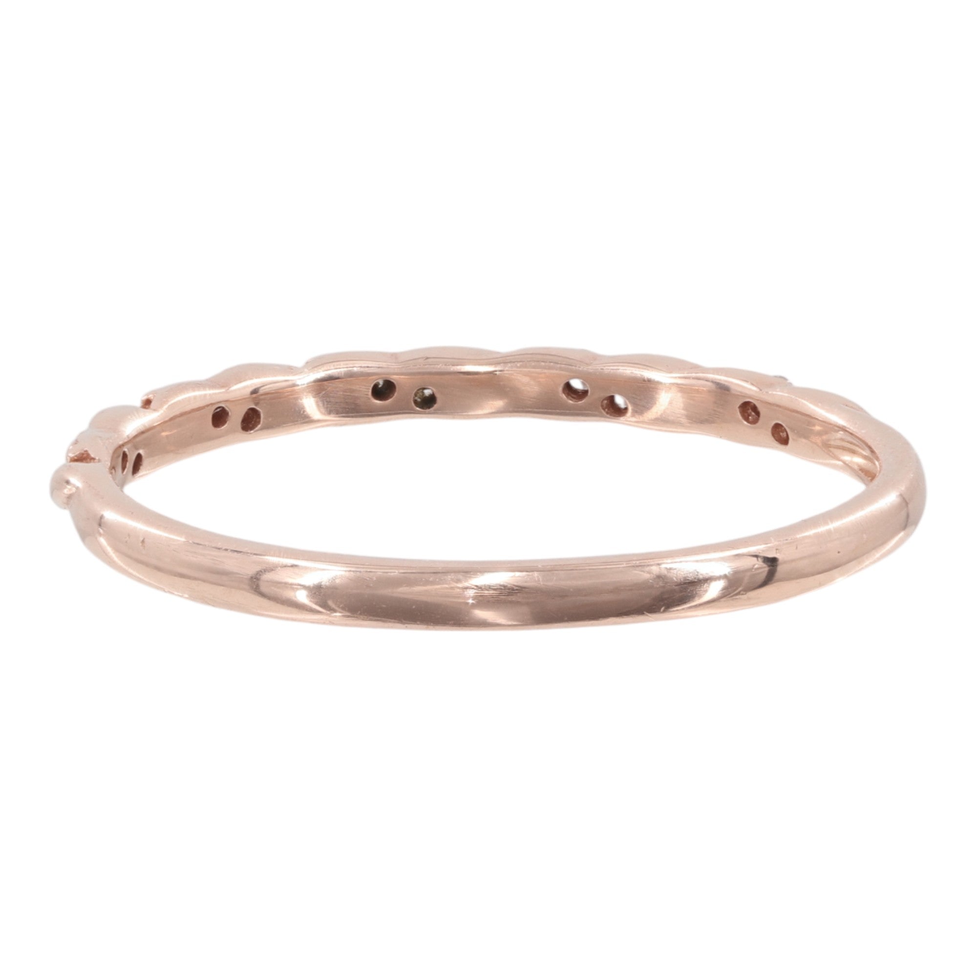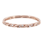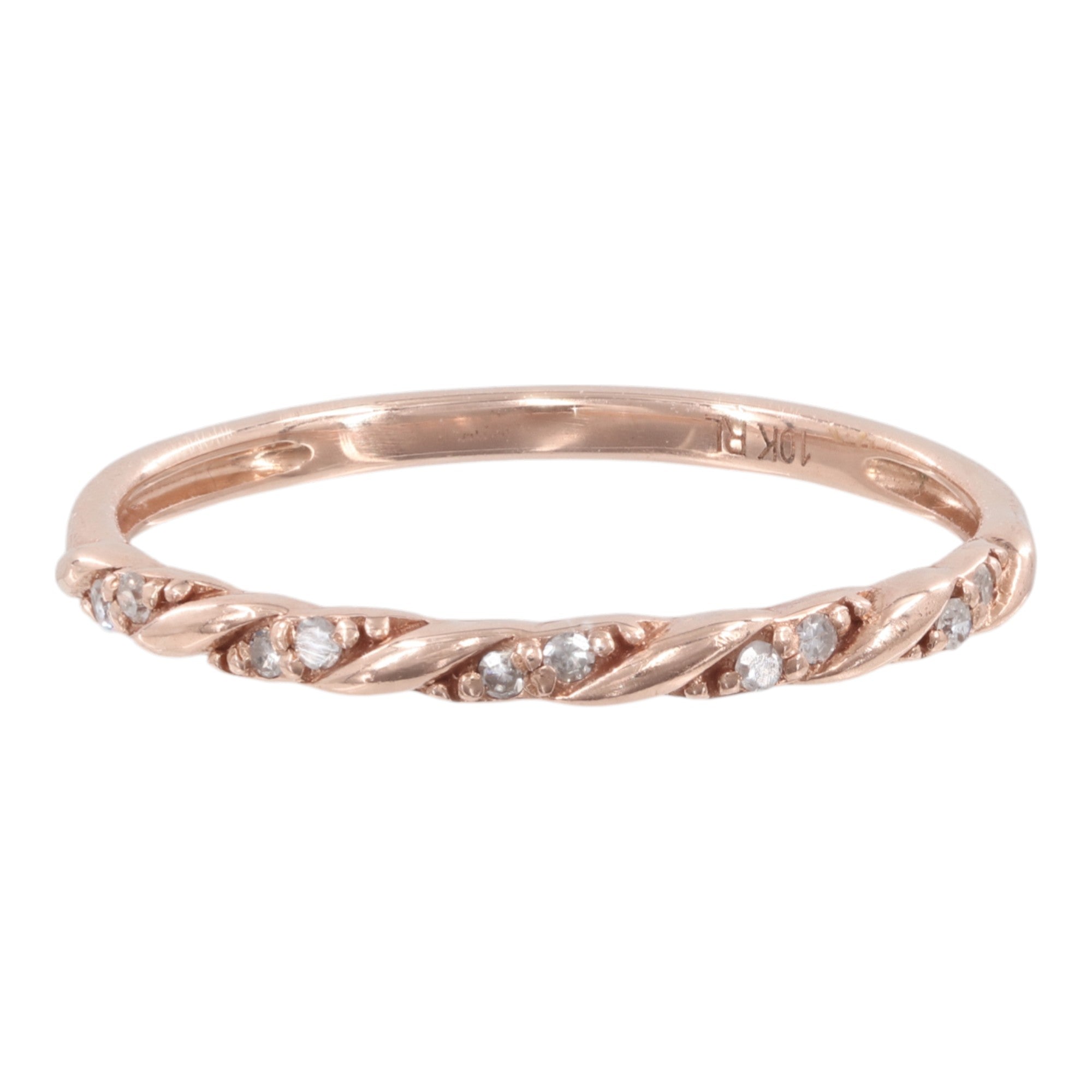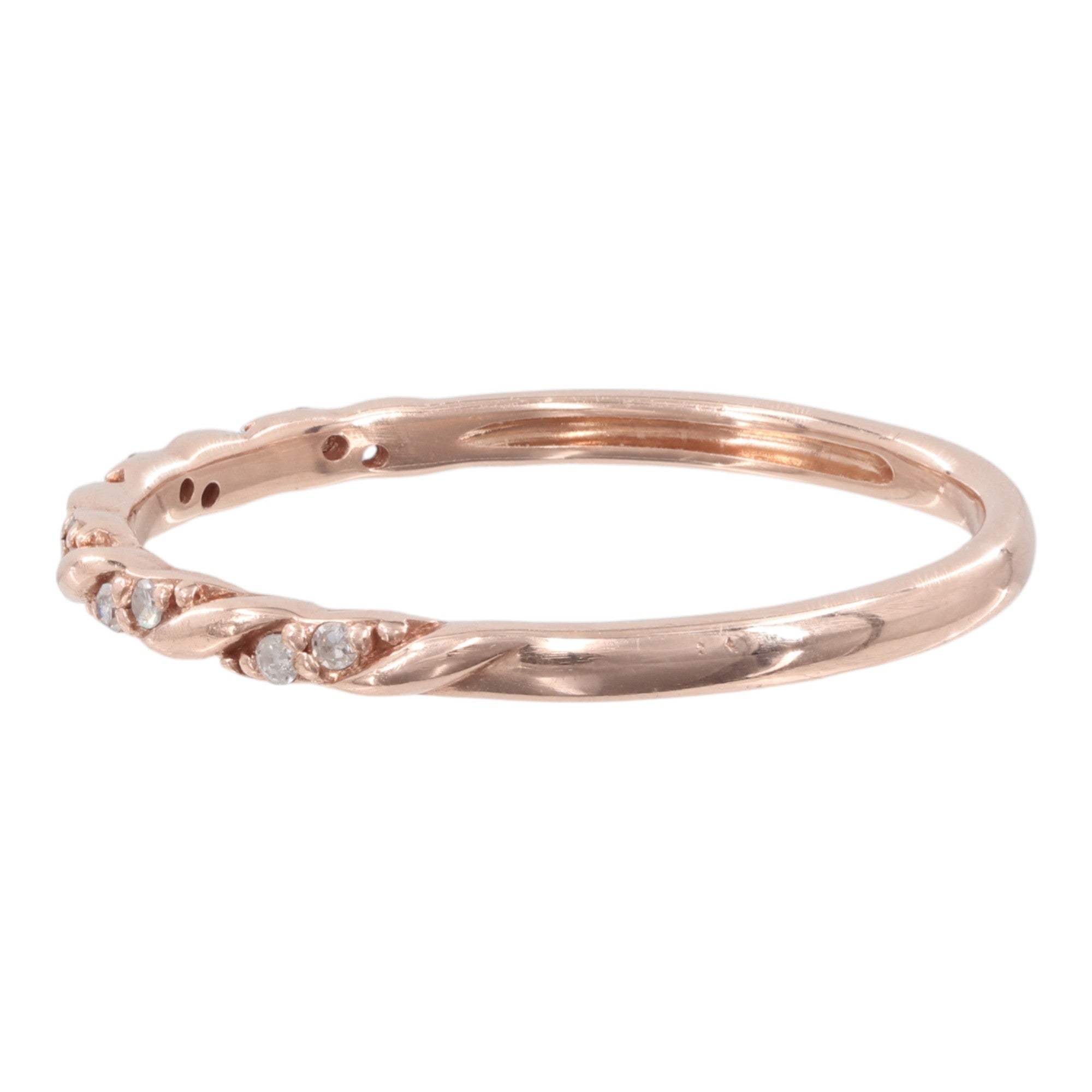 This exquisite 14k rose gold wedding ring set offers a coordinated and elegant look, featuring both an engagement ring and a matching band. The engagement ring showcases a captivating 0.13 carat princess cut diamond with I1 clarity and H-I color, set on a delicate 1.2mm shank with a 4.3mm head. The accompanying band, designed to complement the engagement ring, has a 1.6mm shank and a 1.7mm head. This beautiful set is further enhanced by 10 round brilliant cut accent diamonds, each estimated at 0.005 carats, with I2 clarity and I-J color, bringing the total carat weight for the set to approximately 0.18 carats. Sized at 7 and weighing a combined 3.1 grams, this set is a perfect symbol of enduring love.