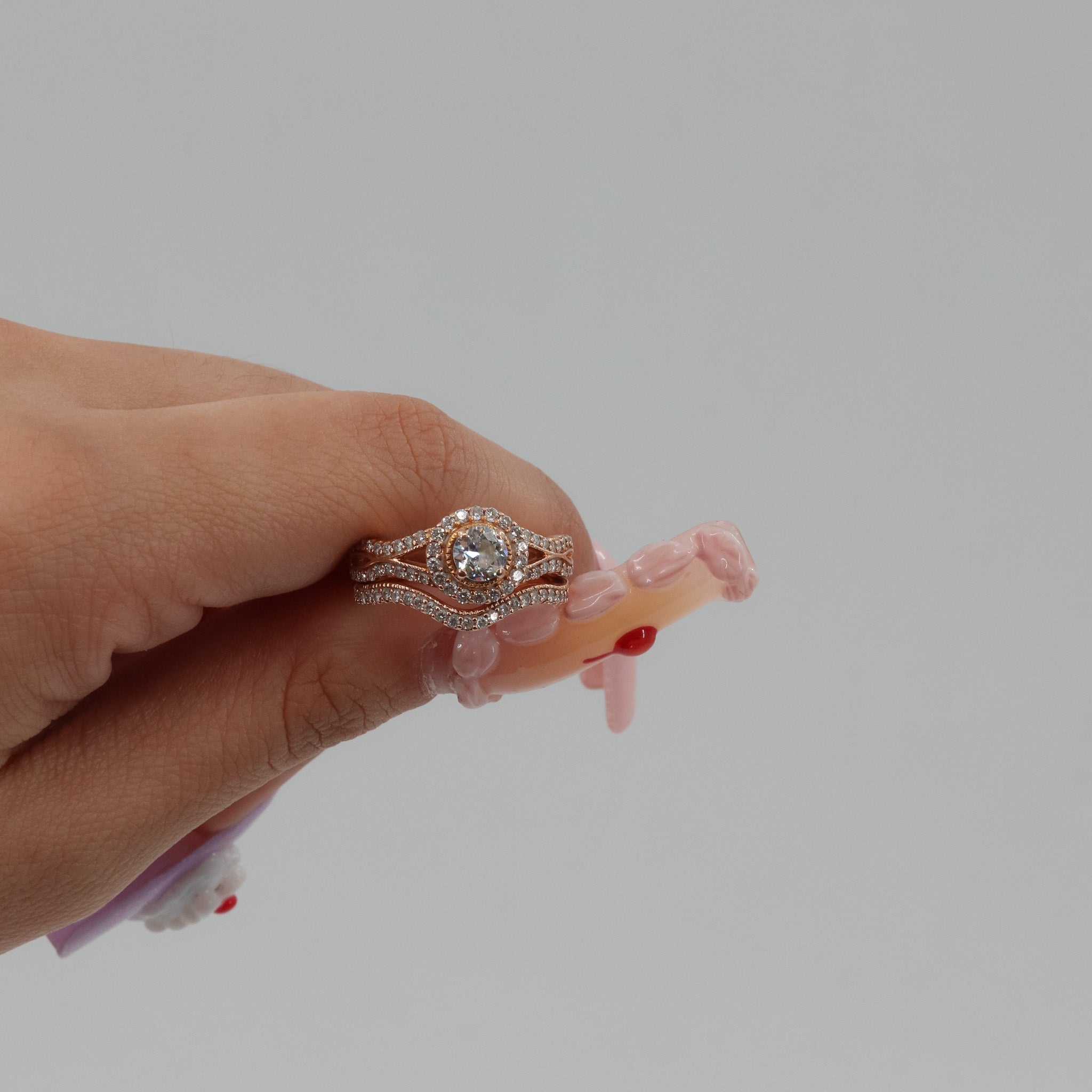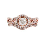 This wondrous set features a 0.50ct center stone, encompassed by a 0.27ctw halo of 18 diamonds. This ring is further accented by 61 diamonds on both bands. This set has an overall diamond weight of 1.38ctw.