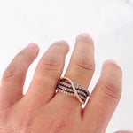 Stunning 14K Rose Gold Wavy Crossover Ring featuring a captivating blend of white and light brown diamonds. This elegant design beautifully intertwines bands, creating a unique and modern look perfect for any occasion.
