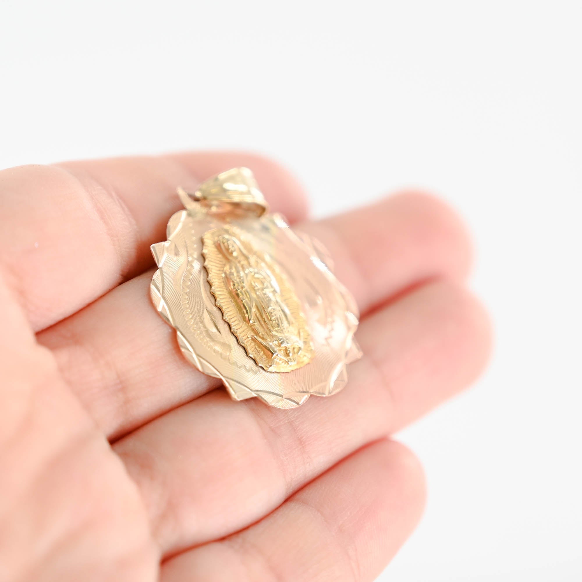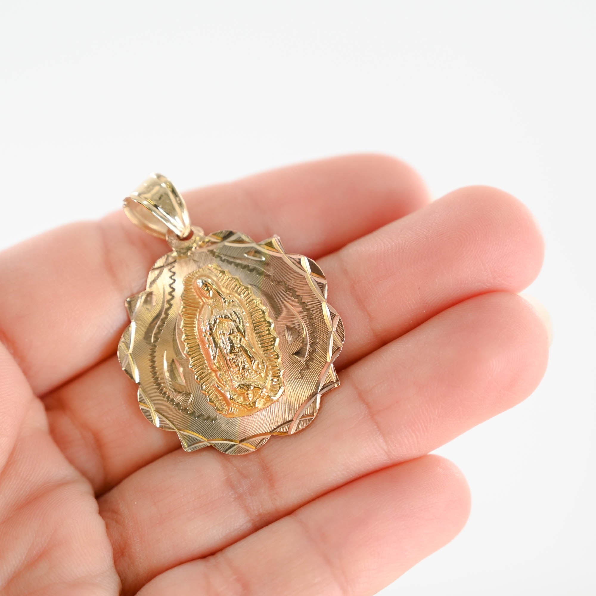 This exquisite pendant features intricate diamond-cut detailing, beautifully showcasing Lady Guadalupe on one side and the Sacred Heart of Jesus on the other, in stunning 14k tri-tone gold. Measuring 1.5 inches in length, it's a perfect blend of faith and elegance.