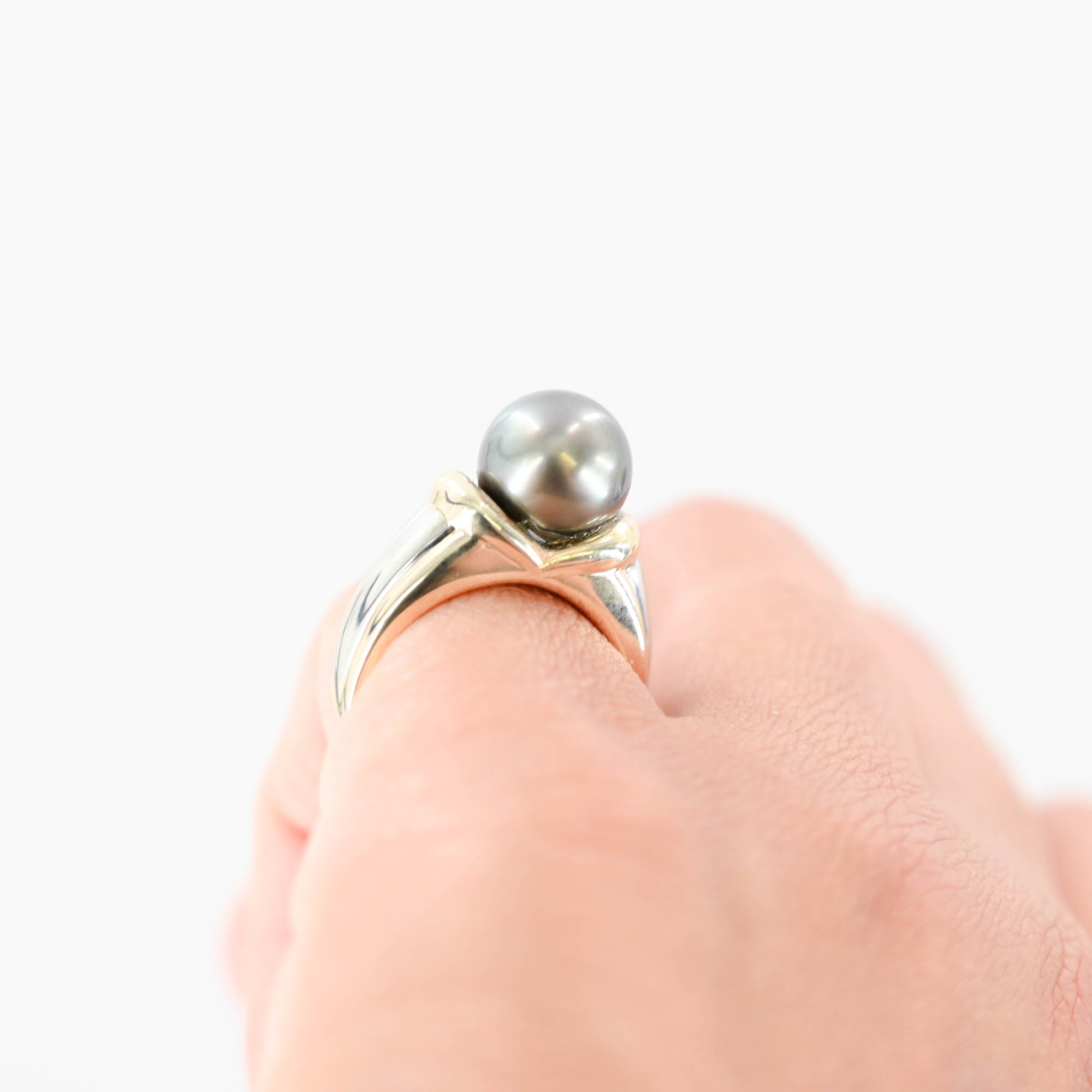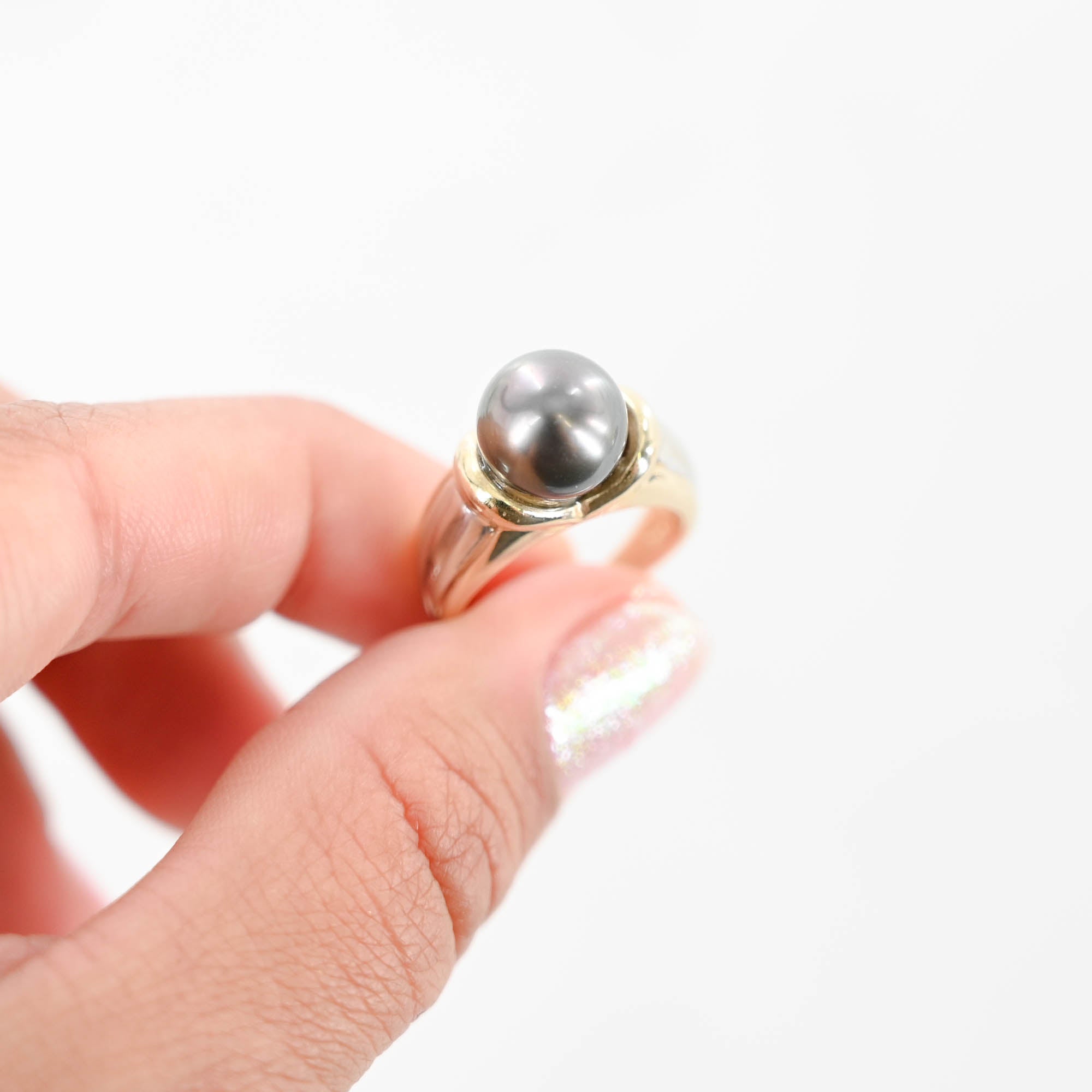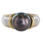 14K two-tone gold cocktail ring featuring a stunning Tahitian black natural pearl. The rich, lustrous pearl is beautifully set against the contrasting gold tones, creating a sophisticated and unique design.