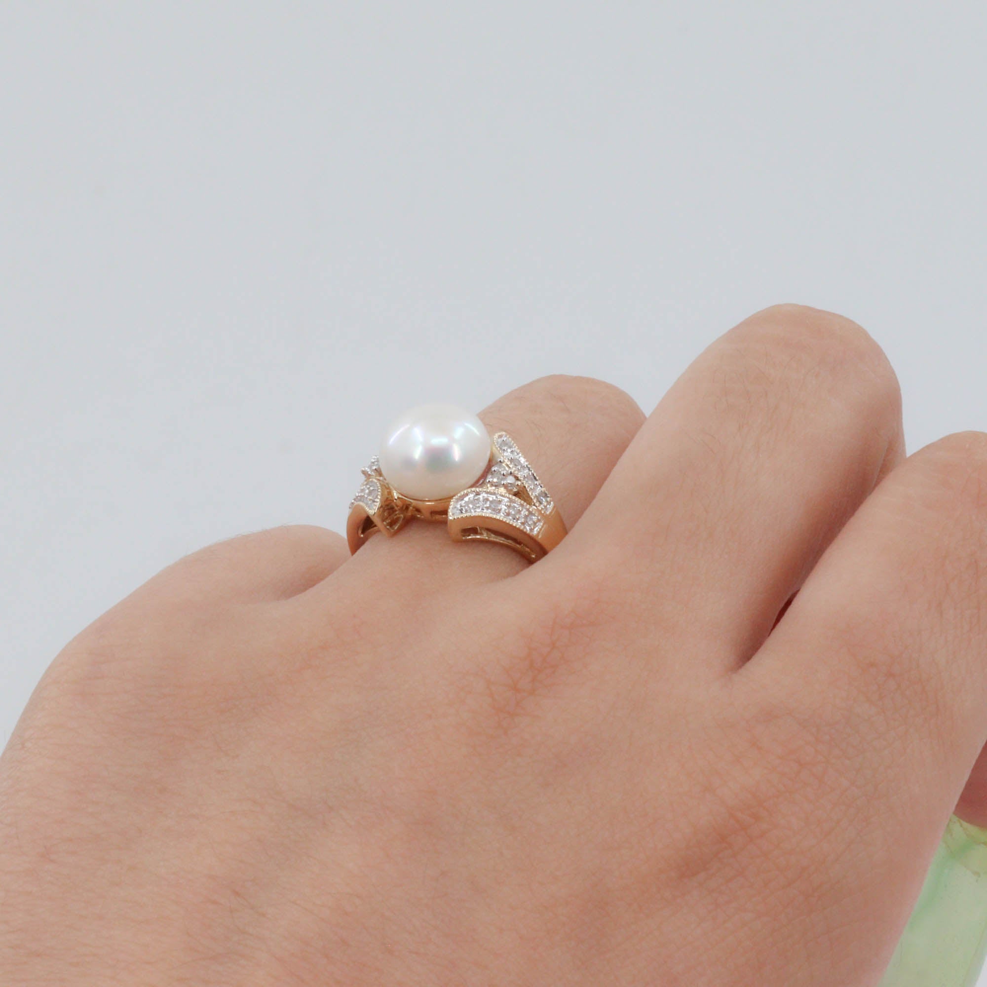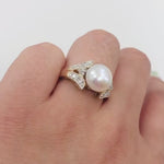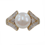 14k Yellow Gold Pearl and Single-cut Diamonds Cocktail Ring