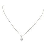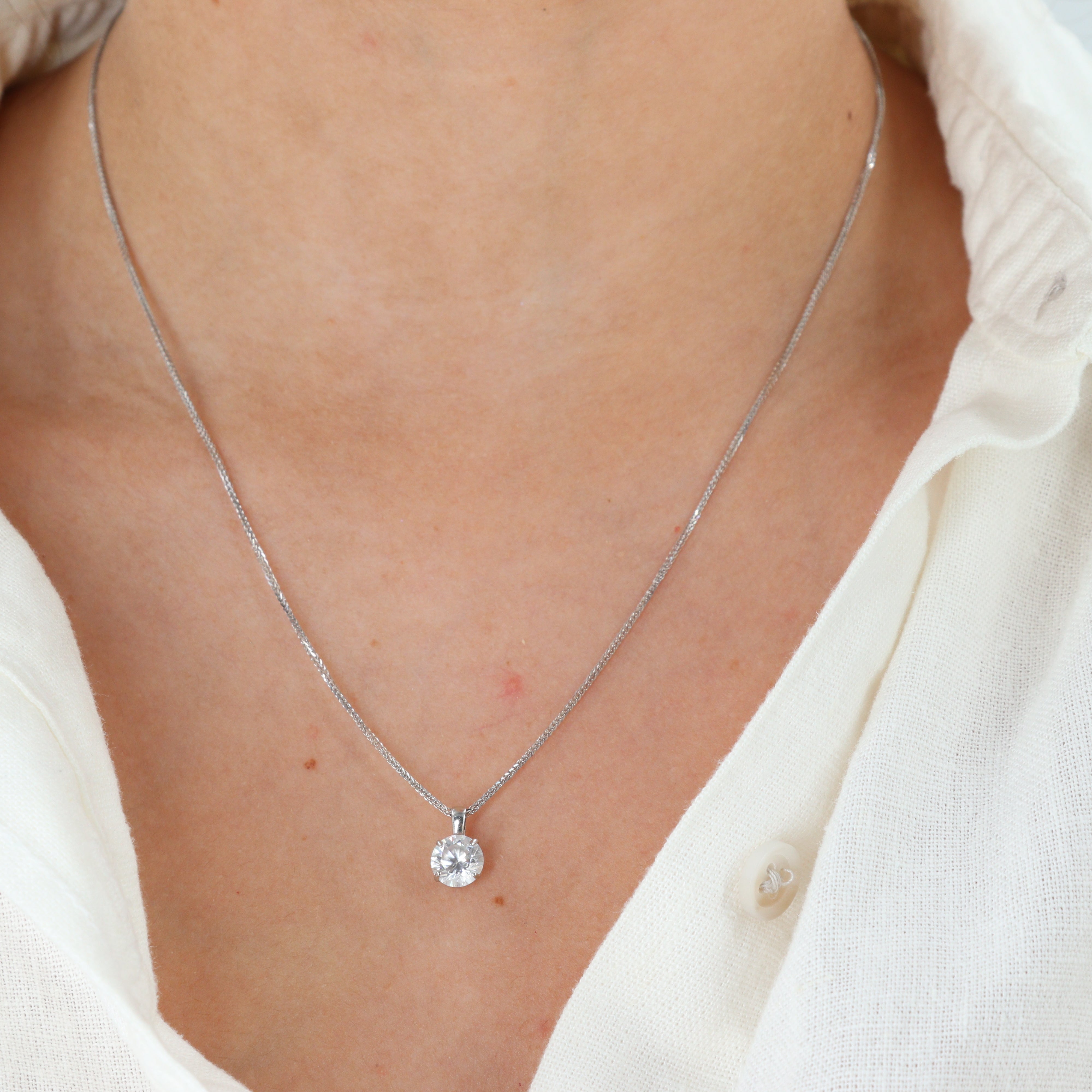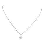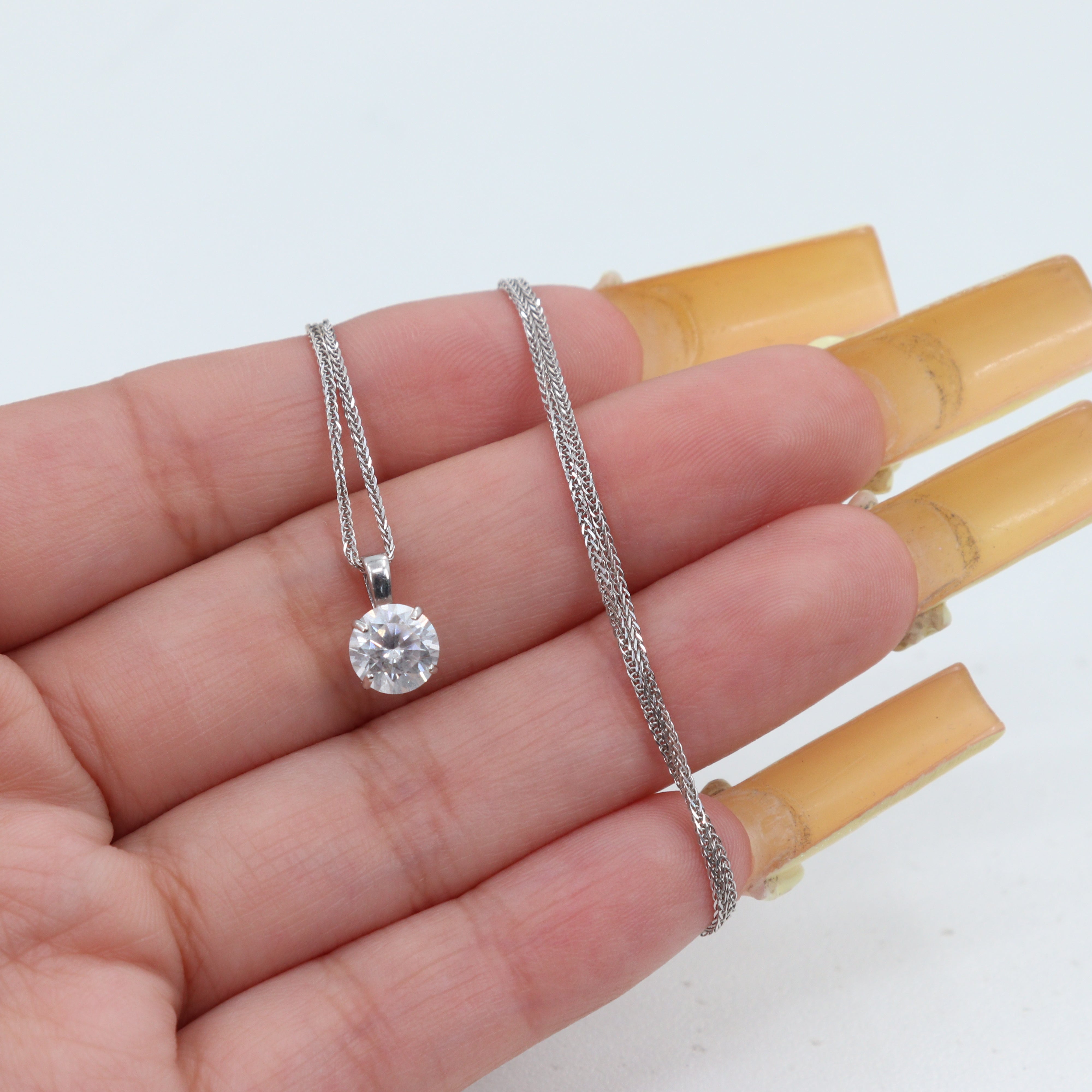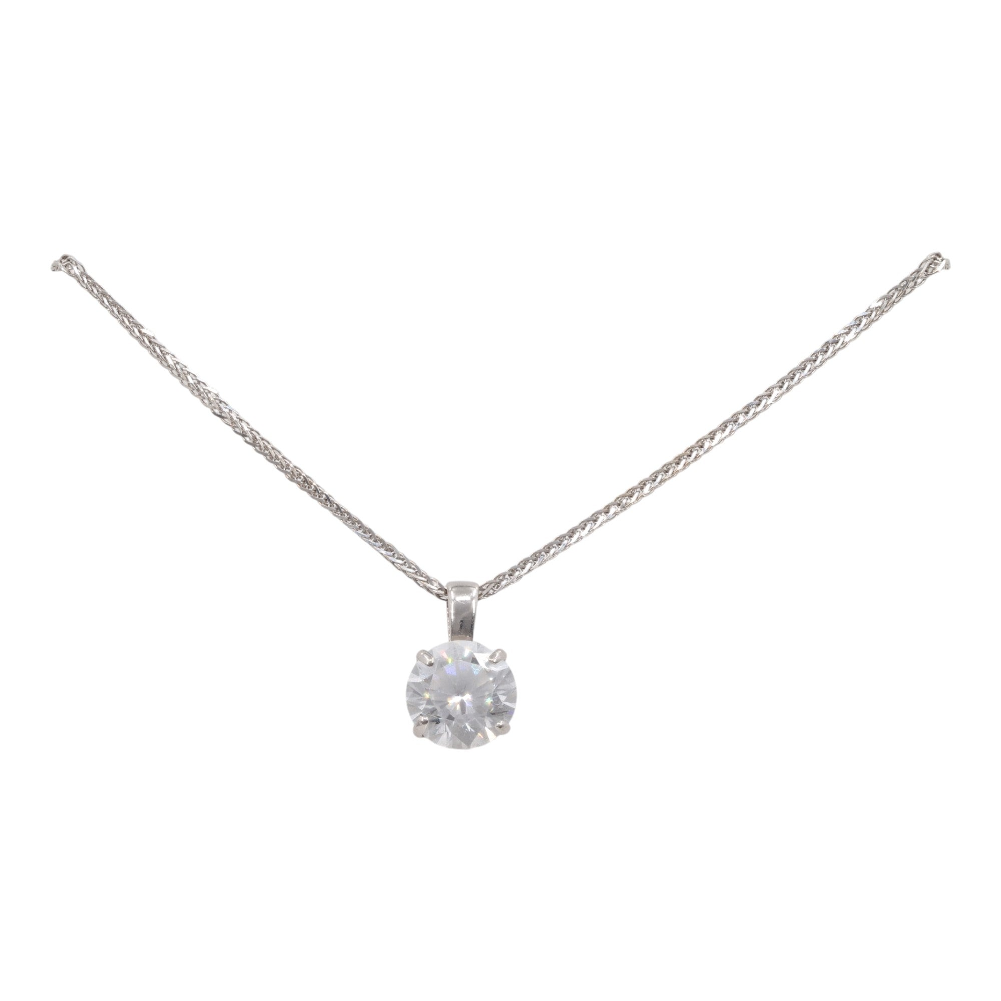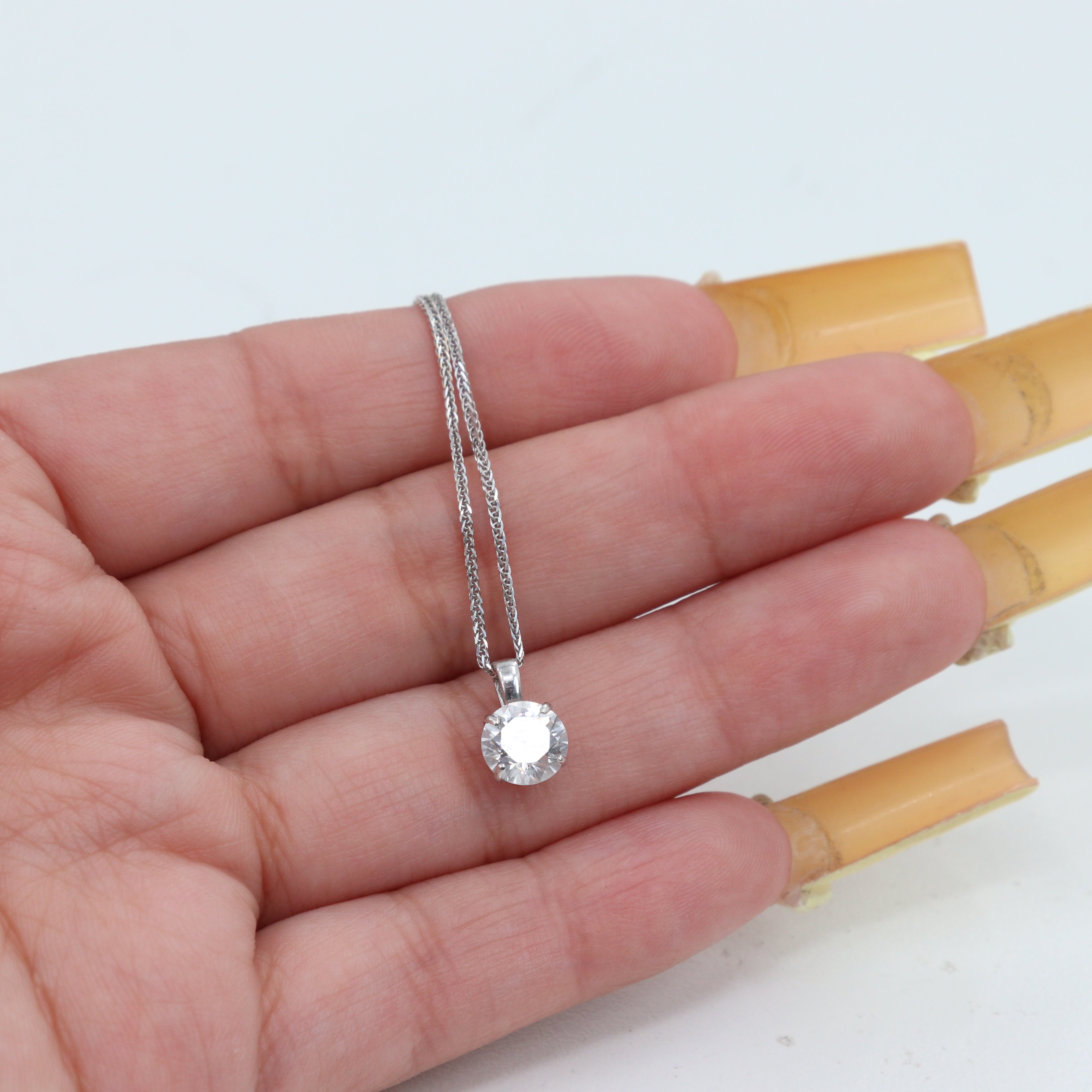 This elegant 18-inch 14k white gold box chain necklace features a captivating round cut quartz pendant. The delicate 0.70mm wide box chain is secured with a lobster clasp, while the pendant, measuring 11.30mm in length (including the bale) and 0.70mm in width, showcases a stunning quartz stone estimated at approximately 1.5 carats. Weighing 2.4 grams, this necklace offers a timeless and sophisticated sparkle.