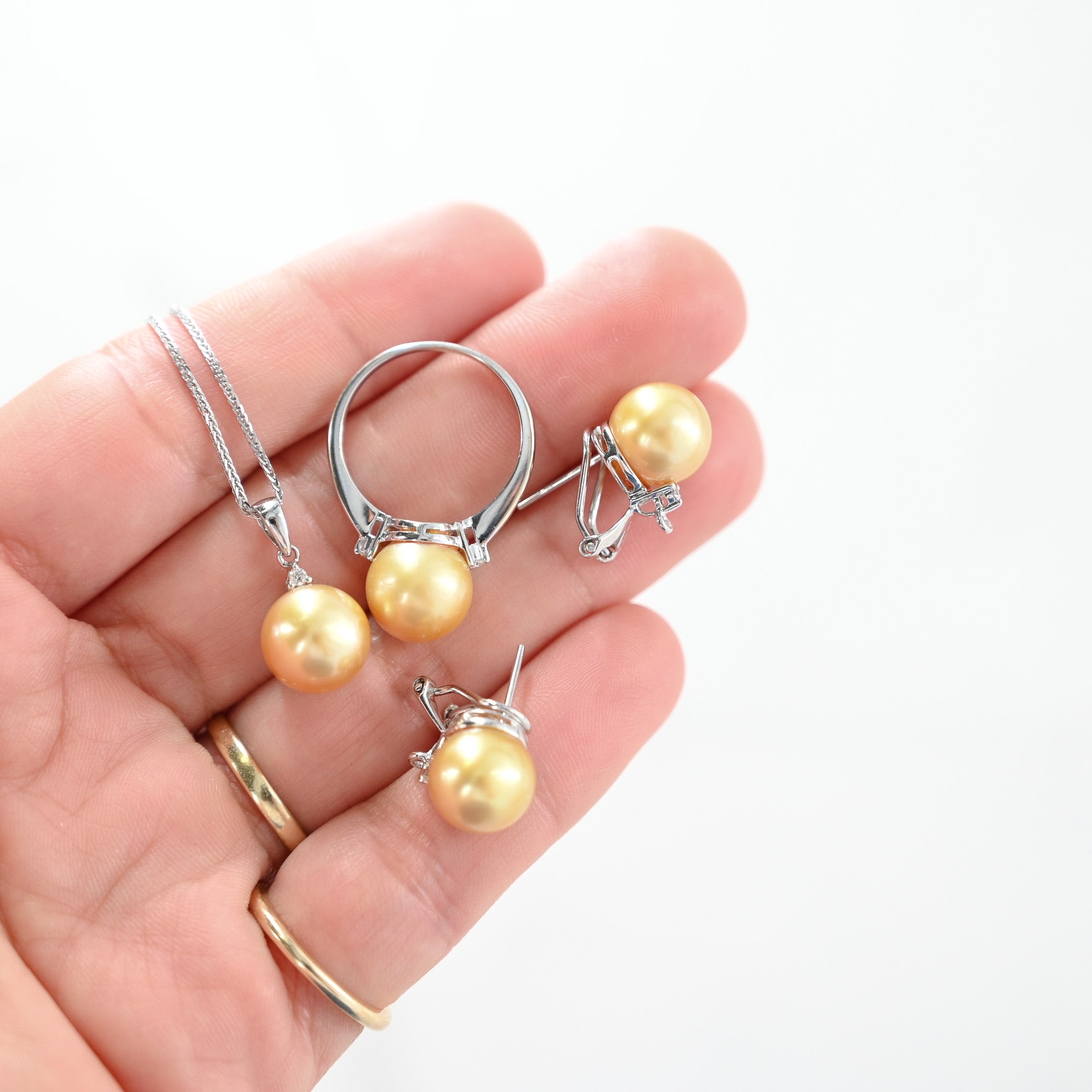 This luxurious ensemble features a delicately crafted franco/wheat link chain adorned with lustrous champagne pearls and dazzling diamonds, perfectly complemented by matching ring and earrings. Elevate any ensemble with sophistication and grace. Handcrafted to perfection, this set exudes opulence and refinement, making it a must-have addition to your jewelry collection.