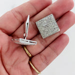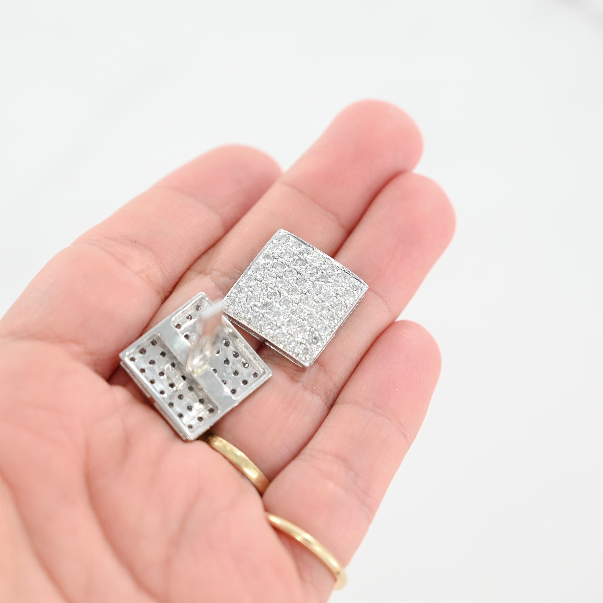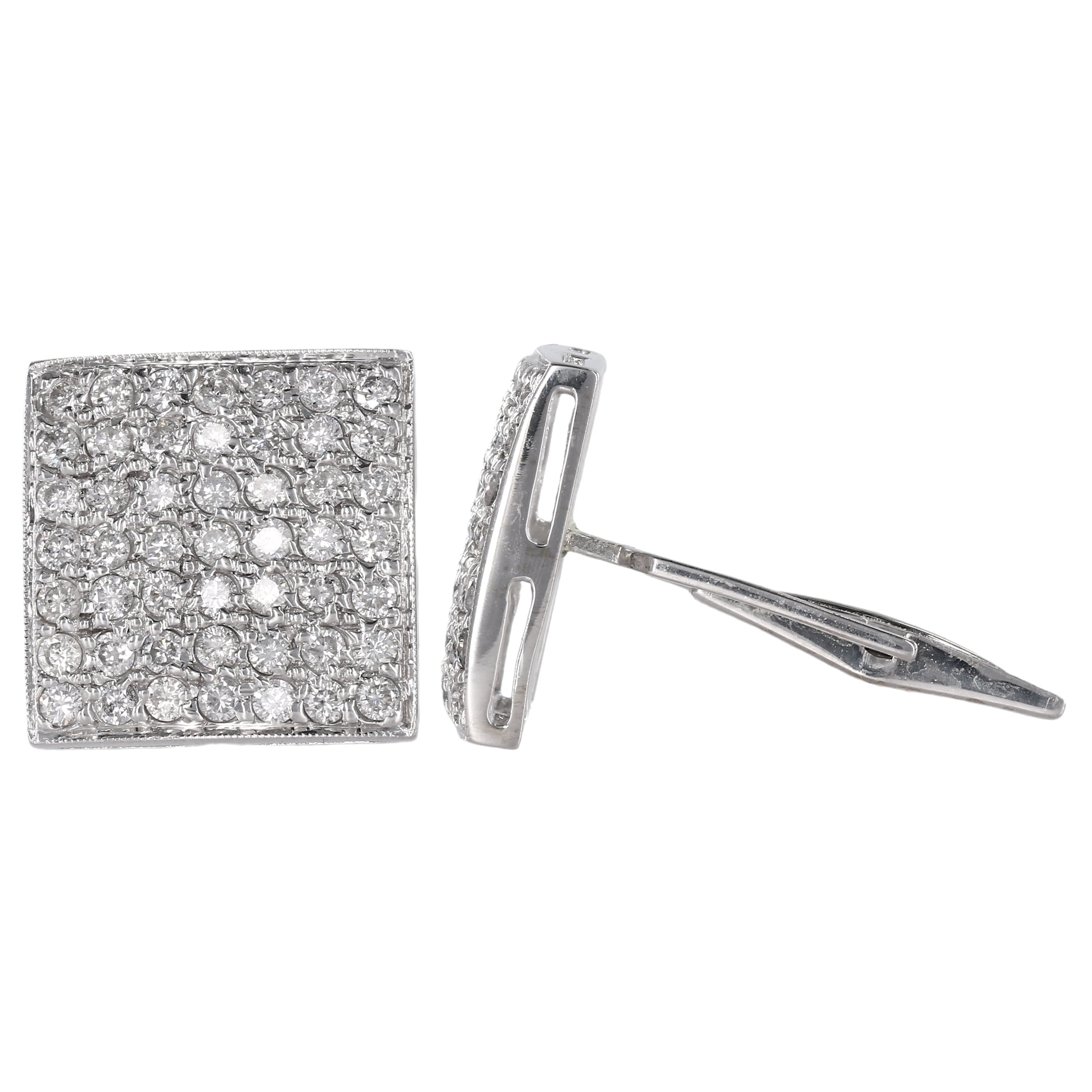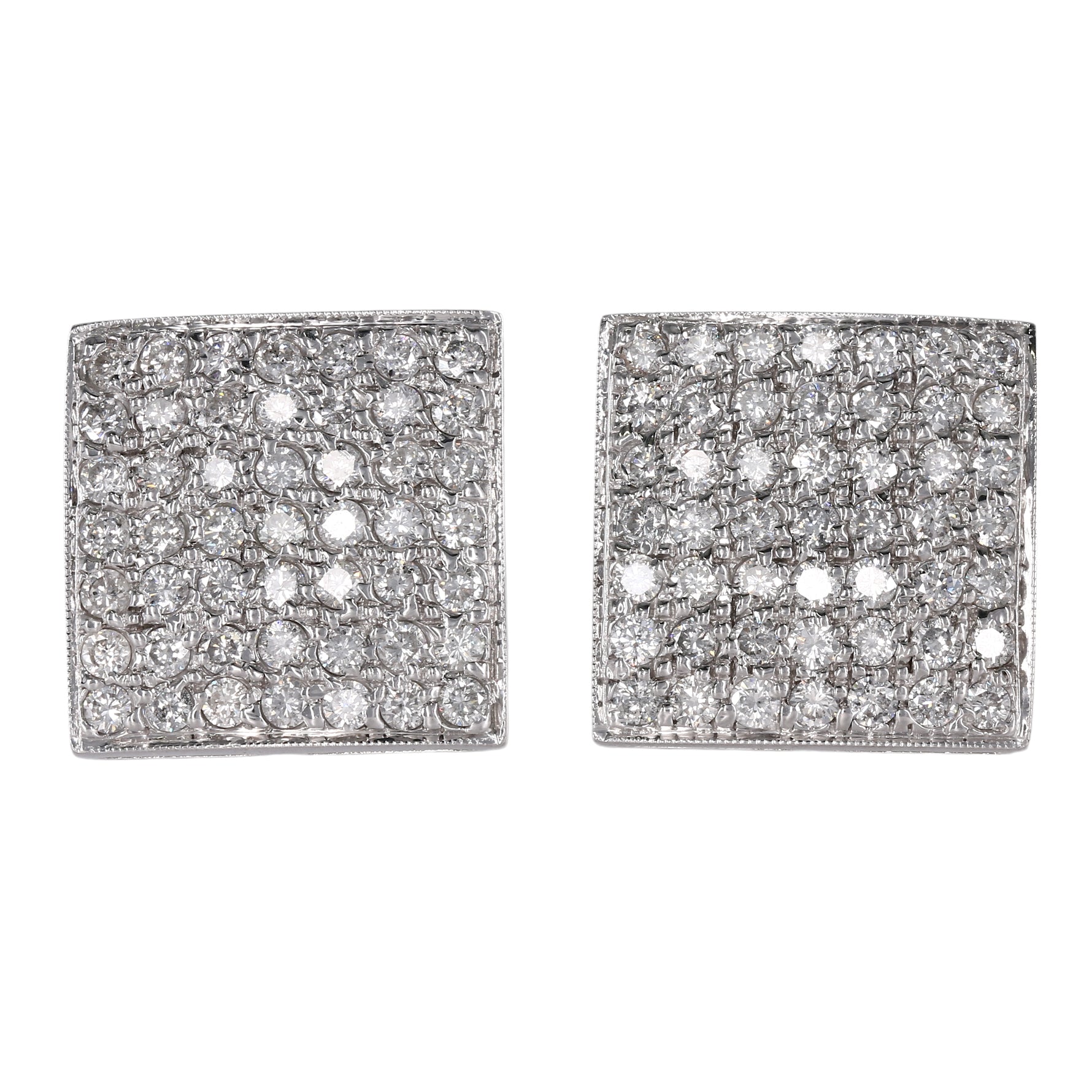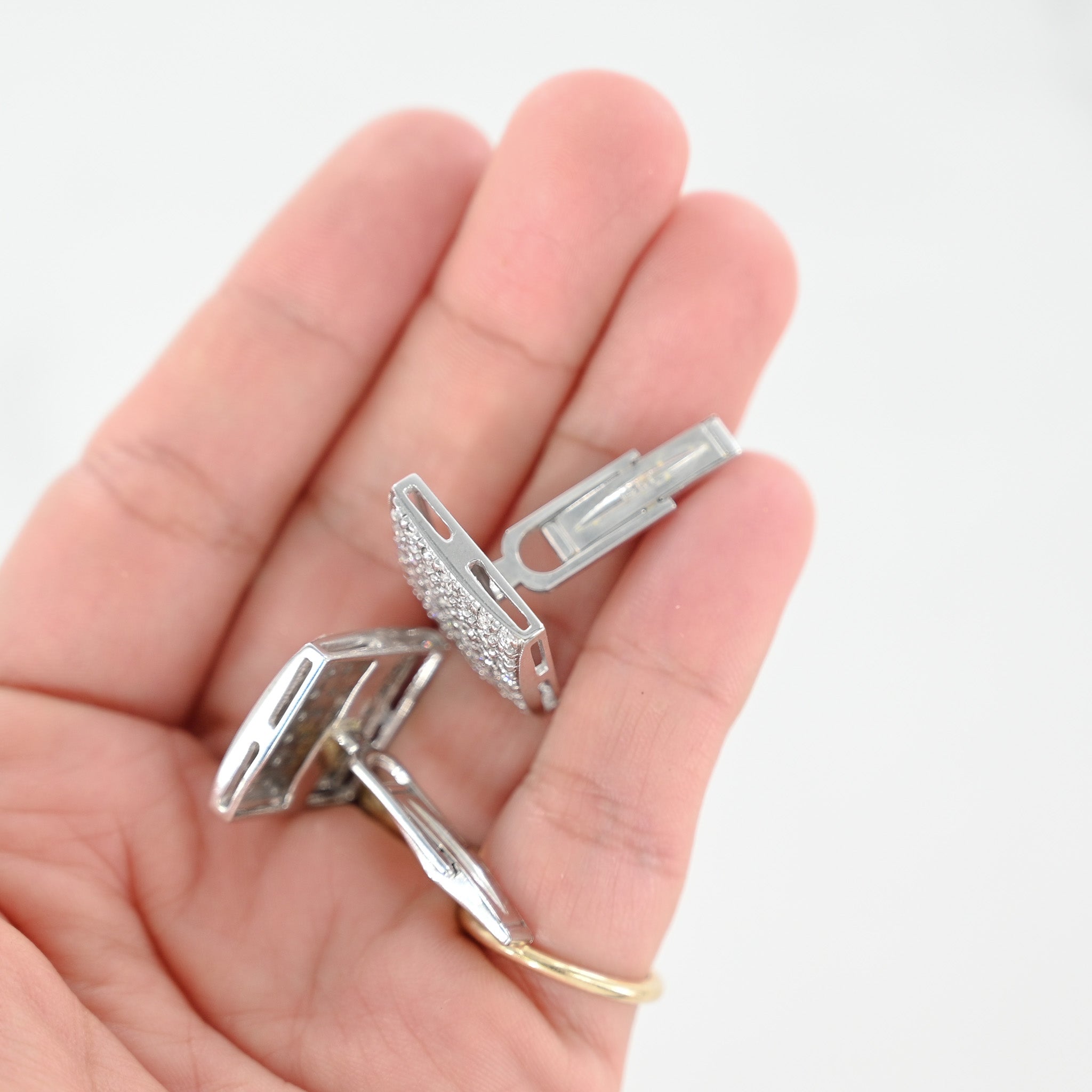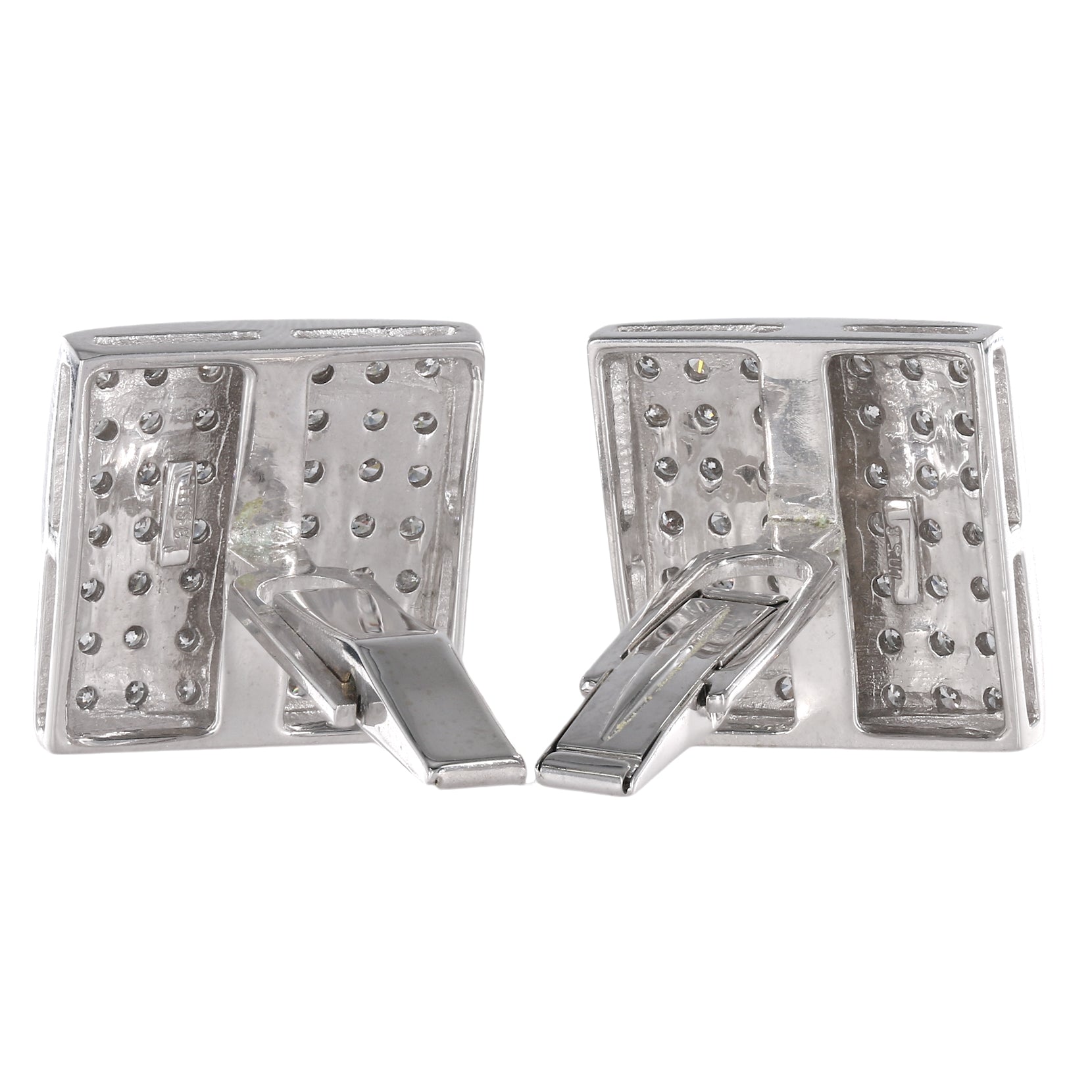 These exquisite cuff links are a sophisticated addition to any ensemble, featuring a cluster of dazzling diamonds set in lustrous white gold. The timeless design adds a touch of refinement, making them a perfect accessory for special occasions.