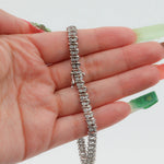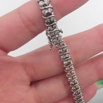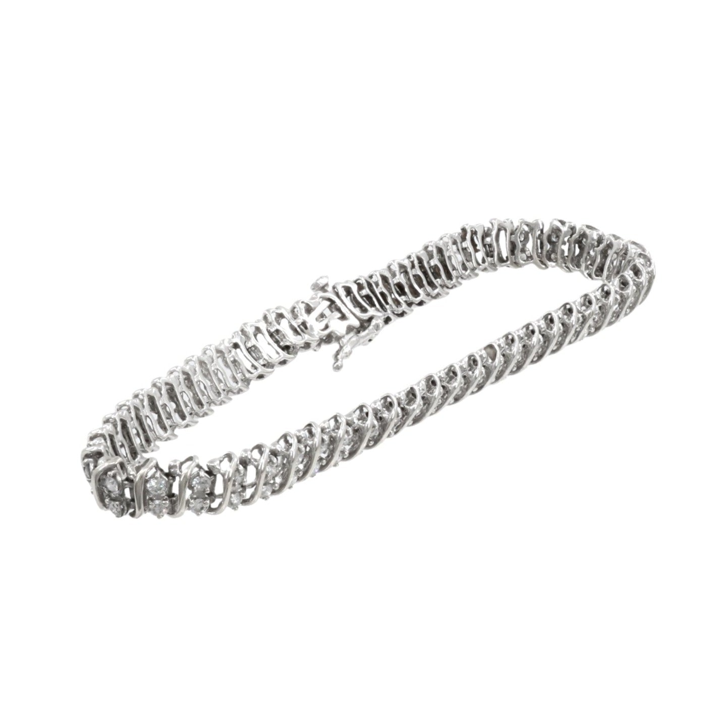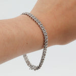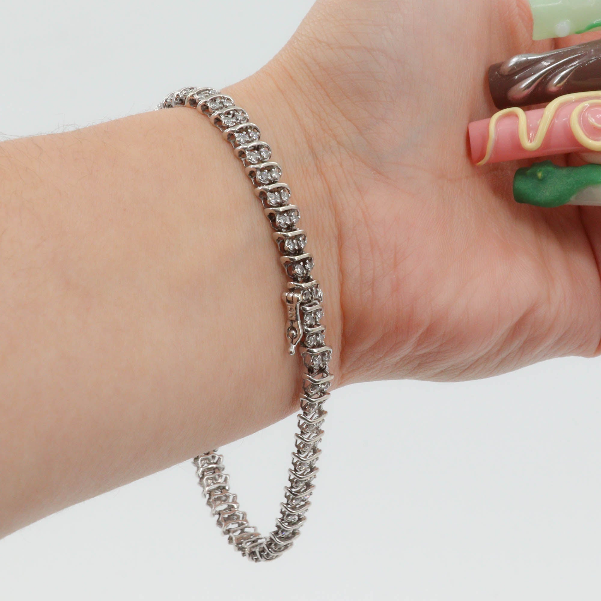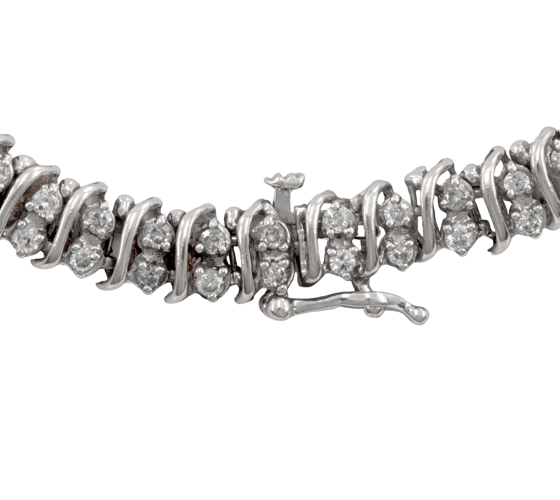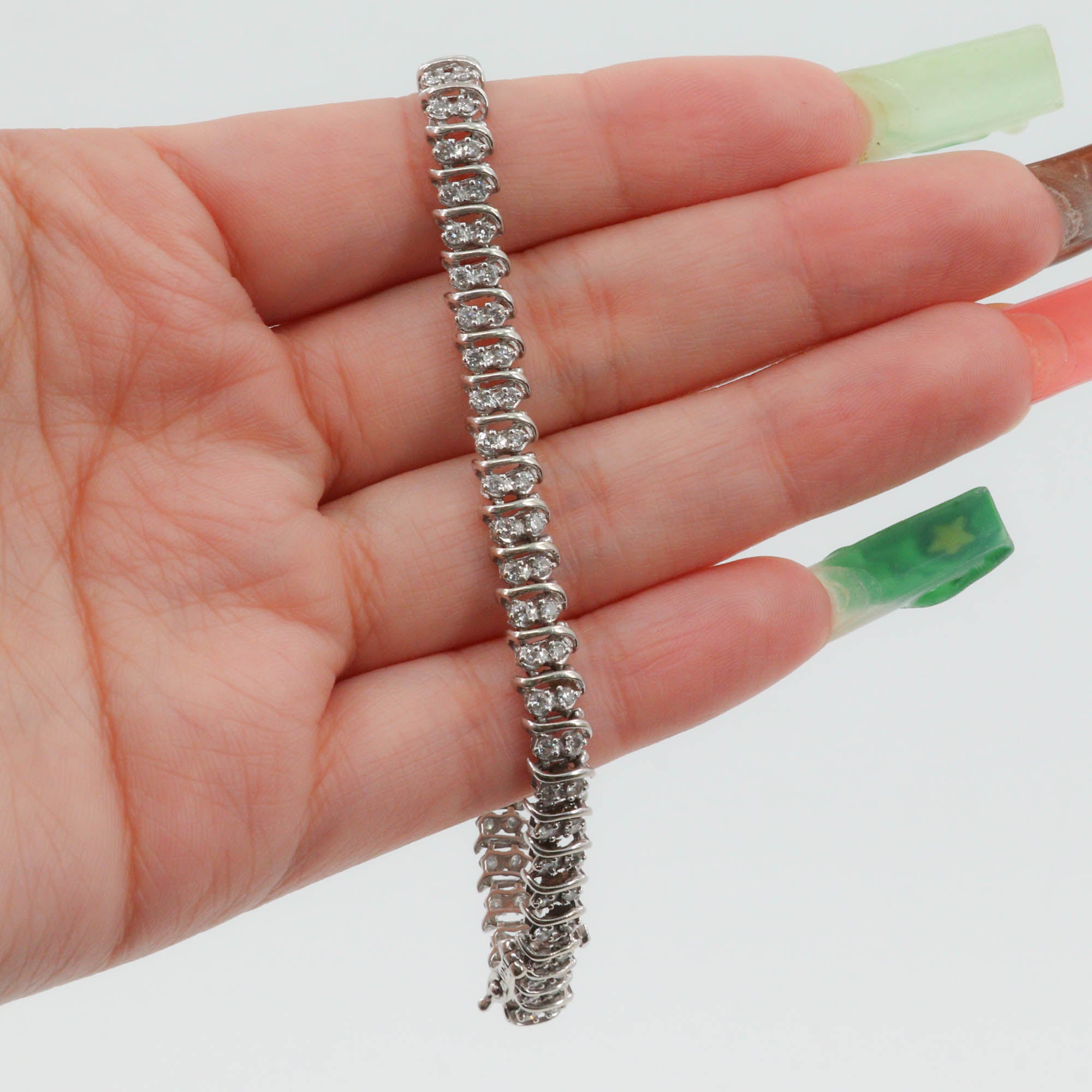Expertly crafted with 14k white gold, this 8in tennis bracelet boasts a total of 104 round brilliant cut diamonds, totaling 1.56ctw. The timeless design features a secure tennis clasp and a delicate 6mm width. With a weight of 10.5g, this stunning bracelet exudes elegance and sophistication.