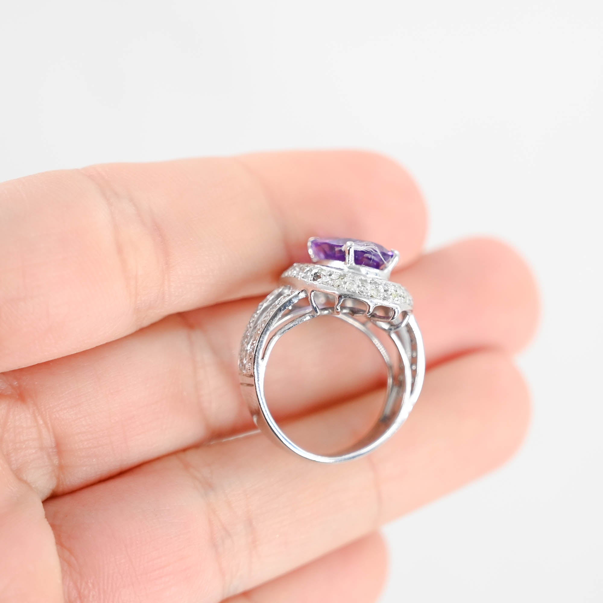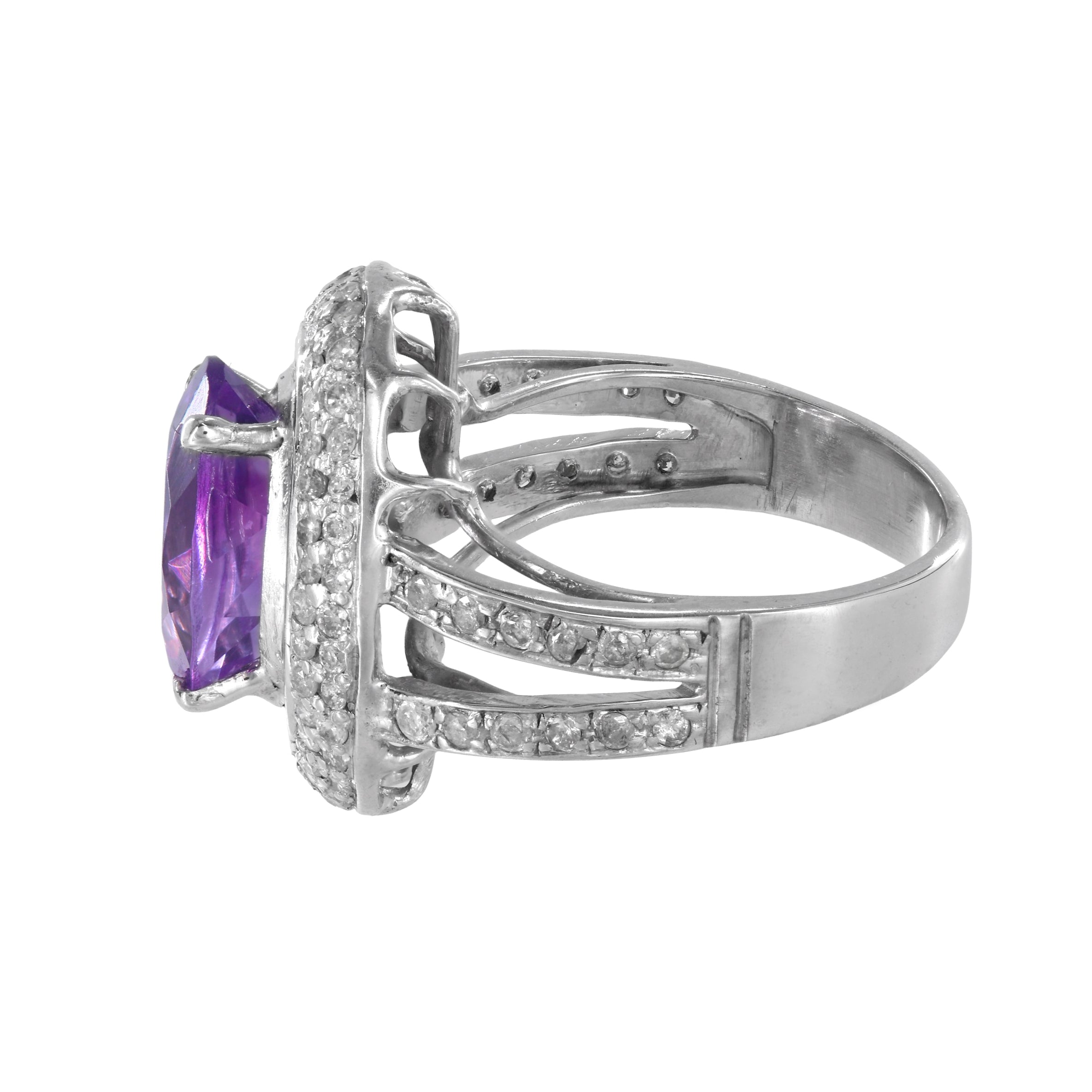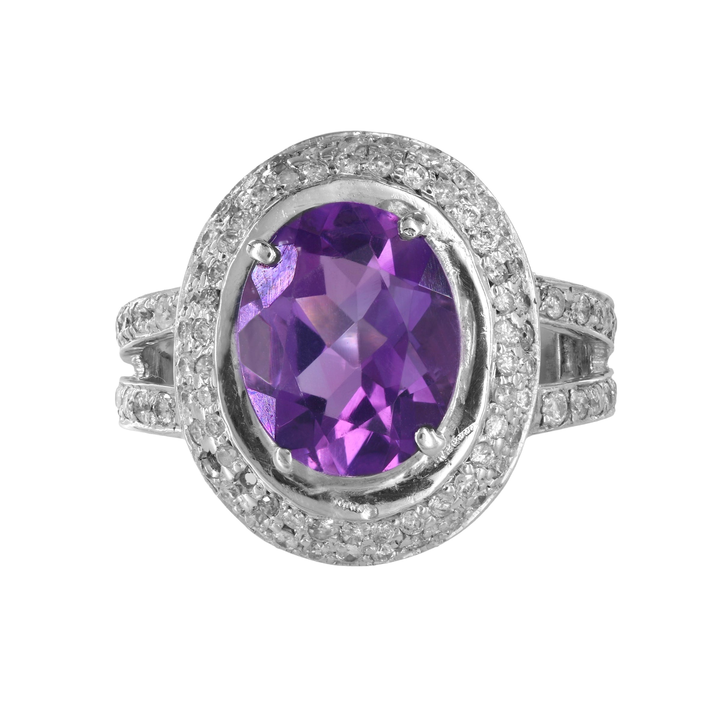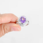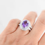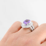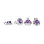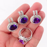 Each piece features a stunning large amethyst stone surrounded by a halo of sparkling diamonds, exuding elegance and sophistication. This set includes a pendant, ring, and earrings, perfect for adding a touch of luxury to any ensemble.