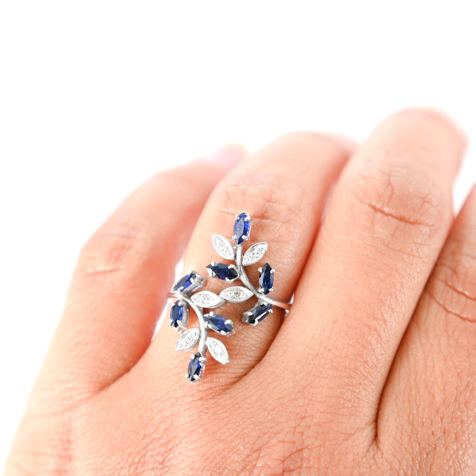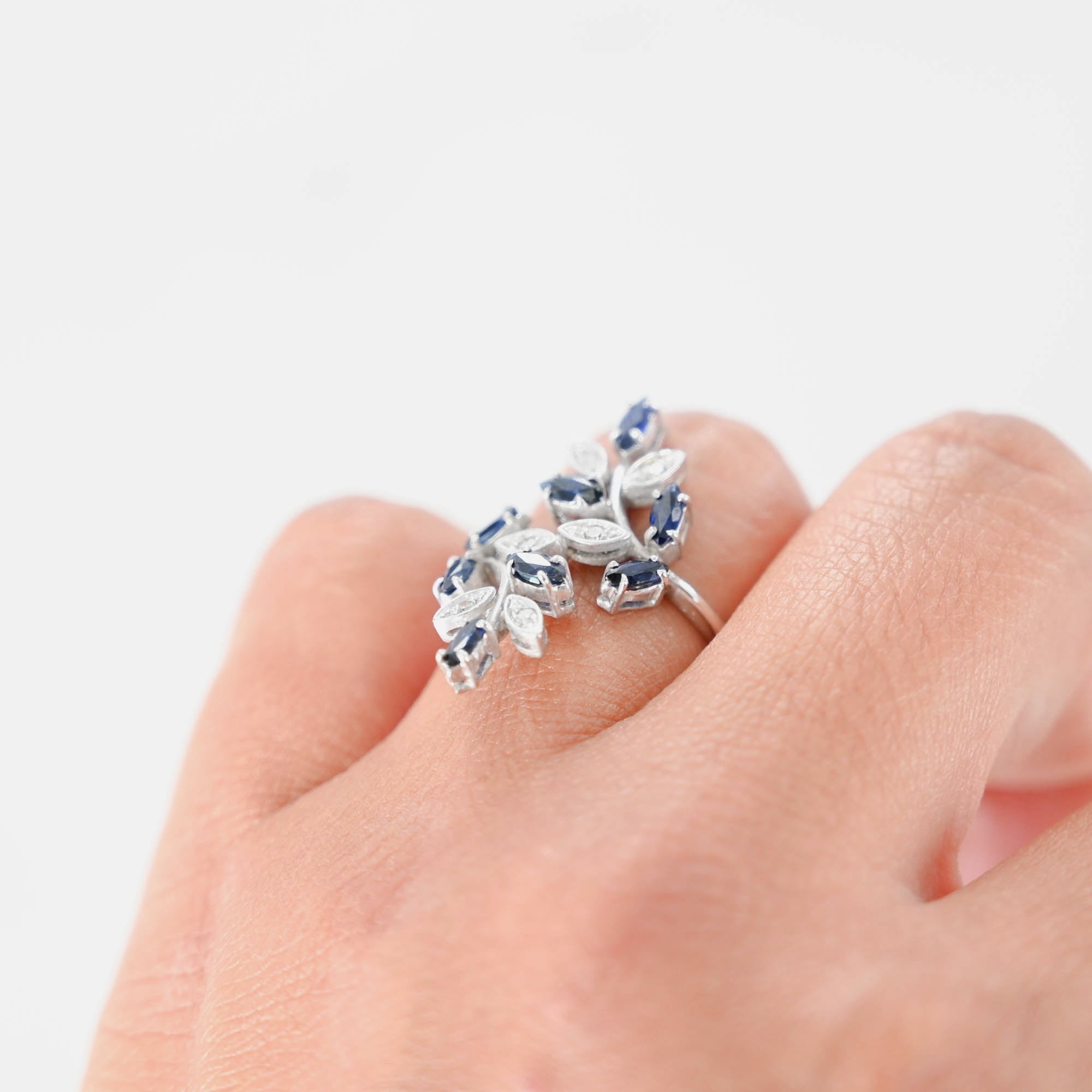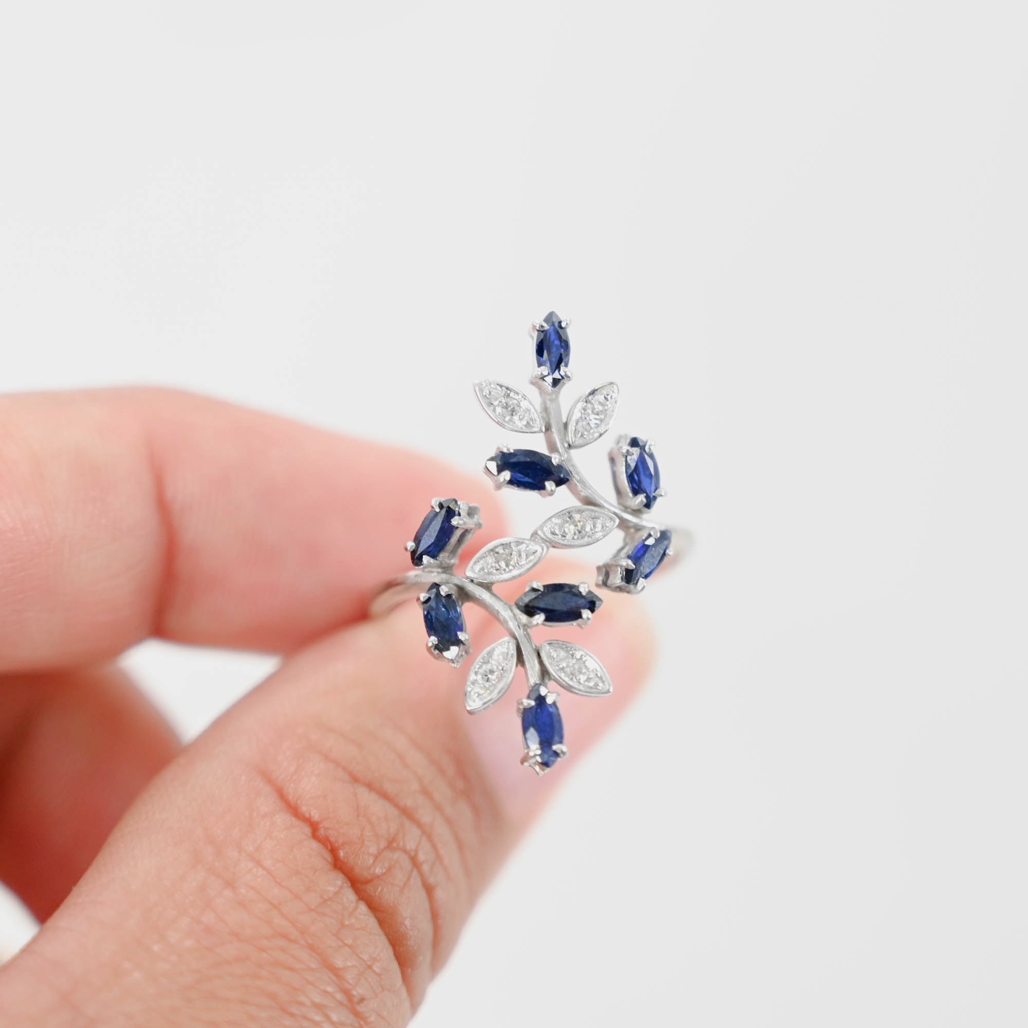 Adorned with sparkling diamonds and vibrant sapphires, this exquisite piece features a beautifully detailed leaf motif that exudes sophistication. Perfect for special occasions or everyday glamour, this ring is sure to make a statement wherever you go.