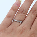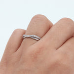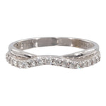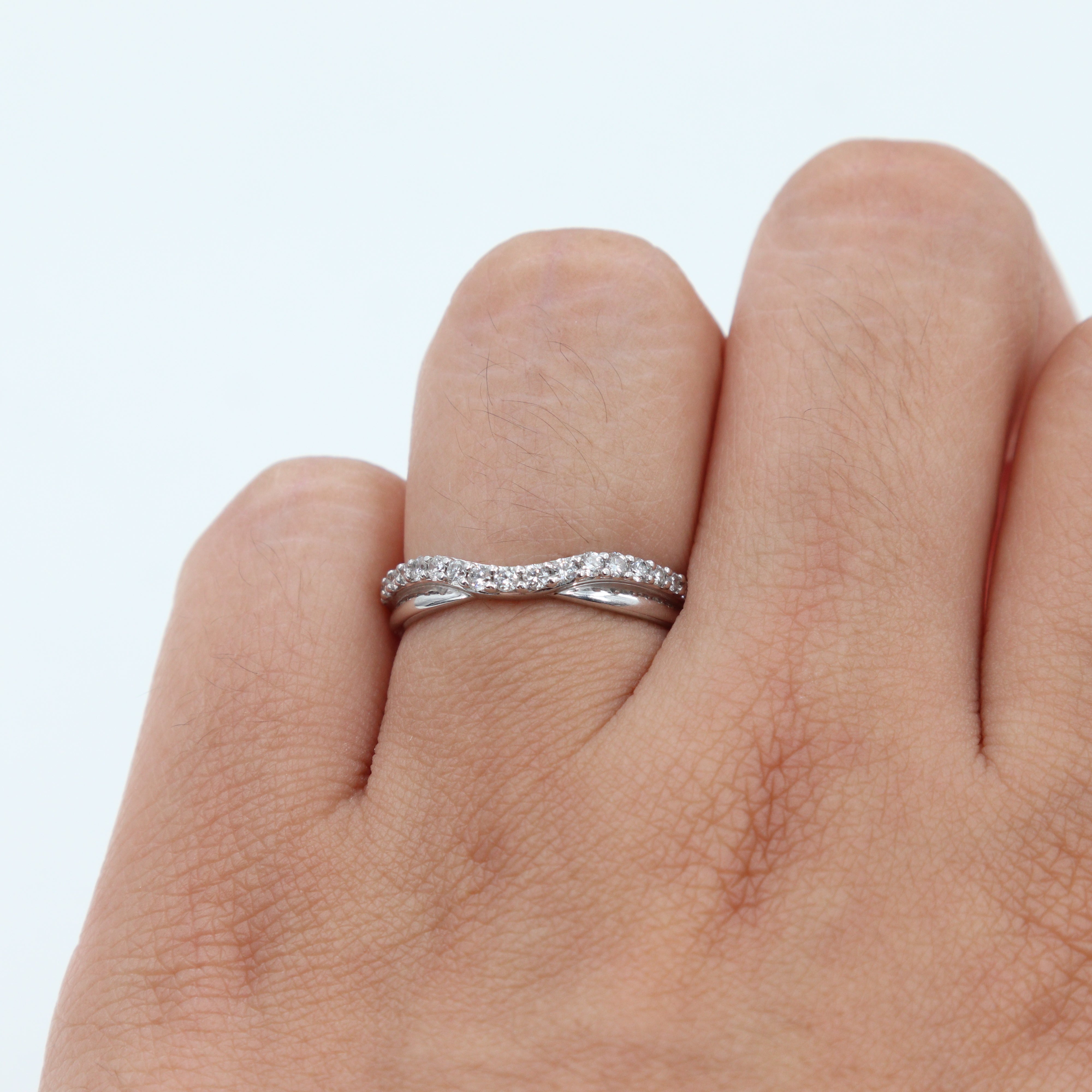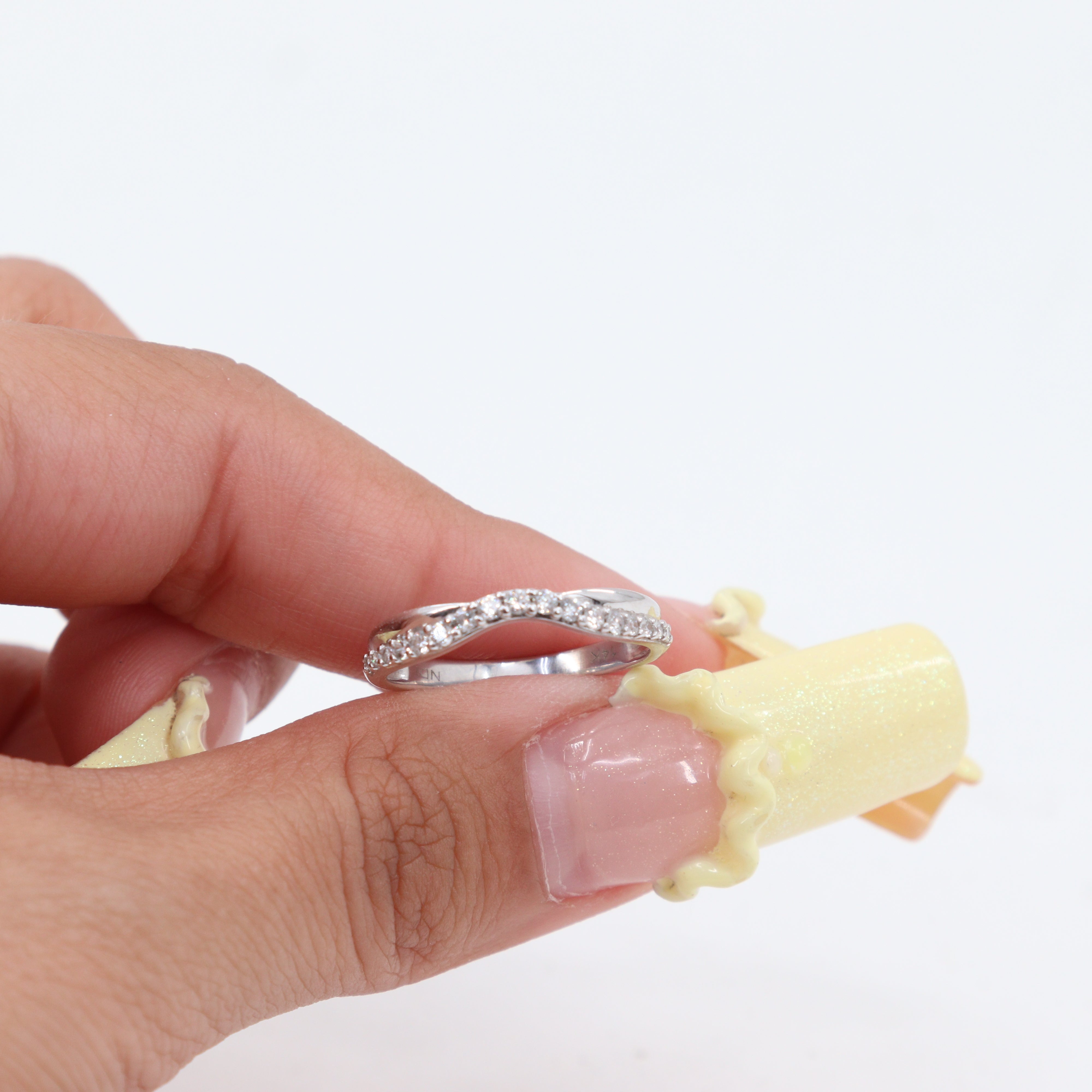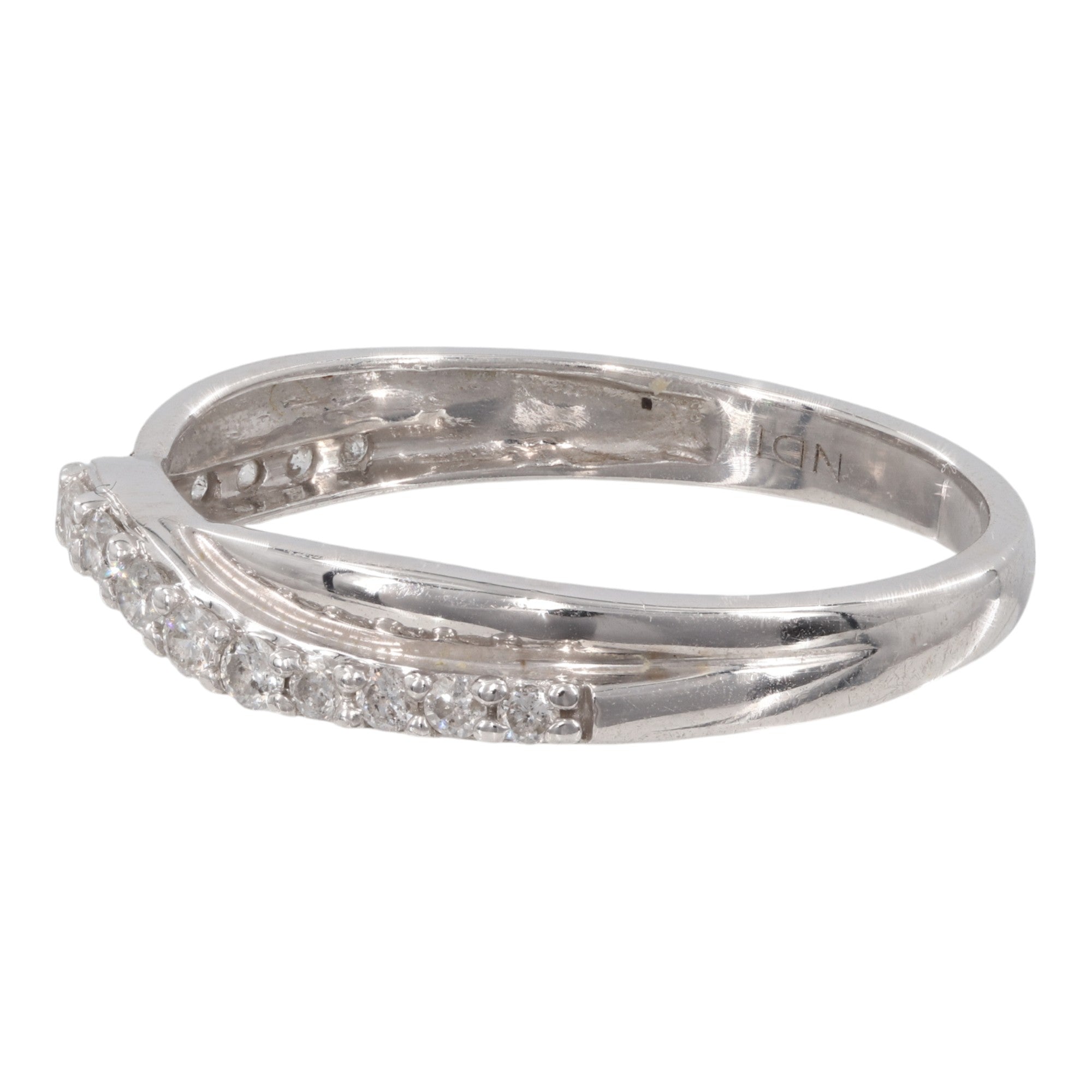 This 14k white gold band features a graduated row of sparkling diamonds. Ten larger diamonds, each estimated at 0.02 carats, are followed by seven smaller diamonds, each estimated at 0.01 carats. The diamonds, with I1-I2 clarity and H-J color, create a beautiful and elegant display of light and sparkle. This ring, sized at 7 and weighing 1.8 grams, is a sophisticated and stylish piece