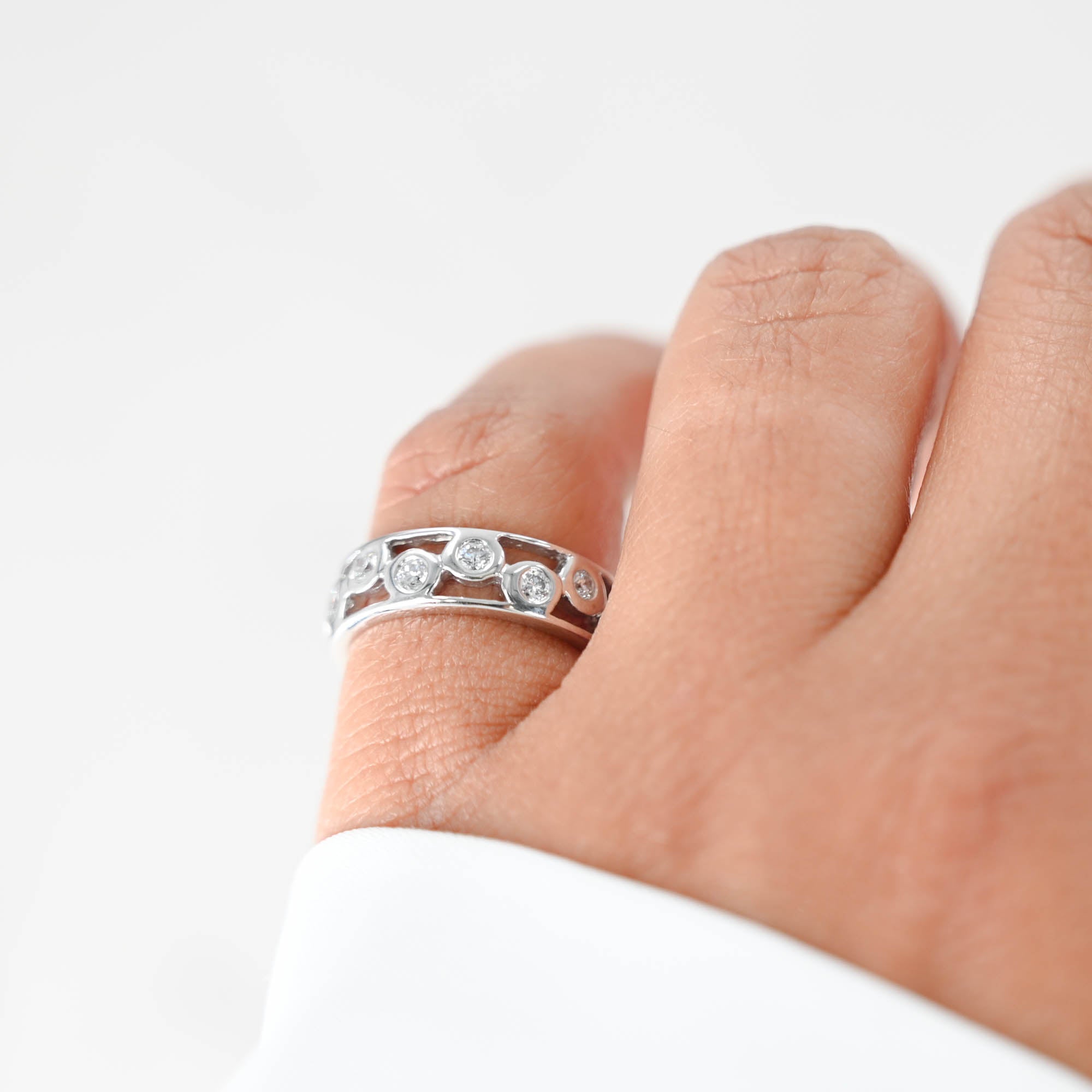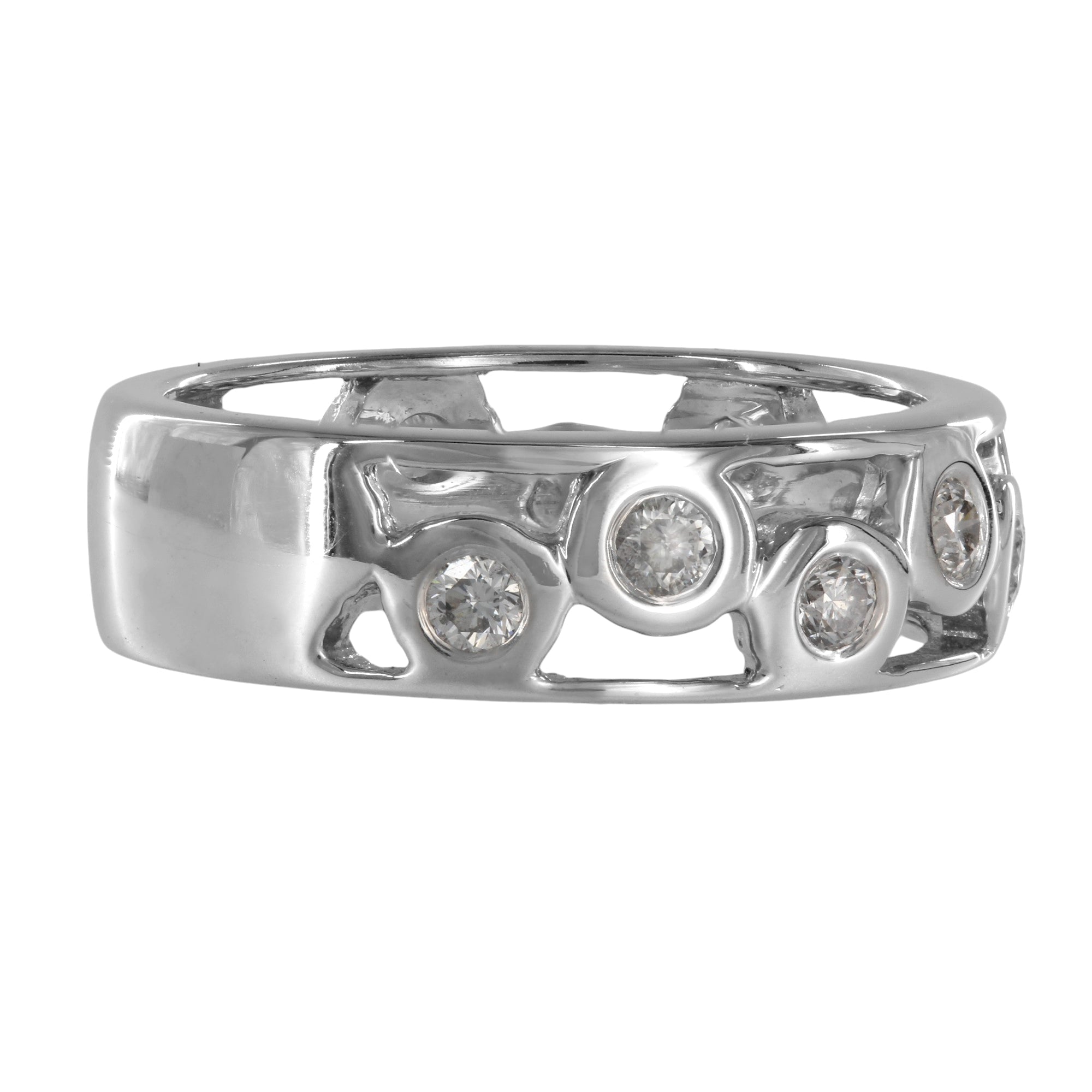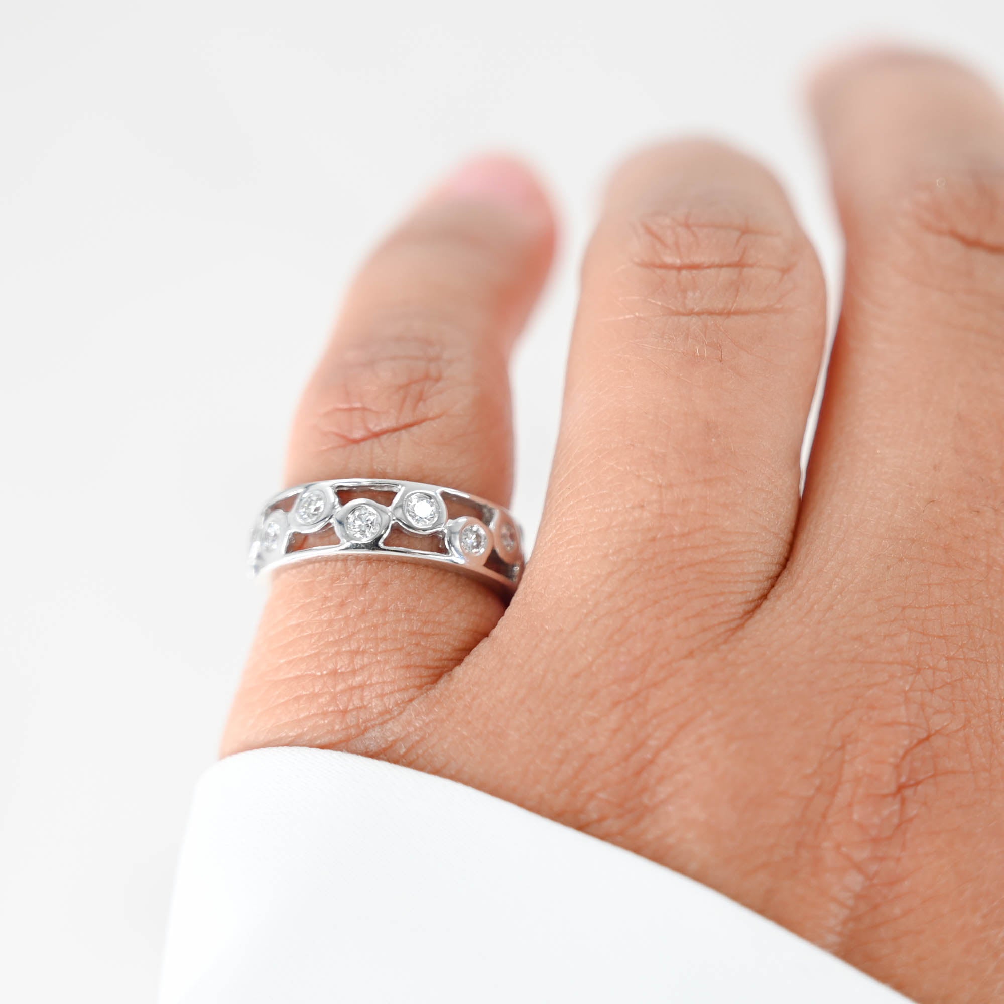 This stunning 14K White Gold Diamond Bezel Set Open Work Band Ring features a delicate open-work design with sparkling diamonds totaling 0.60 carats. The bezel setting enhances the brilliance of each diamond, creating a timeless and elegant look.