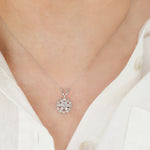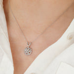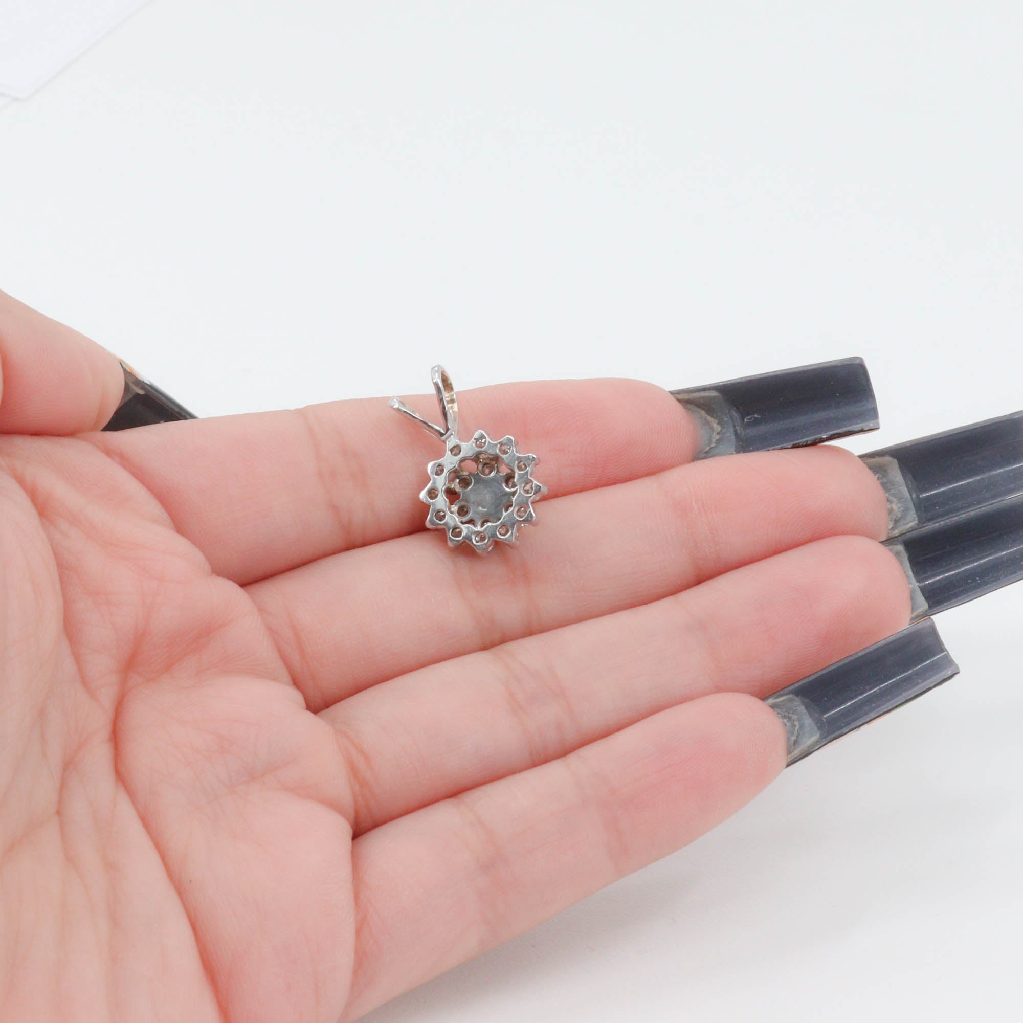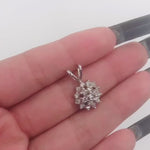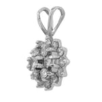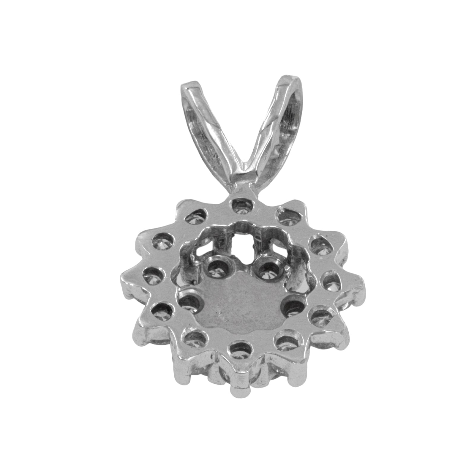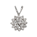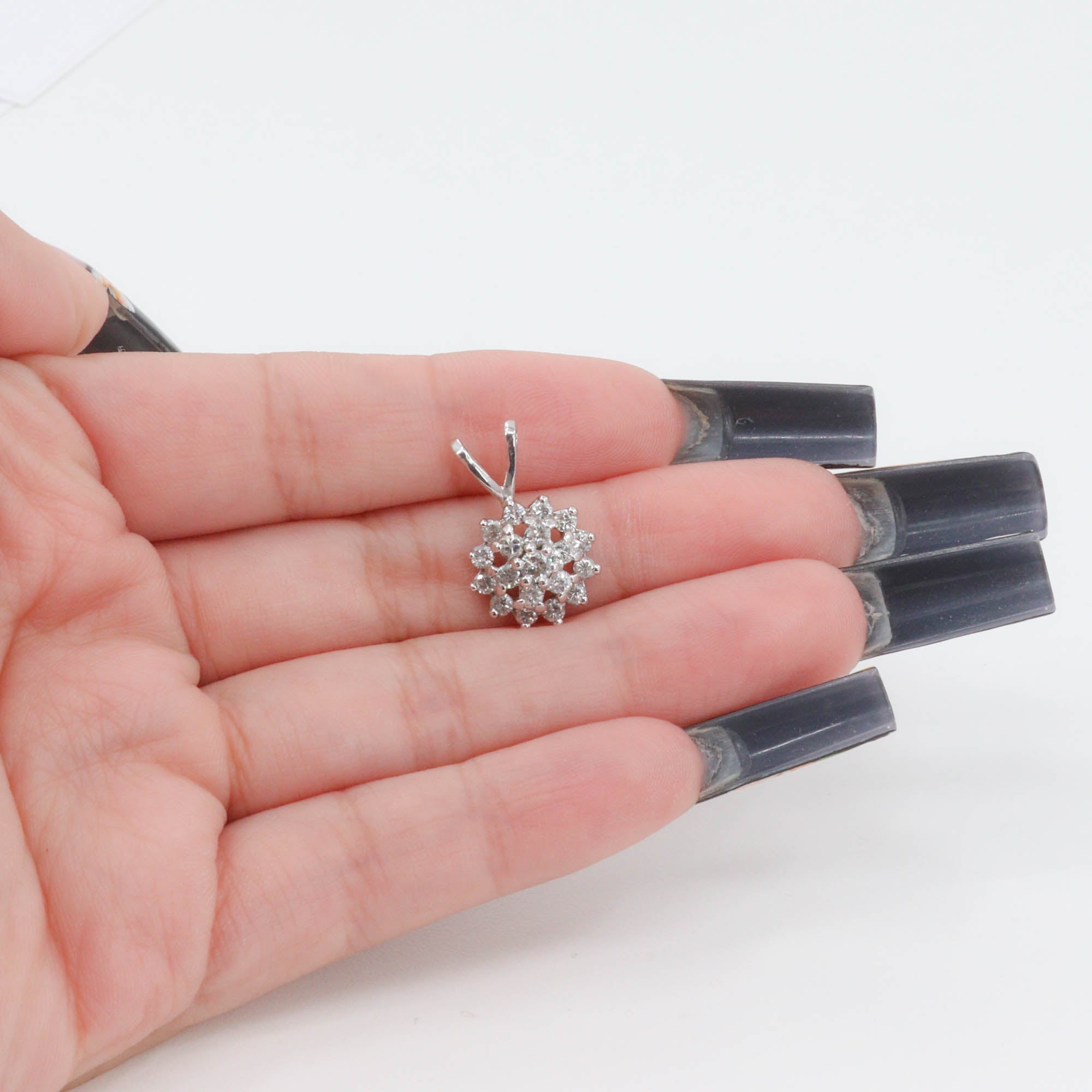 Dazzle with this 14k White Gold Diamond Cluster Pendant. Measuring 20.8mm in length and 13.5mm in width, it features a center round brilliant cut diamond (approx. 0.06ct, I2 clarity) surrounded by 18 round brilliant cut diamonds (approx. 0.04ct each, I1 clarity, G-H color). With a total carat weight of approximately 0.78ct, this pendant is crafted from 14k white gold and weighs 2.5 grams, making it a stunning addition to any jewelry collection.