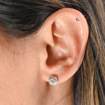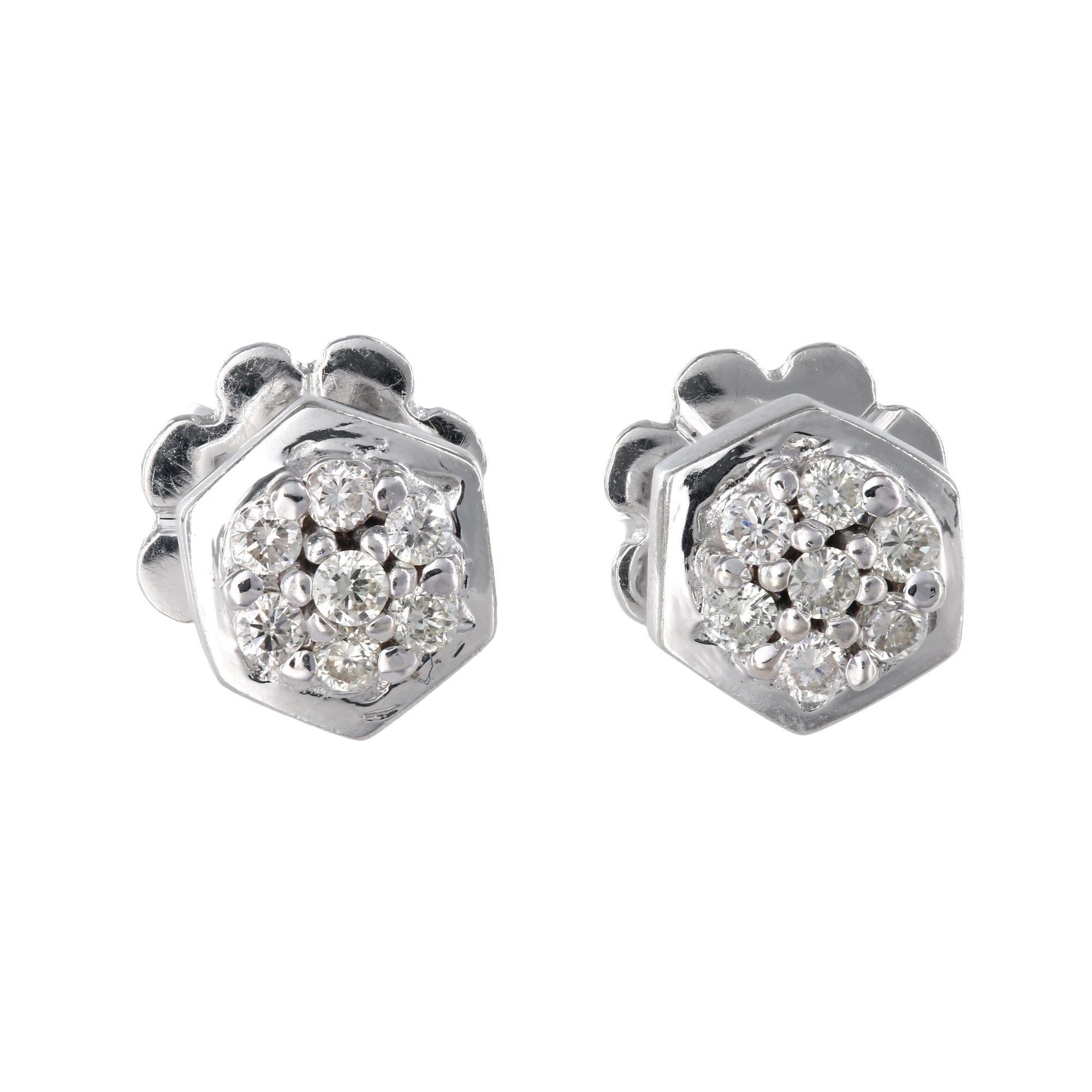 In 14k white gold, this diamond hexagonal motif ring and earring set boasts timeless sophistication. The ring, with a shank size of 3.15mm and a head size of 7.75mm, complements the earrings, each measuring 7.75mm in diameter. Both pieces feature a stunning hexagonal design adorned with a total of 21 round brilliant-cut diamonds, totaling 0.32ctw, with SI2 clarity and H-J color. Secured with pushback closures, these pieces offer elegance and grace. Weighing 7.1 grams combined, this set is a statement of refined luxury.