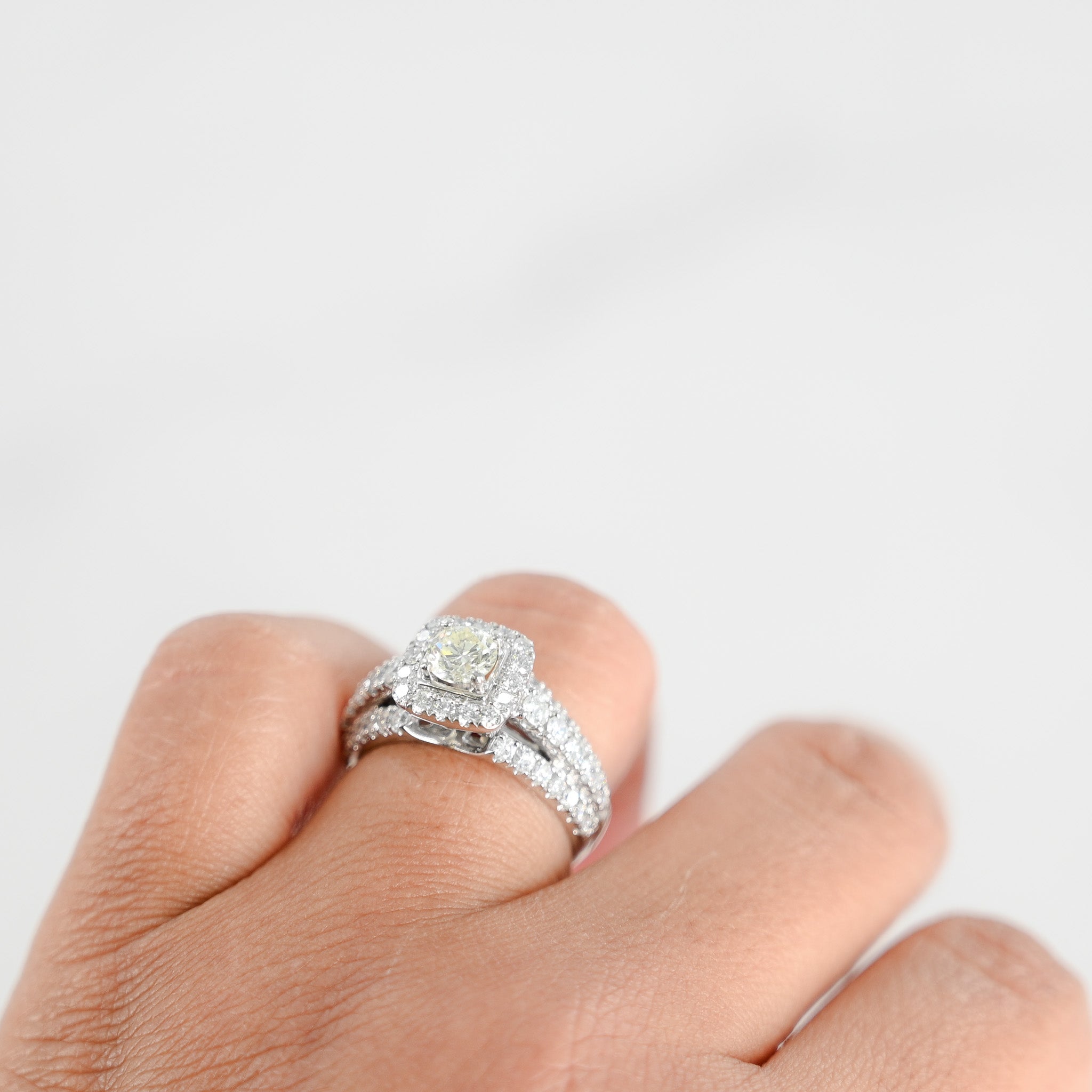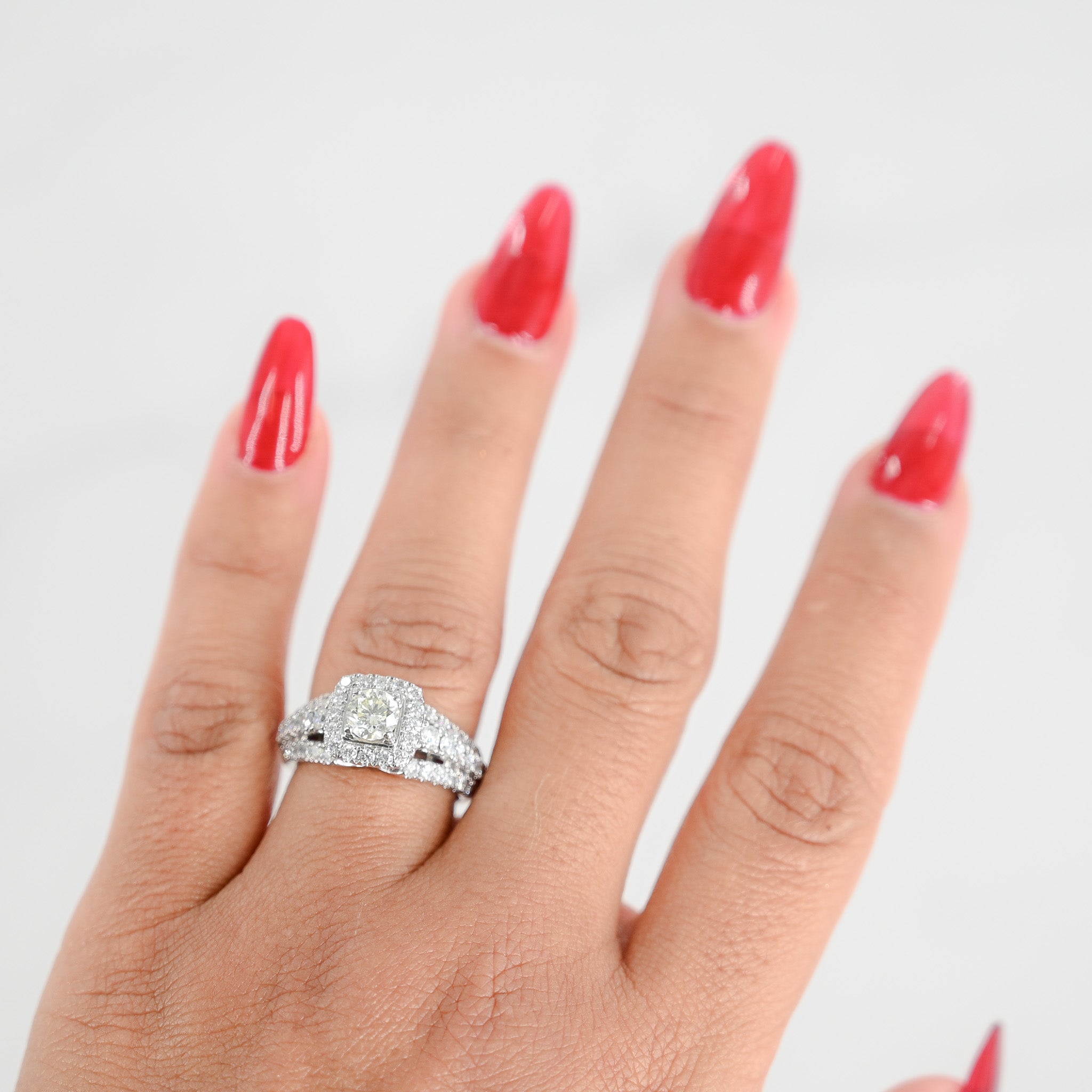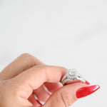 Elegant and timeless, our 14K White Gold Diamond Engagement Ring features a brilliant 0.56 Carat Round Cut center diamond surrounded by a stunning cluster of diamonds. This ring is the perfect symbol of your love and commitment.