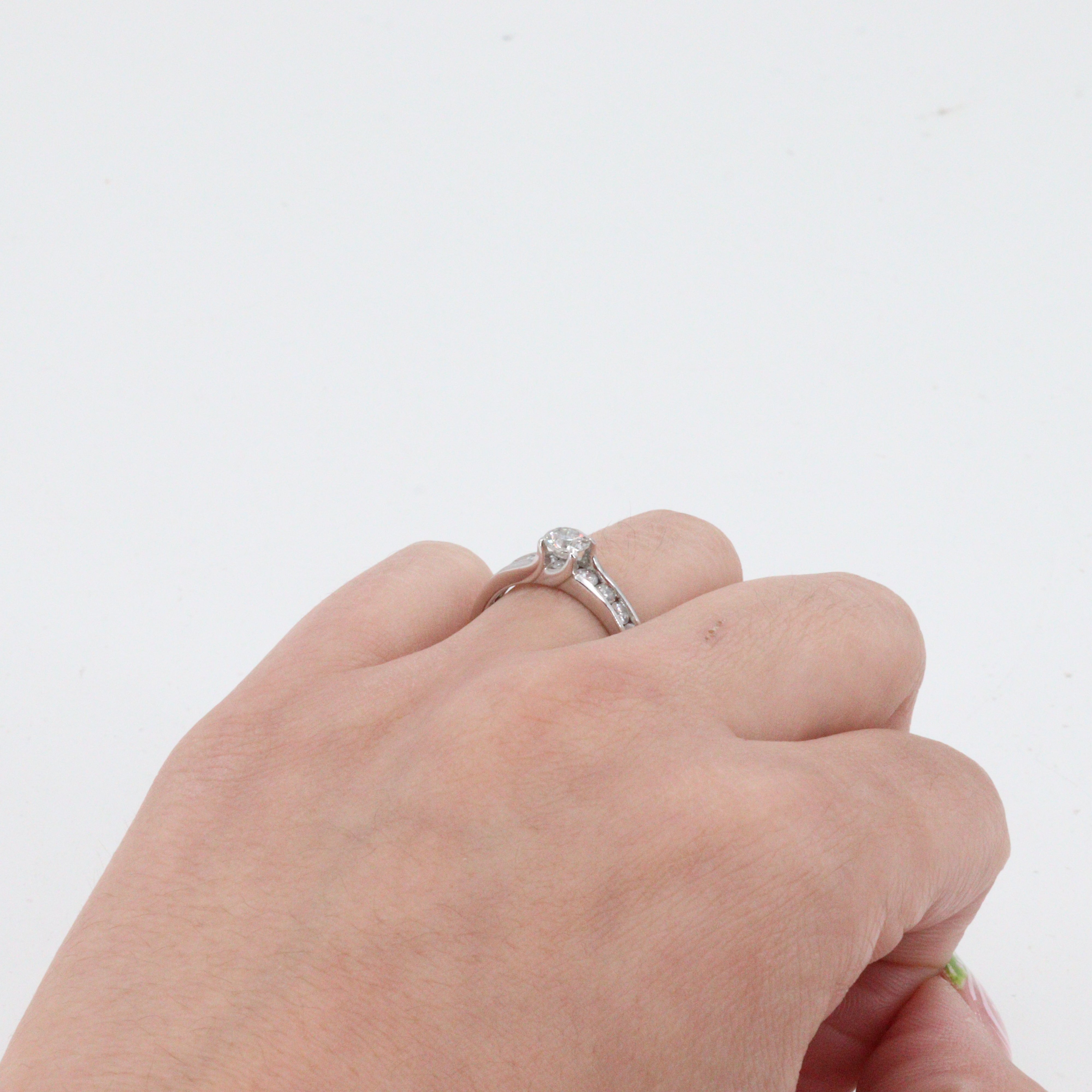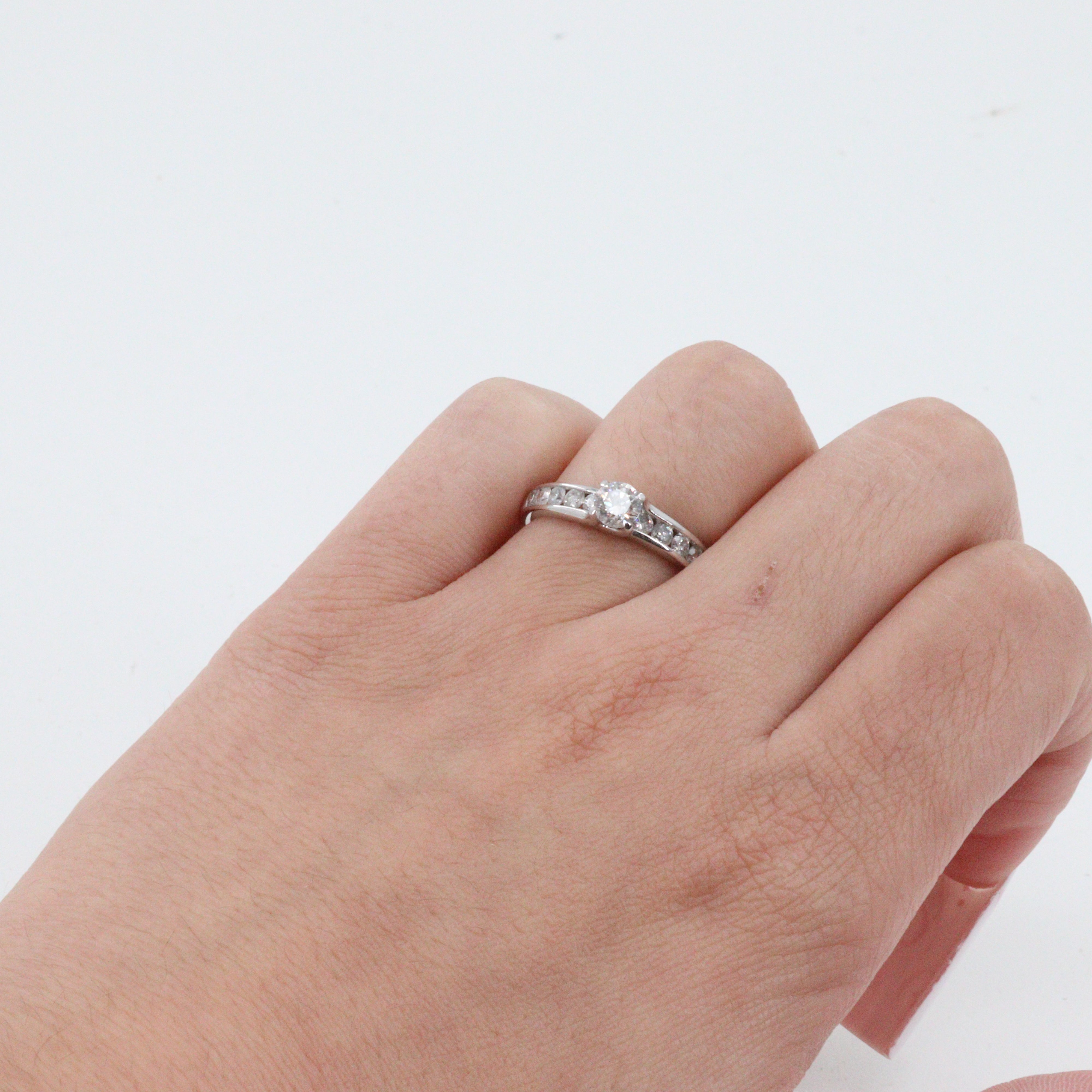 This 14k white gold engagement ring features a stunning solitaire diamond with accent diamonds. A brilliant 0.44 carat round brilliant cut center diamond, with I2 clarity and G-H color, takes center stage. Accenting the main diamond are 10 smaller round brilliant cut diamonds, each approximately 0.05 carats, with I2 clarity and H-I color. The combined total carat weight is approximately 0.94 carats. This ring, sized at 8 and weighing 2.9 grams, is a classic and elegant expression of love.