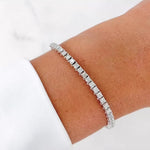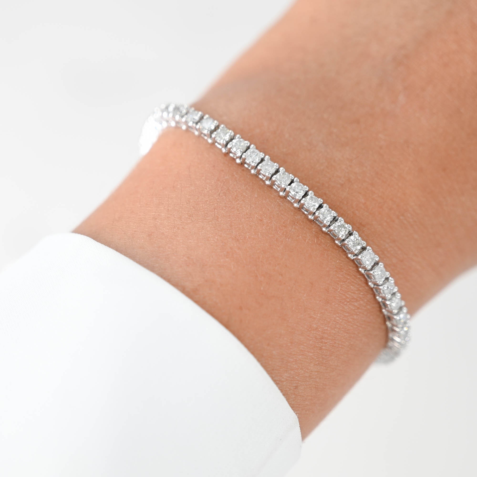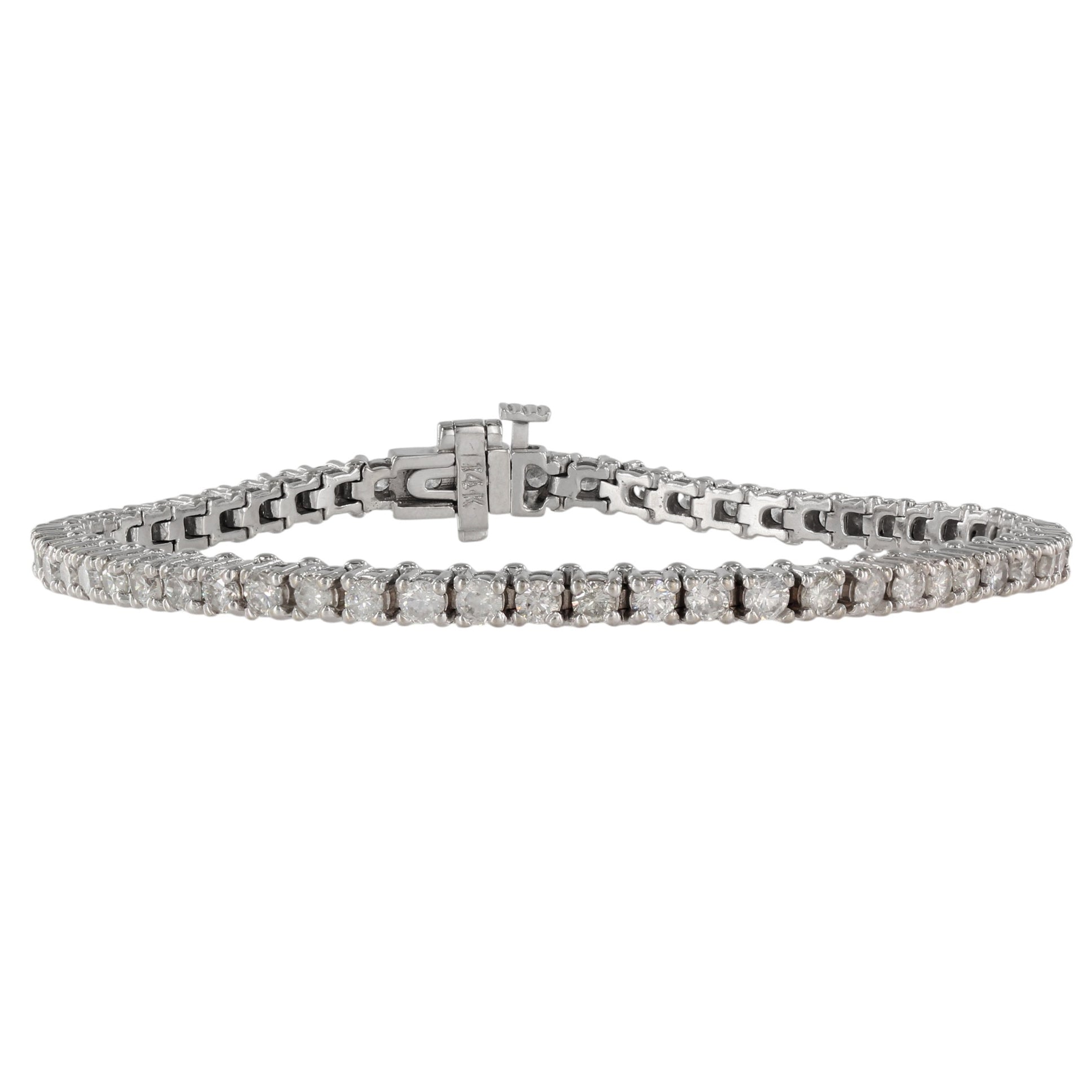 This elegant 14K white gold diamond tennis bracelet features five-pointers for a dazzling, timeless look. The delicate setting showcases sparkling diamonds that catch the light with every movement, making it a perfect piece for any occasion.