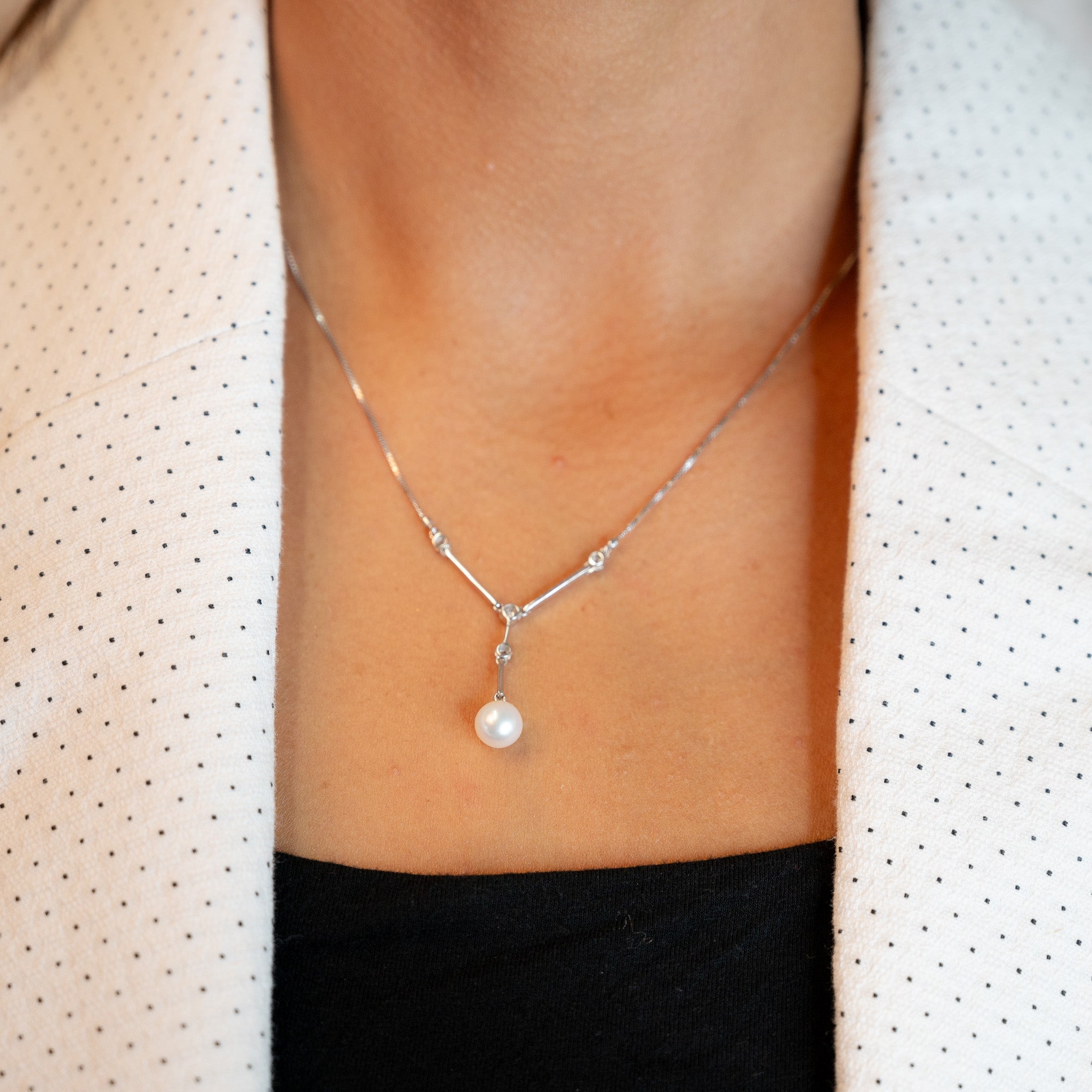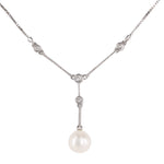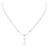 14k White Gold Pearl And Diamond Dangling Milgrain Bar Pendant Necklace