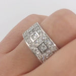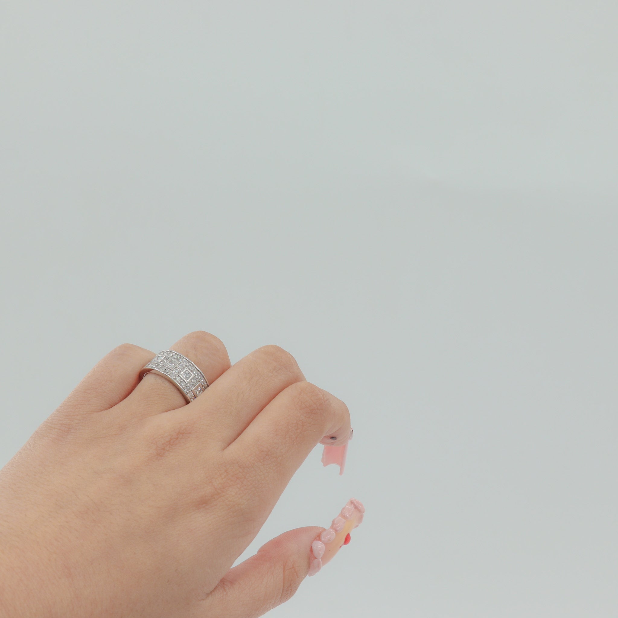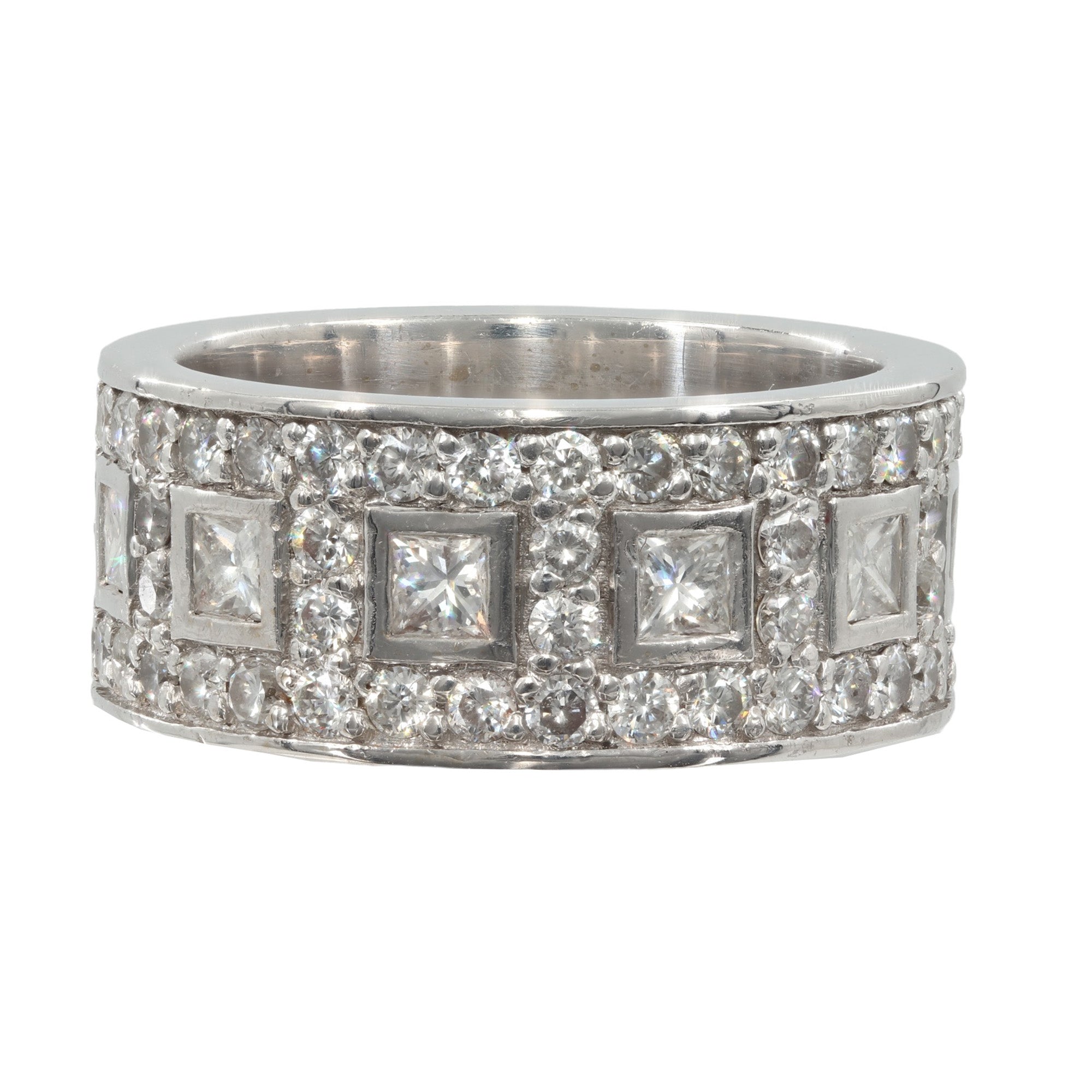 Adorn your hand with opulence and glamor wearing the 14k White Gold Princess and Brilliant Cut Diamond Band. With a substantial band size of 9.3mm, a diameter of 22.5mm, and designed for a ring size of 7.5, this exquisite piece is a true statement of luxury. The band is adorned with 10 princess cut diamonds, each boasting 0.08ct, and complemented by 86 accent round cut diamonds, each with 0.02ct, resulting in a grand total carat weight of 2.6ctw. The princess cut stones exhibit an SI2 clarity, while the round cut diamonds showcase an I1 clarity, both falling within the H-I color range. Crafted in brilliant 14k white gold, this ring weighs a substantial 11.4g, making it a perfect embodiment of elegance and sophistication. Elevate your jewelry collection with this resplendent diamond band, a true testament to enduring beauty and style.