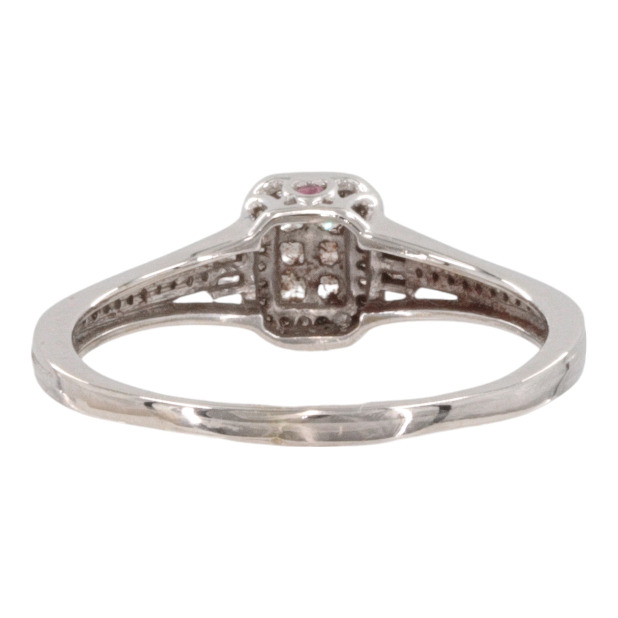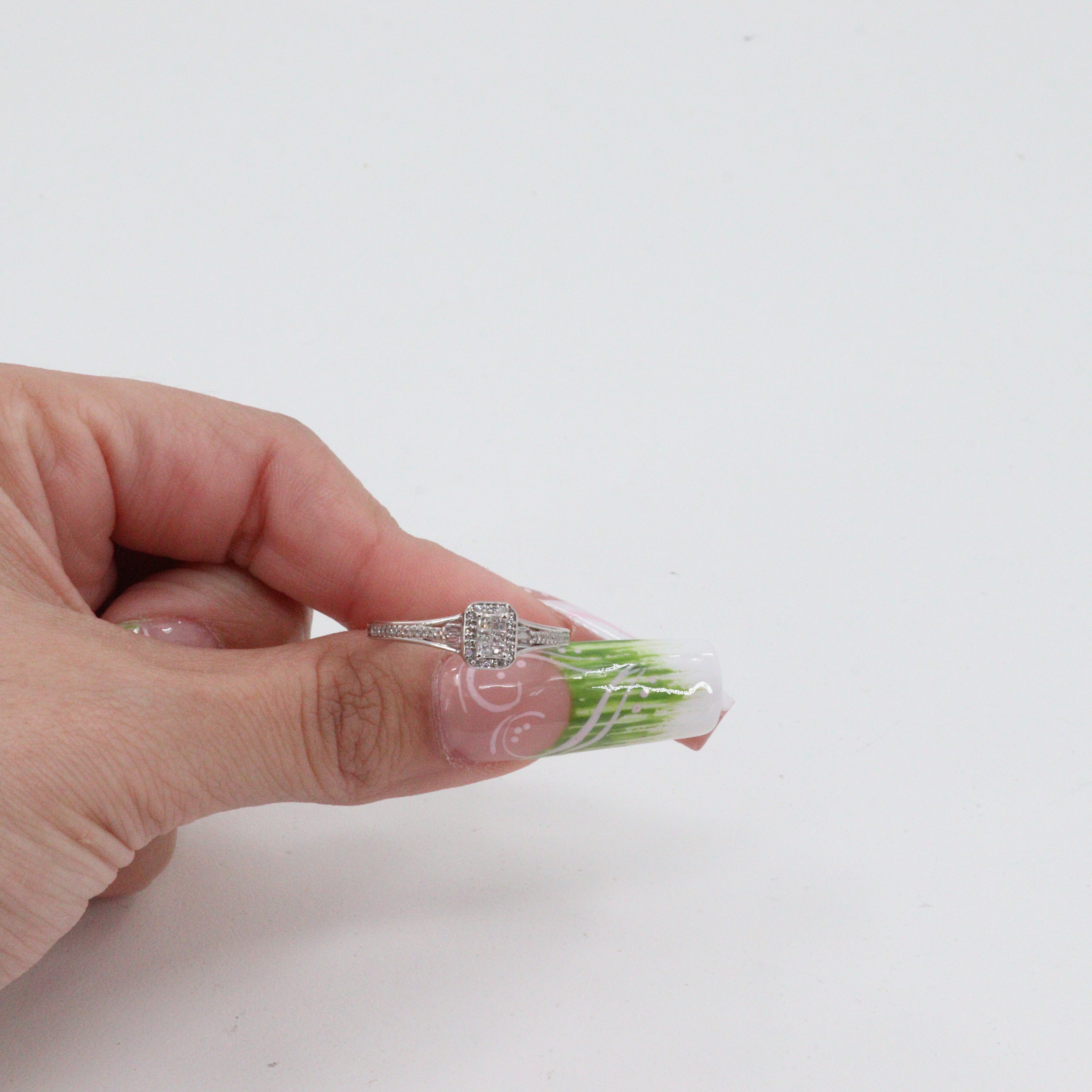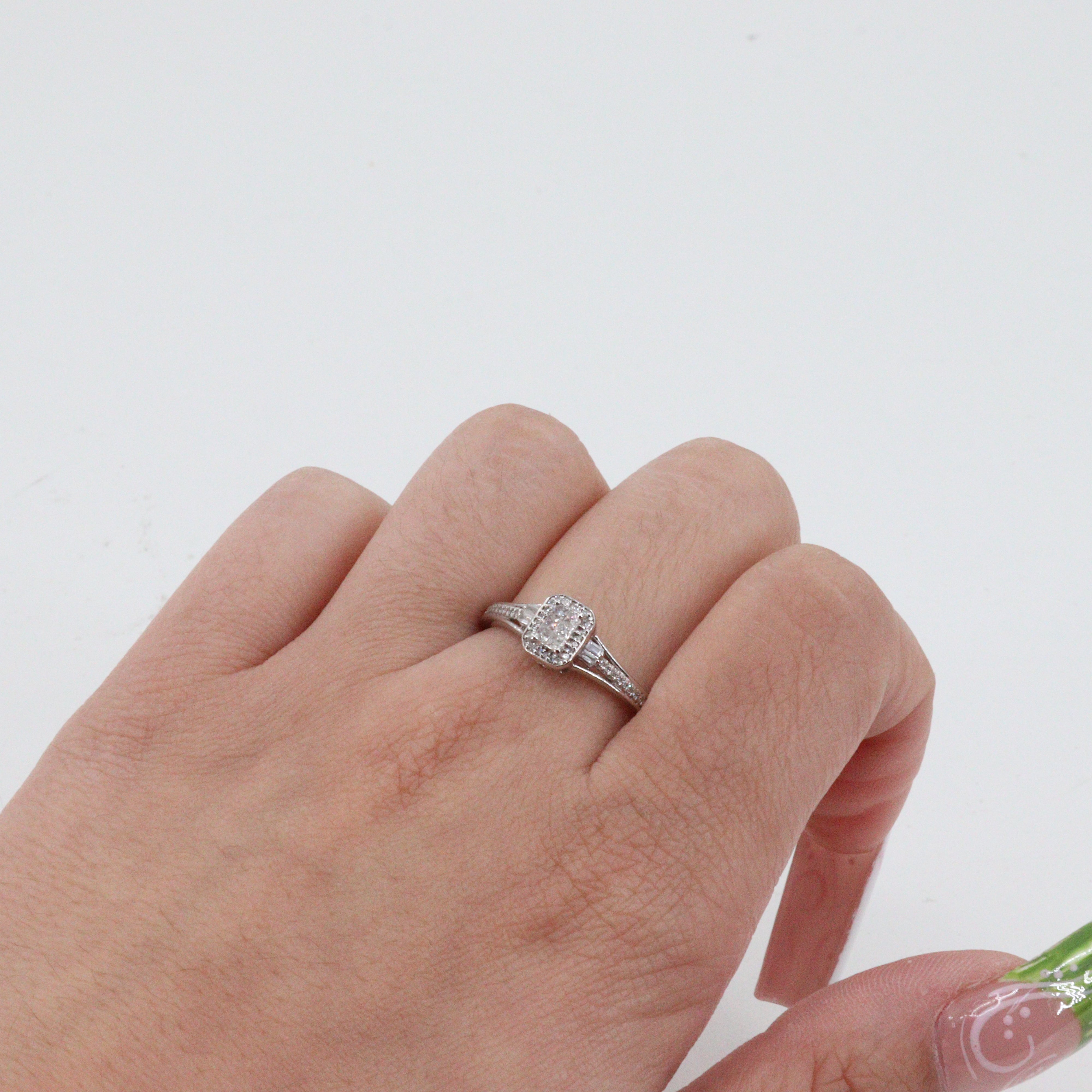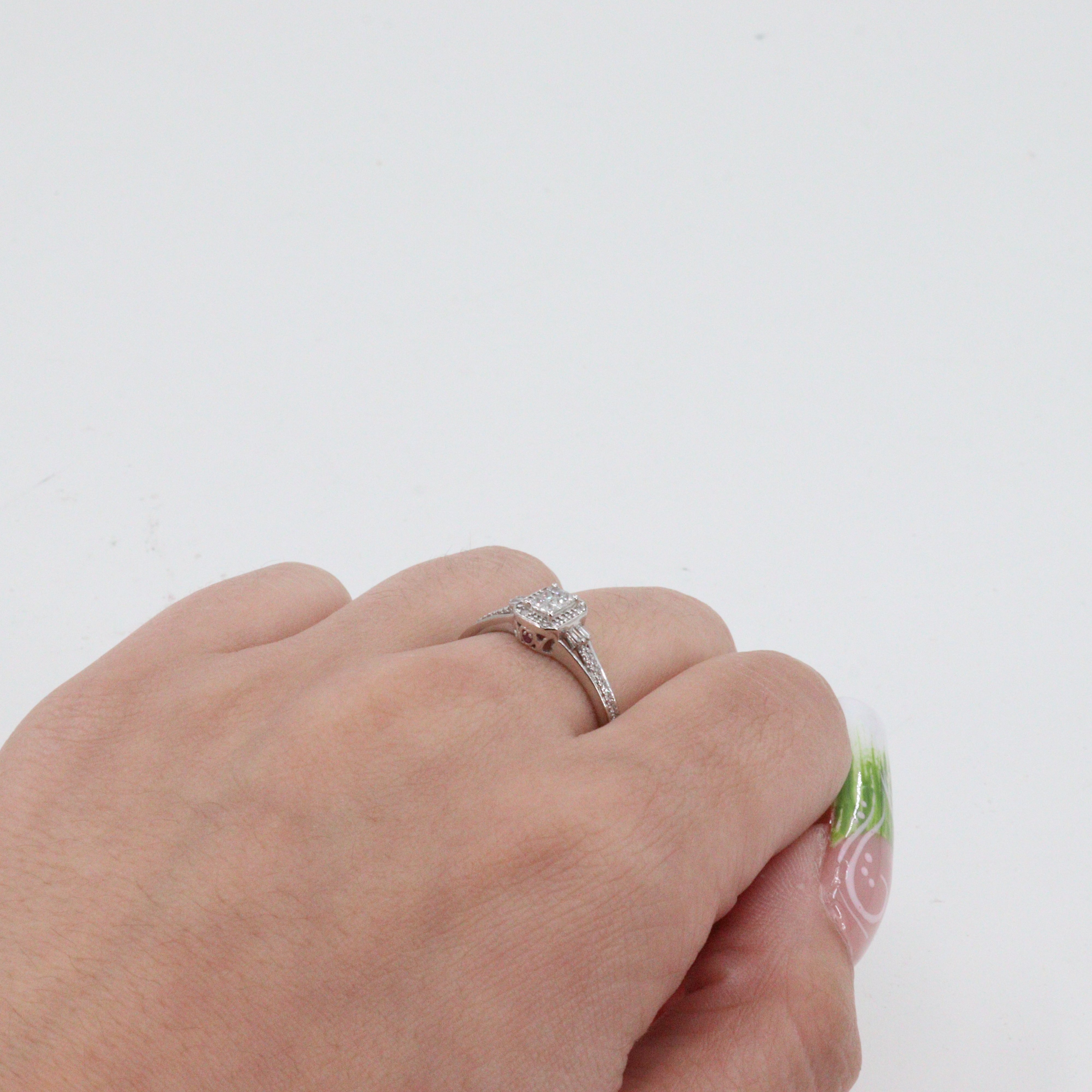 This 14k white gold ring features a stunning cluster of diamonds. A center princess cut diamond is surrounded by 6 smaller princess cut diamonds, 4 baguette cut diamonds, and 26 round brilliant cut diamonds. With a total carat weight of 0.16 carats, the diamonds, boasting I2 clarity and H-I color, create a brilliant display of light and sparkle. This ring, sized at 9.5 and weighing 2.2 grams, offers a sophisticated and elegant design