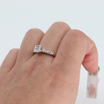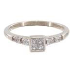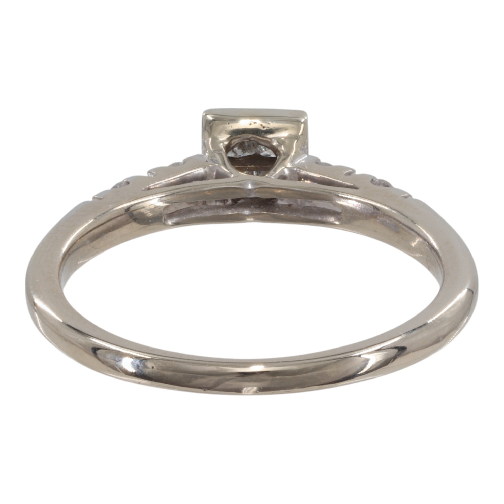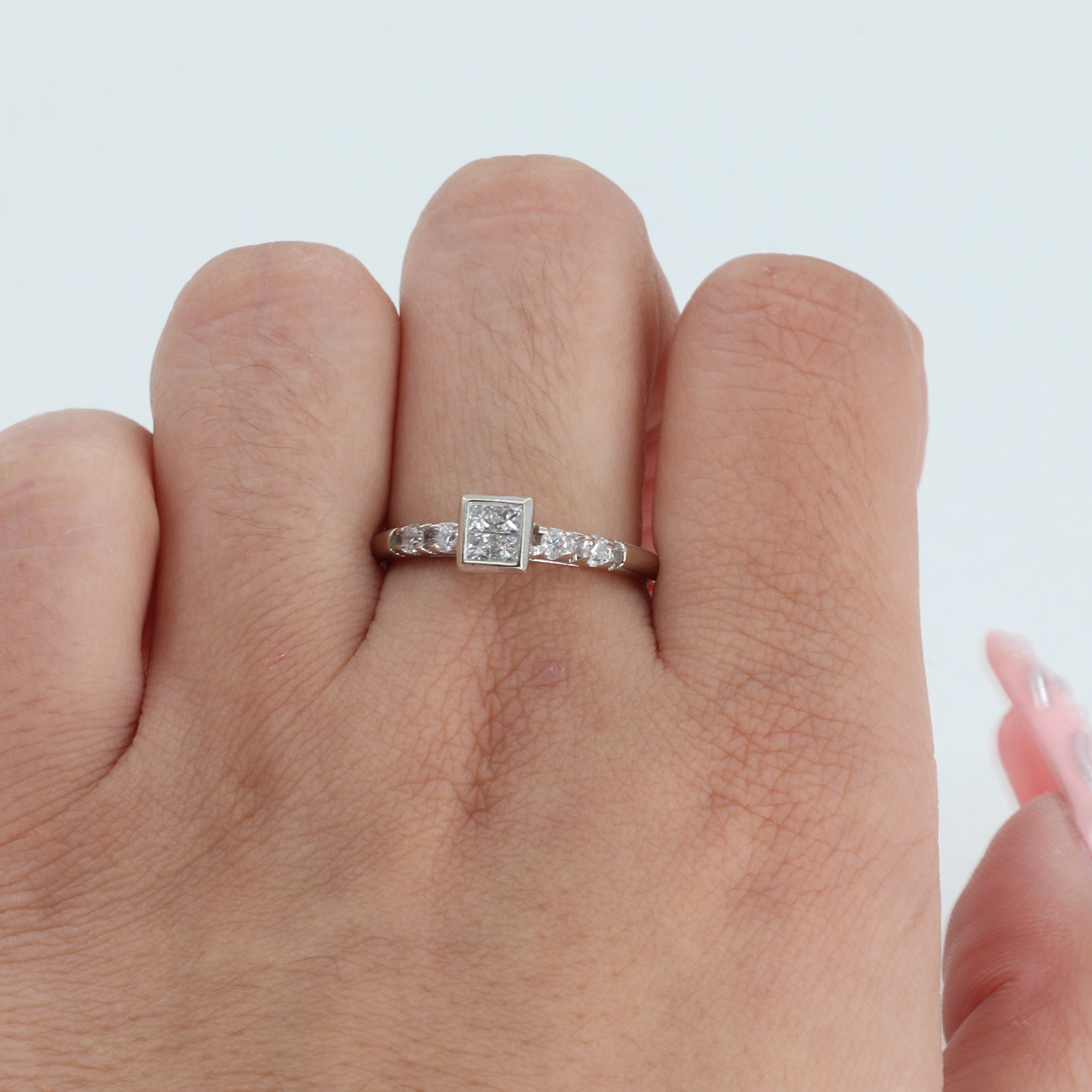 This 14k White Gold Princess Cut Diamond Engagement Ring exudes timeless elegance. Featuring a 5.8mm head with four princess-cut center diamonds (0.015ct each) and four accent round brilliant diamonds (0.03ct each), this ring shines with grace. Crafted in 14k white gold, it has an elegant 1.9mm shank, showcasing diamond clarity from I1 to I2 and color grades of G-I. This size 9 ring, weighing 3.5g, is an exquisite choice for a memorable commitment.