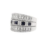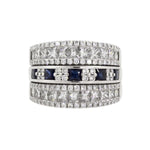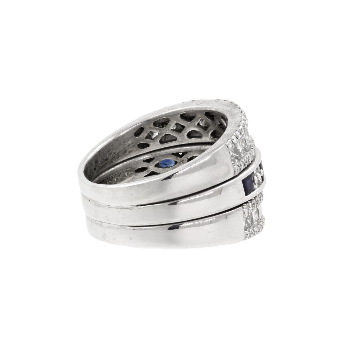 This gorgeous piece features the look of three rings, with channel-set rows of princess cut diamonds encompassing a center row of sapphires and round diamonds. This features a total of 96 round diamonds(0.005ct each), and 5 blue sapphires (0.20ct each), all accenting 22 pristine channel-set princess cut diamonds(0.10ct each). This leaves this ring with a total diamond weight of 2.68ct and an overall gem weight of 3.68ctw.