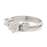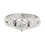 This gorgeous ring features a 0.88ct diamond in a 6-prong setting. This simple centerpiece is accented by a band featuring two 0.25ct princess cut diamonds. This set has an overall diamond weight of 1.38ctw.
