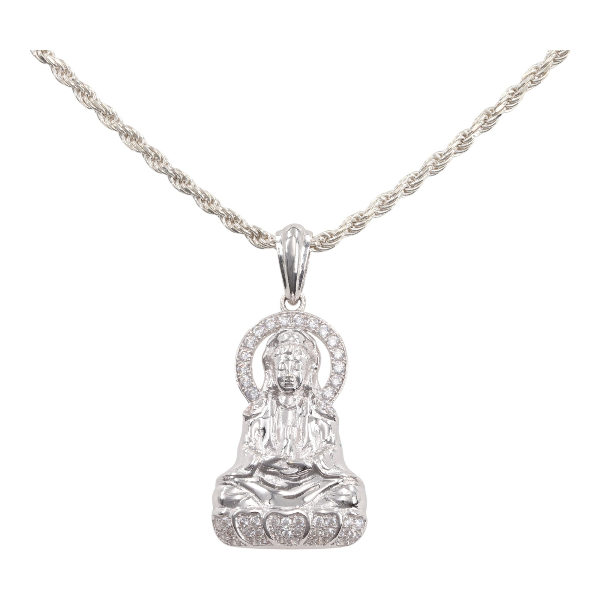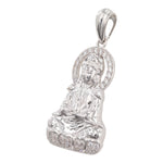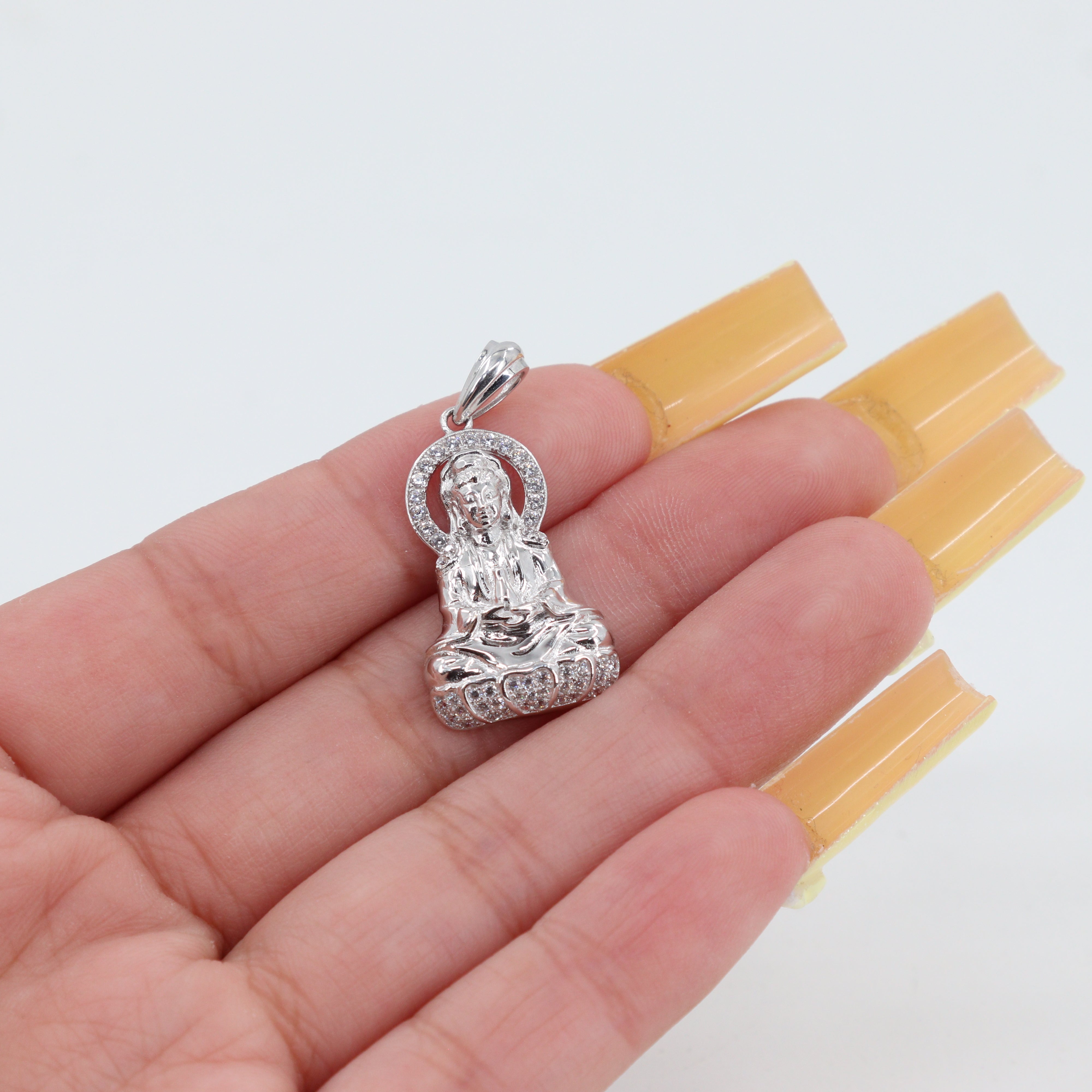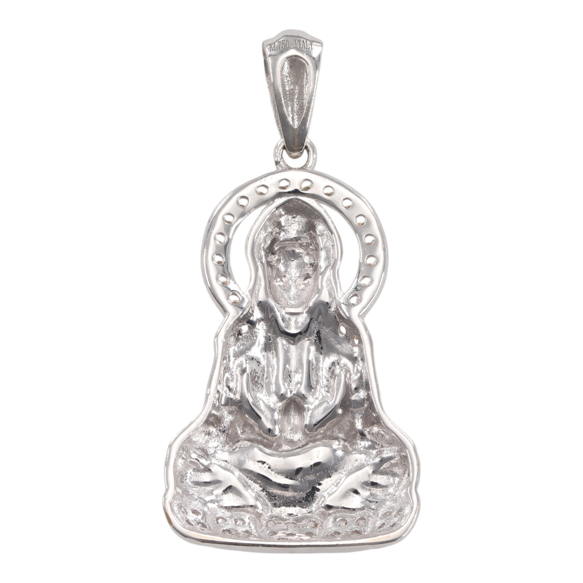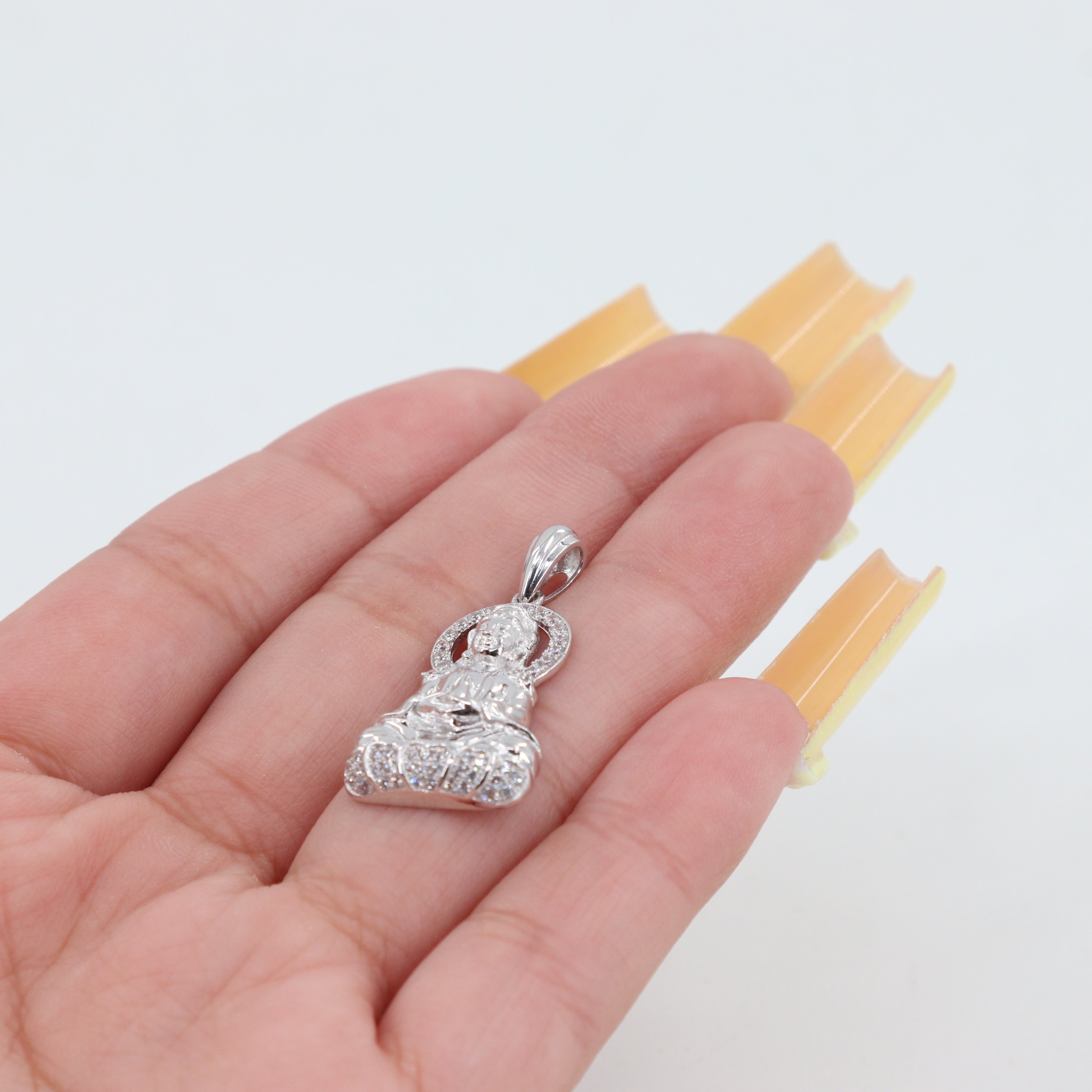 Bring peace and brilliance to your collection with this 14k White Gold & Topaz Buddha Pendant. Featuring 46 round cut topaz stones (approx. 0.46ctw), this serene piece measures 33.5mm long and 15.75mm wide. Crafted in polished white gold and weighing 3.5g, it’s a spiritual statement of elegance and calm.