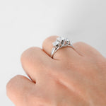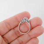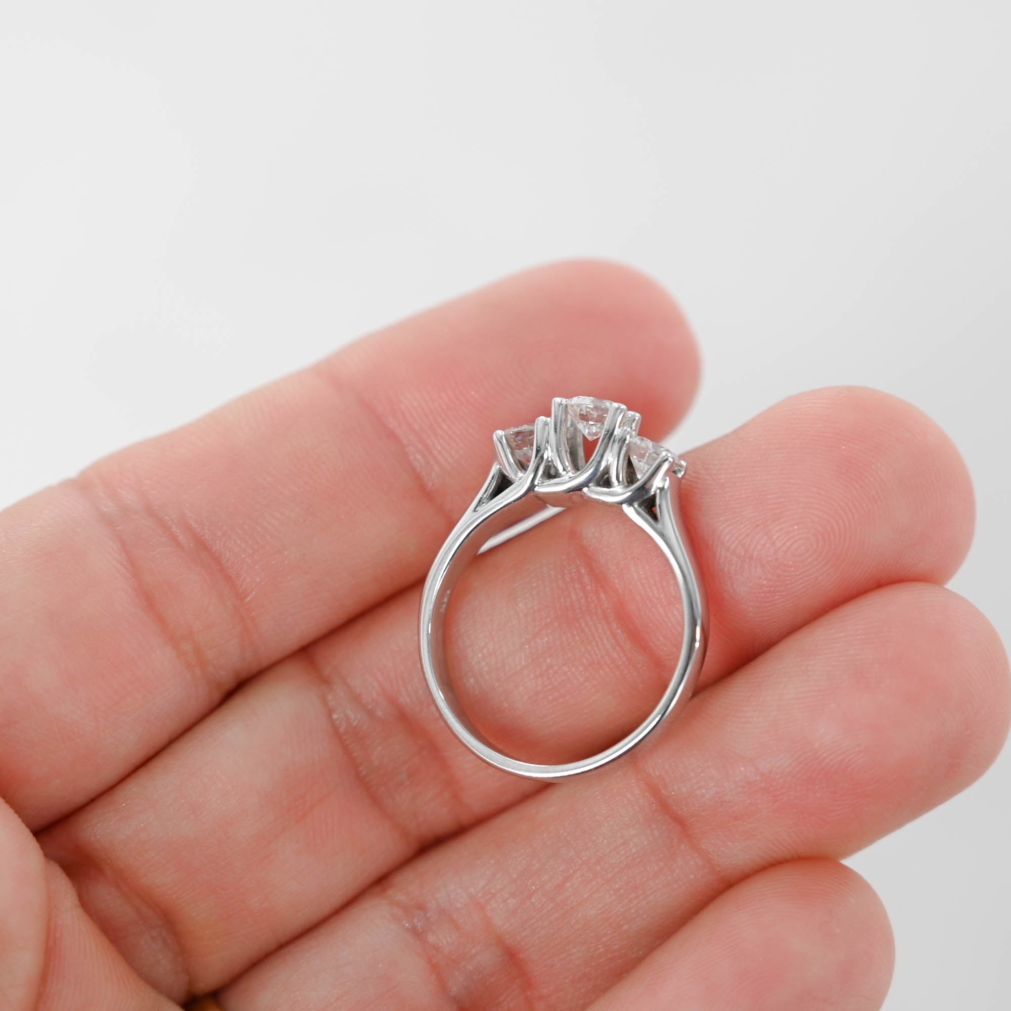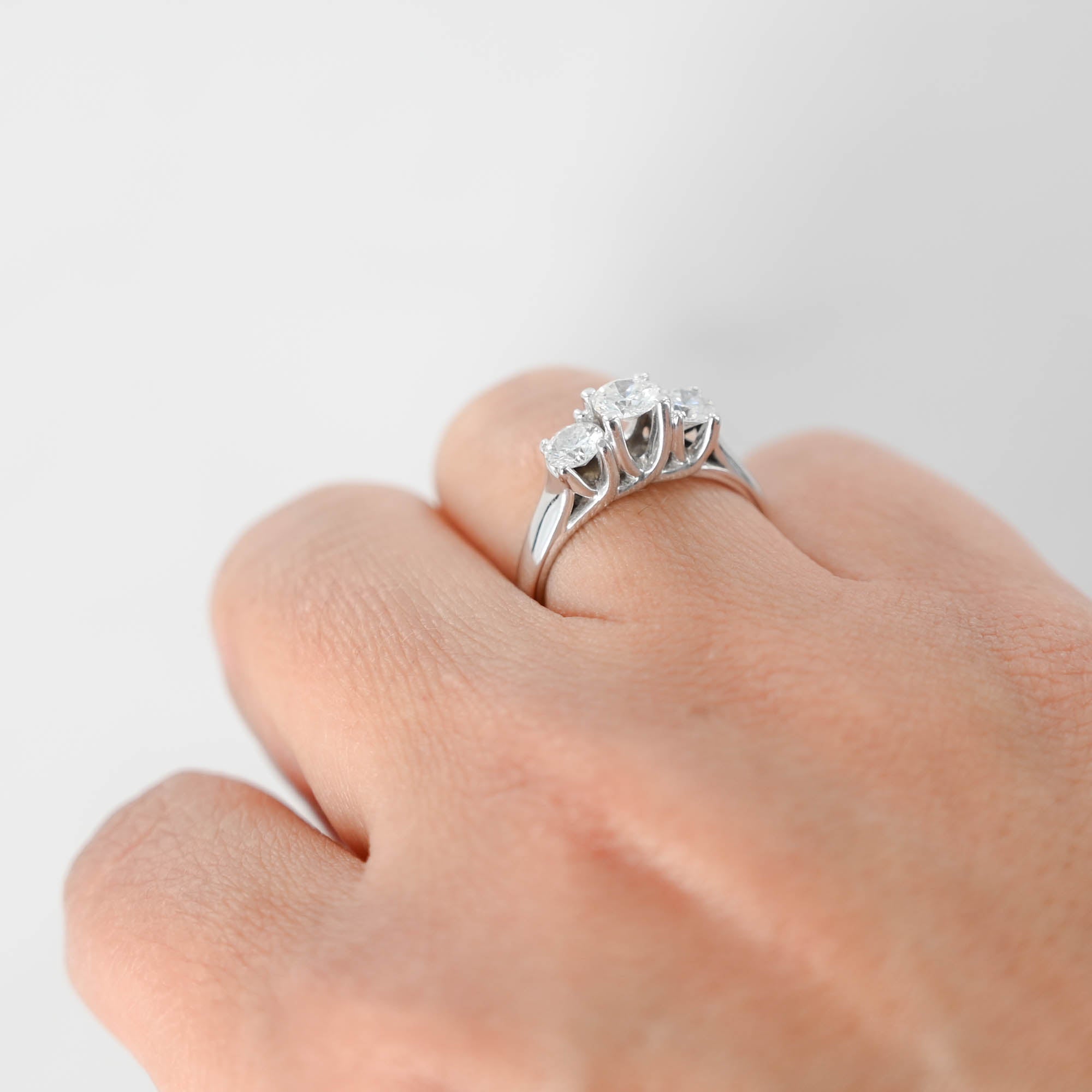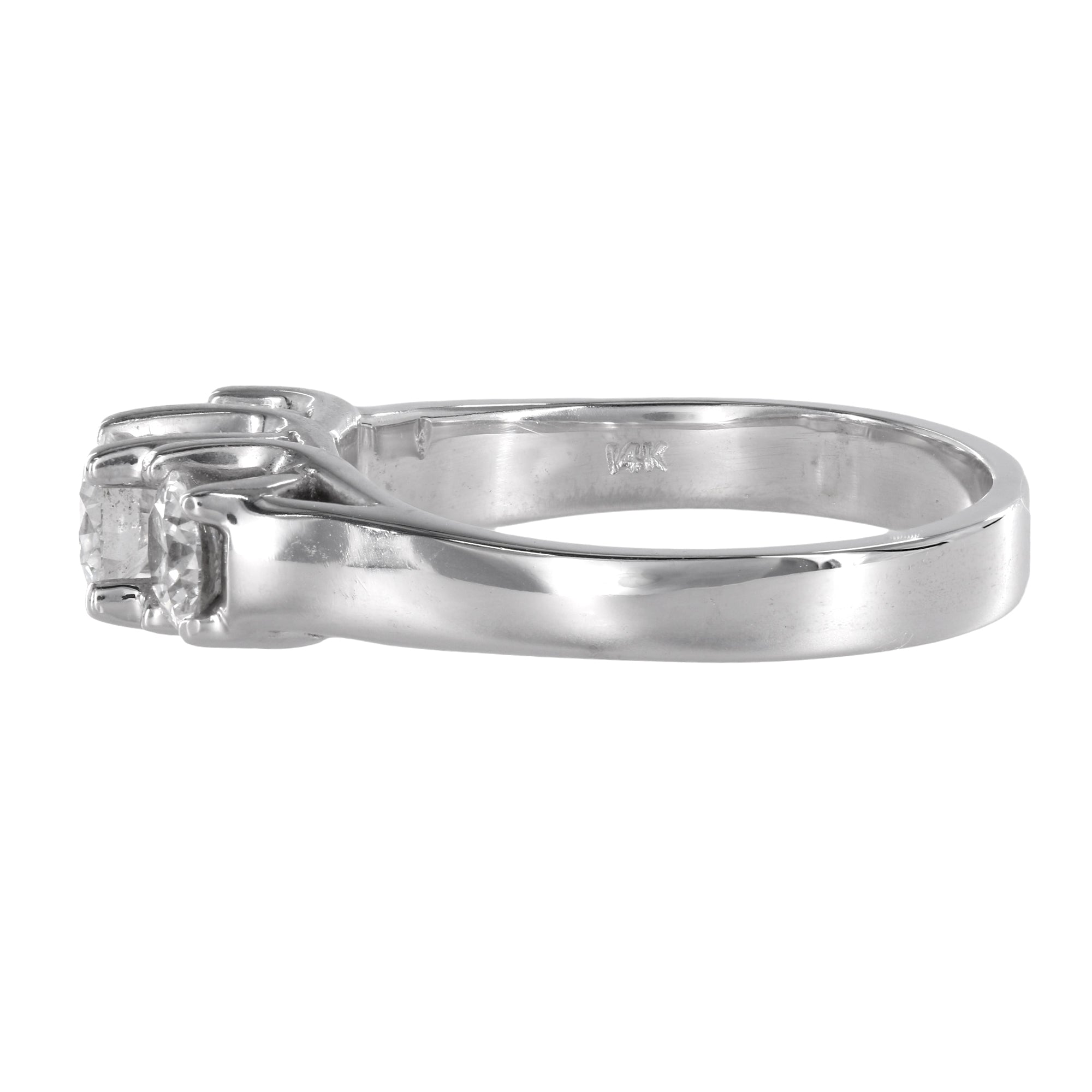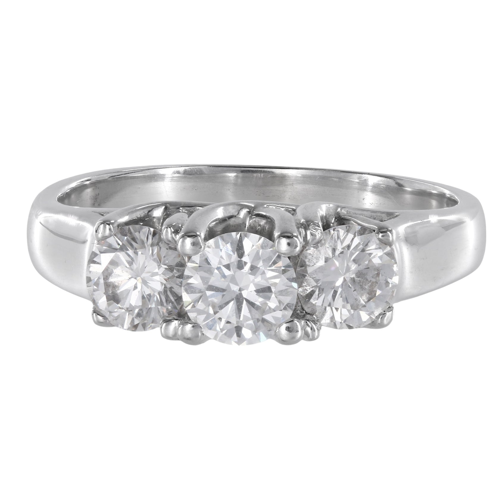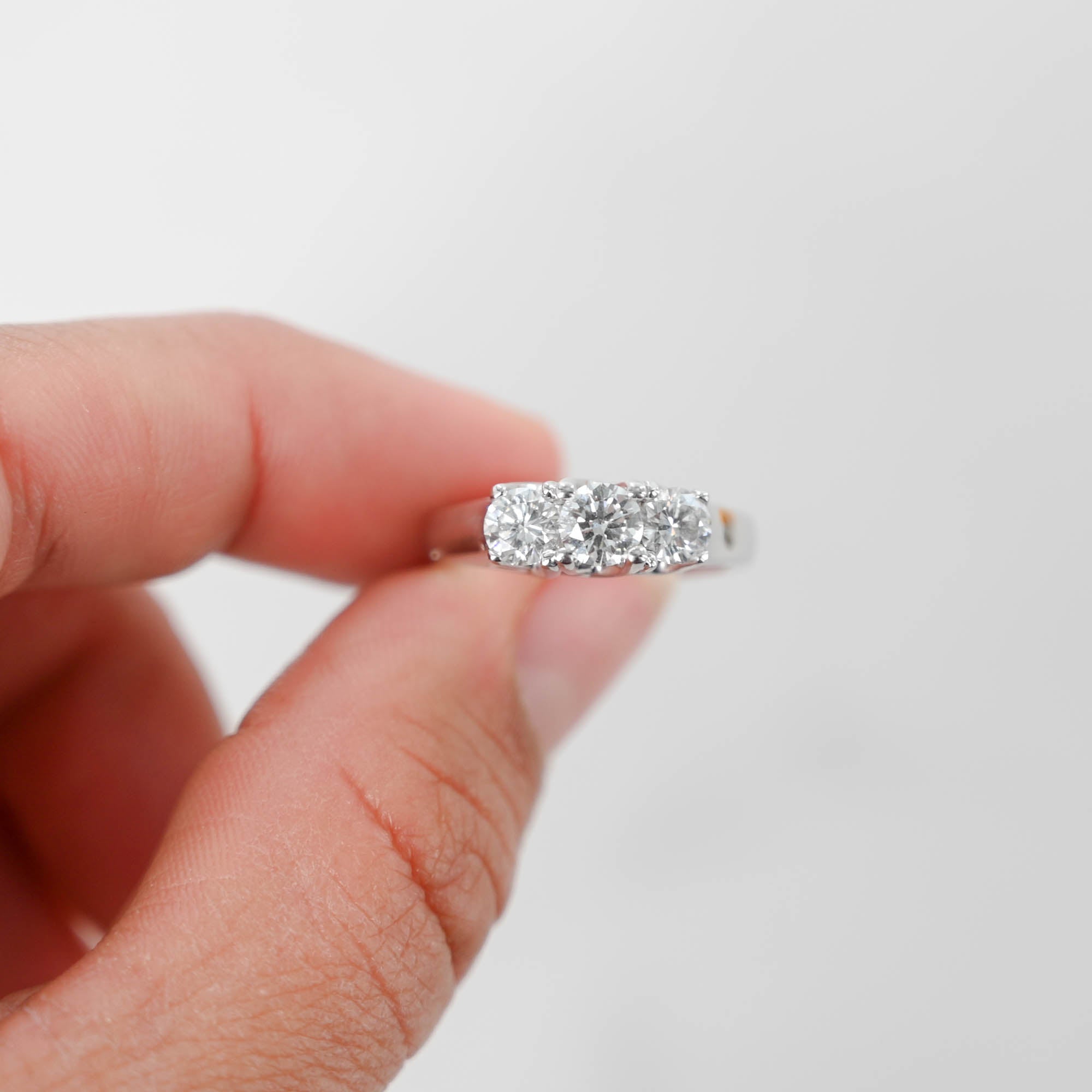 Immerse yourself in the elegance of this 14k White Gold Triple Trellis Set Diamond Ring. Its exquisite design showcases a captivating 0.44ct round brilliant-cut diamond at the center, flanked by two dazzling diamonds weighing 0.36ct each. With a total carat weight of 1.16ctw, this ring is a timeless symbol of sophistication.