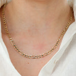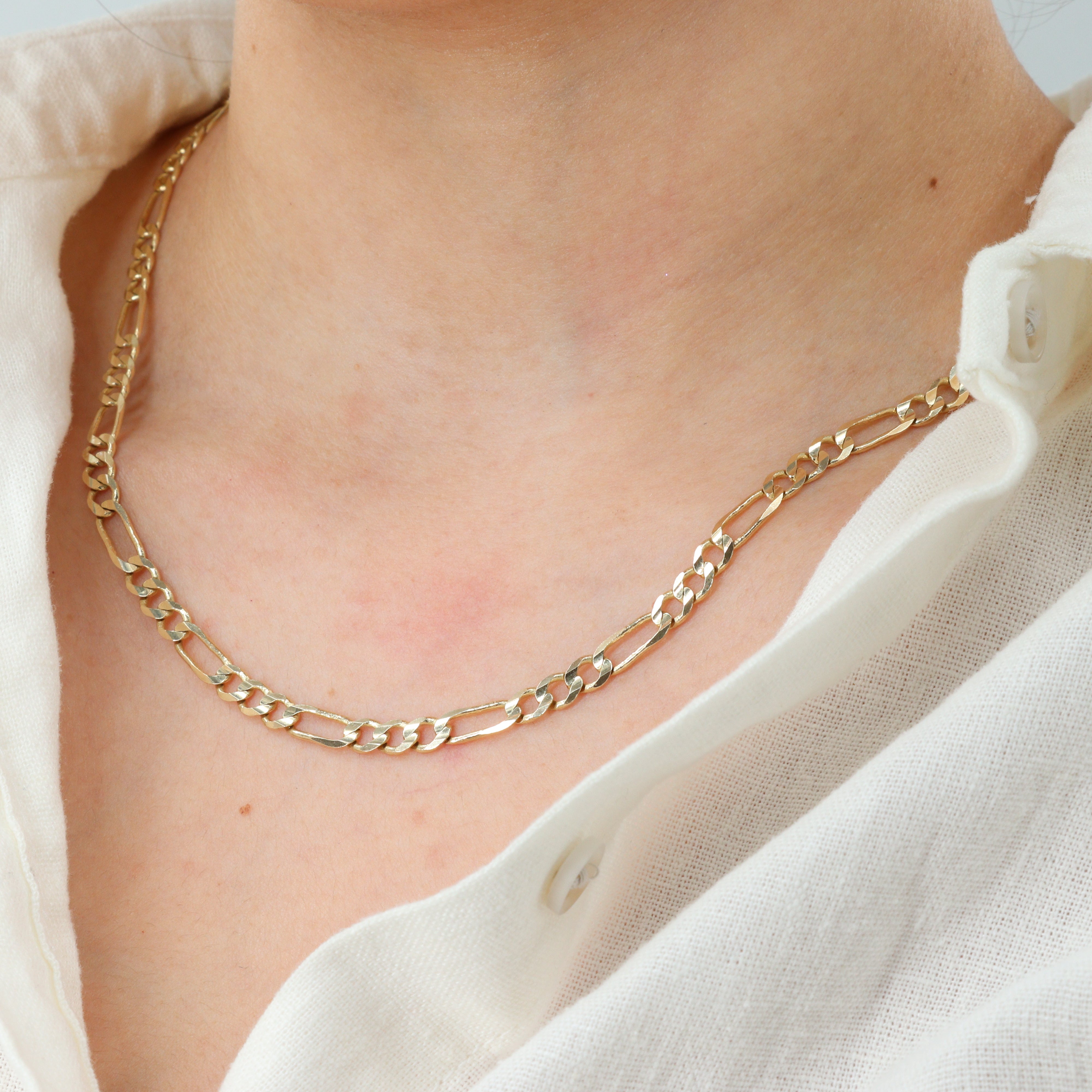 This substantial 24-inch Figaro link chain is crafted from 14k yellow gold. The classic Figaro design, characterized by alternating patterns of flattened links, measures a noticeable 4.8mm in width. Secured with a sturdy lobster clasp and weighing a substantial 18.3 grams, this chain is a versatile and stylish piece that can be worn alone as a statement or paired with your favorite pendant for a personalized look.