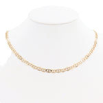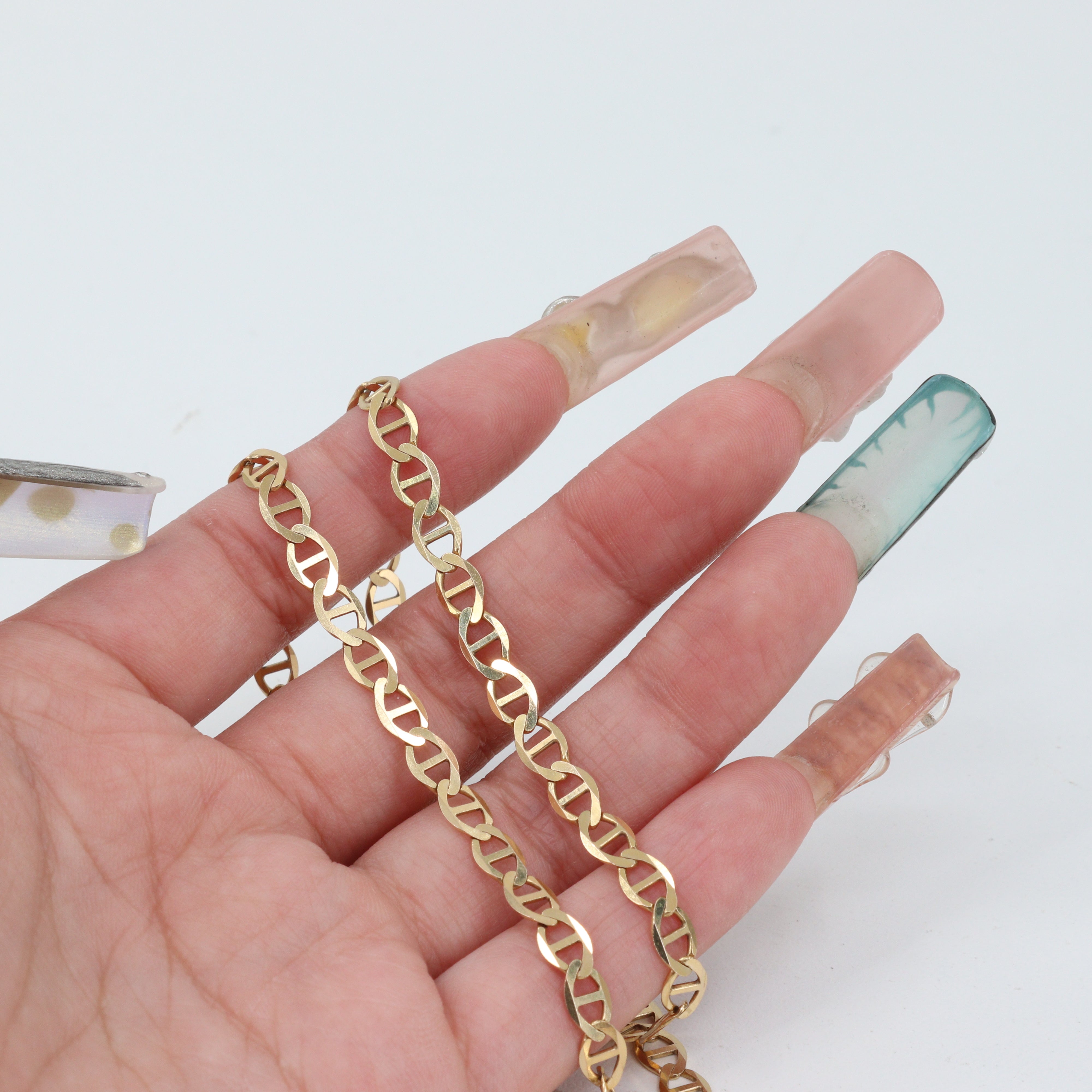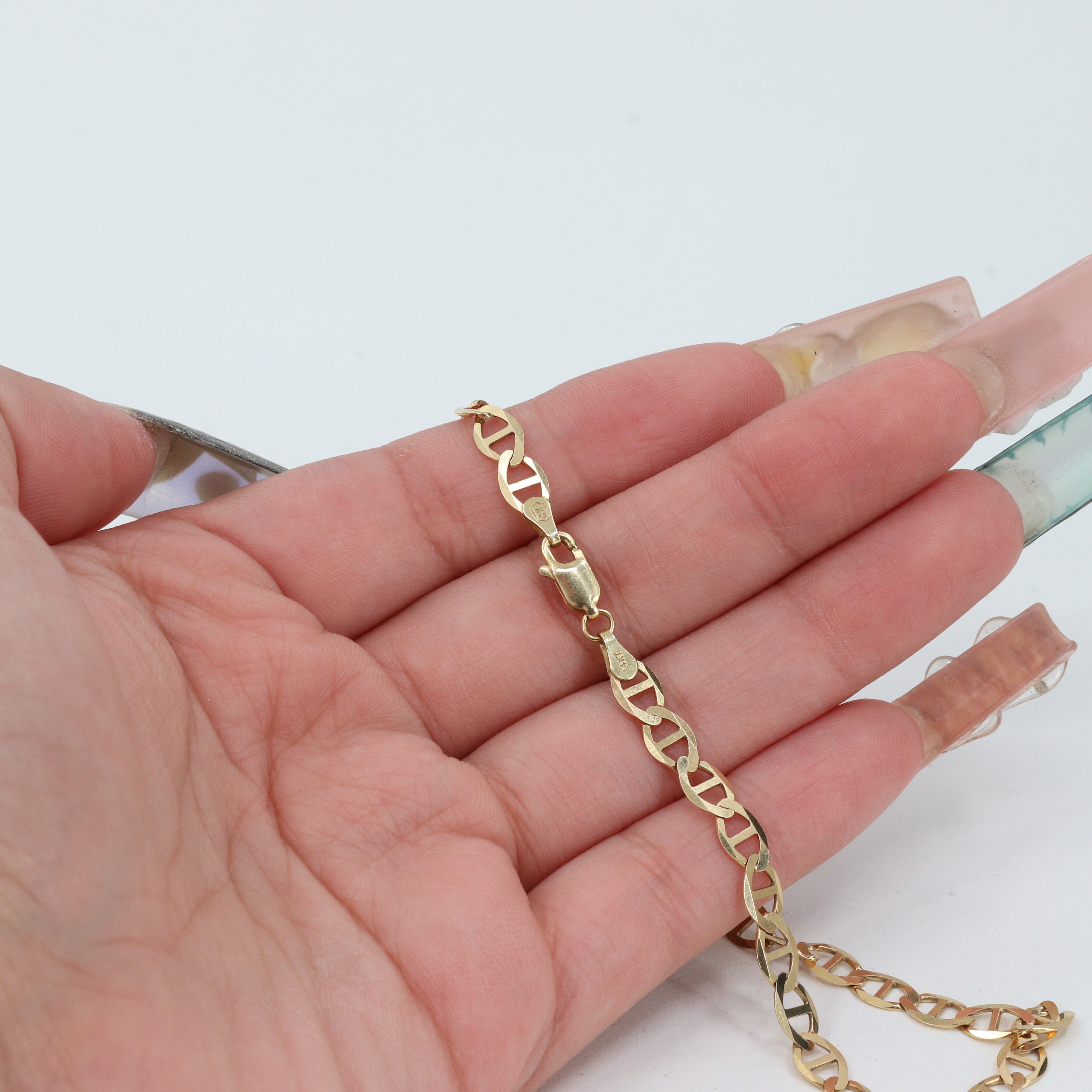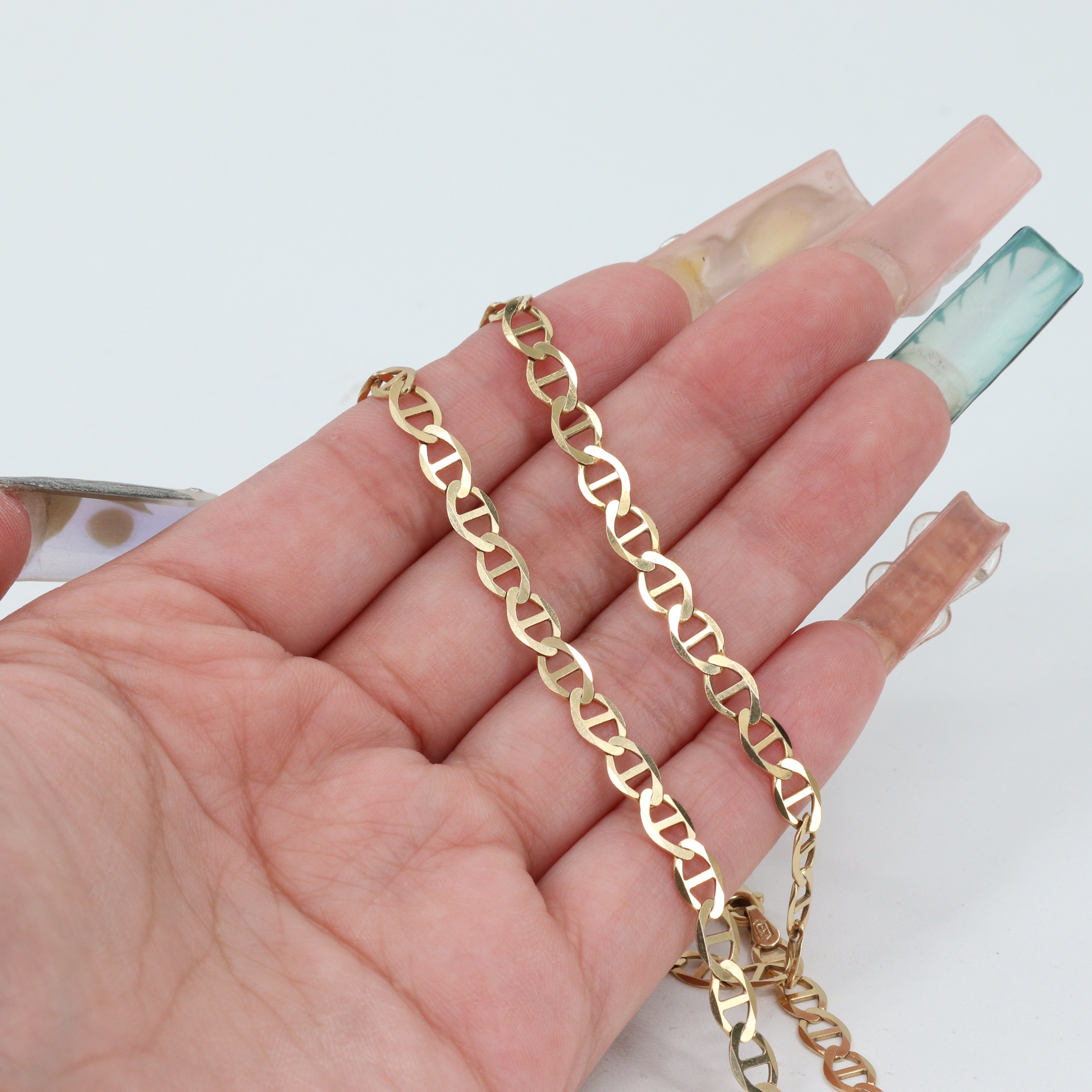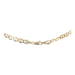 This substantial 24-inch mariner link chain is crafted from 14k yellow gold. The distinctive interlocking oval links, each measuring 5mm in width and featuring a horizontal bar across the center, create a bold and classic look. Secured with a durable lobster clasp and weighing 12.9 grams, this chain is a statement piece that can be worn alone or with a favorite pendant.