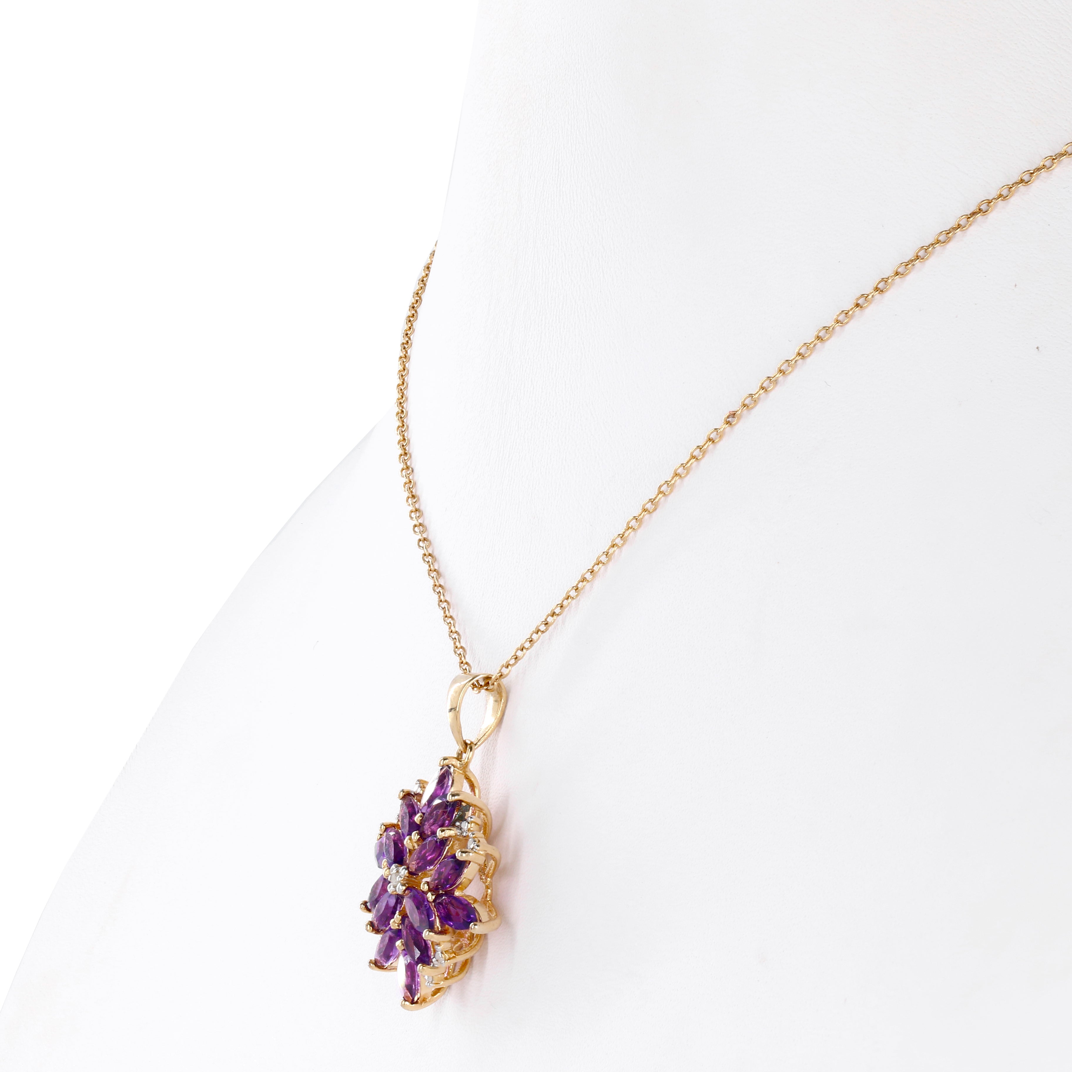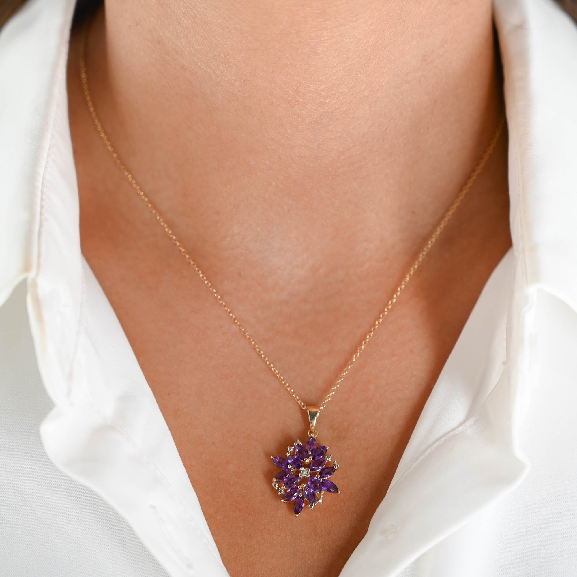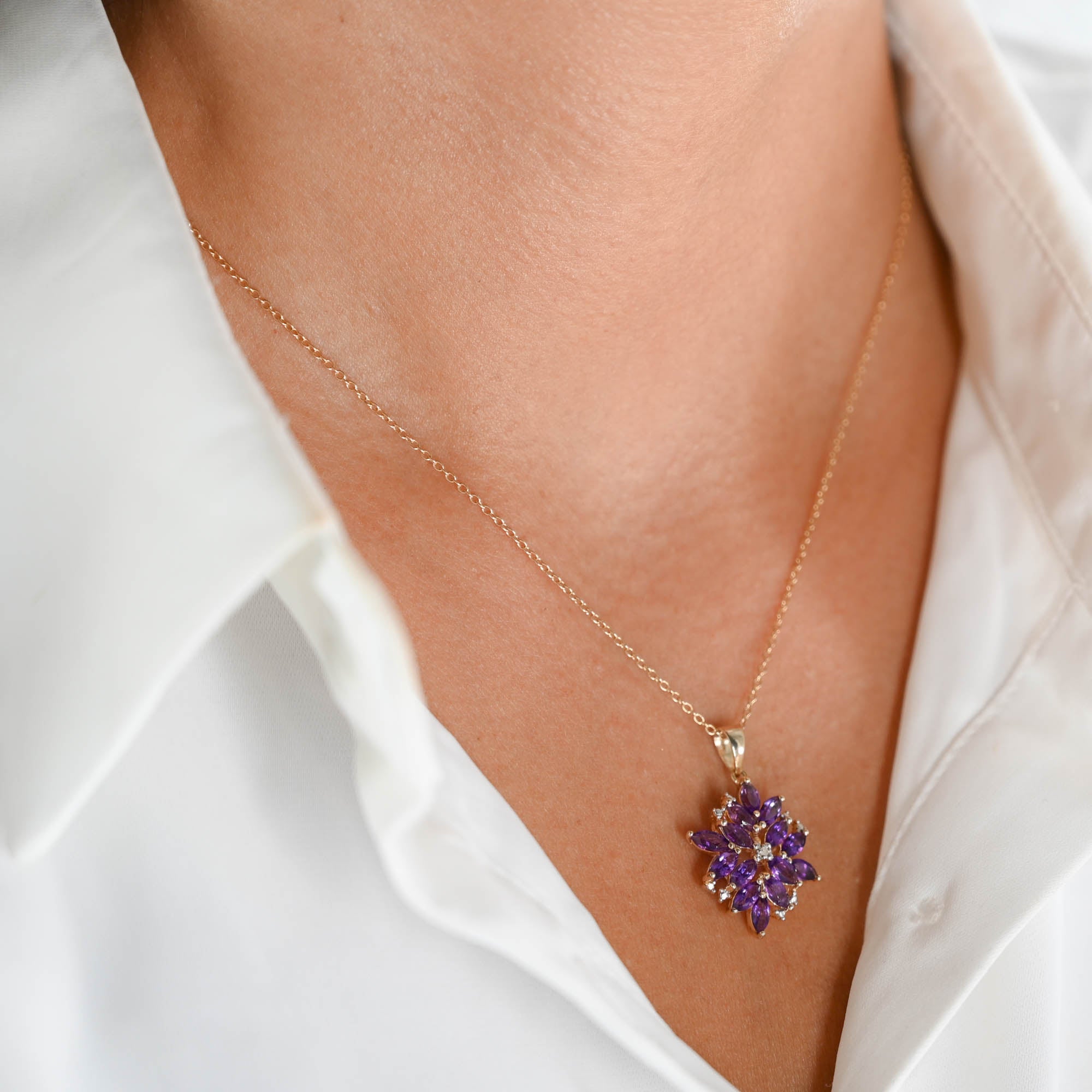 This enchanting 14K Yellow Gold Amethyst and Diamond Flower Charm Rolo Link Necklace is a stunning addition to any jewelry collection. Featuring a beautifully crafted flower charm adorned with vibrant amethyst and sparkling diamonds, this necklace exudes elegance and charm.