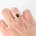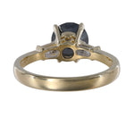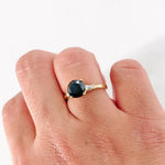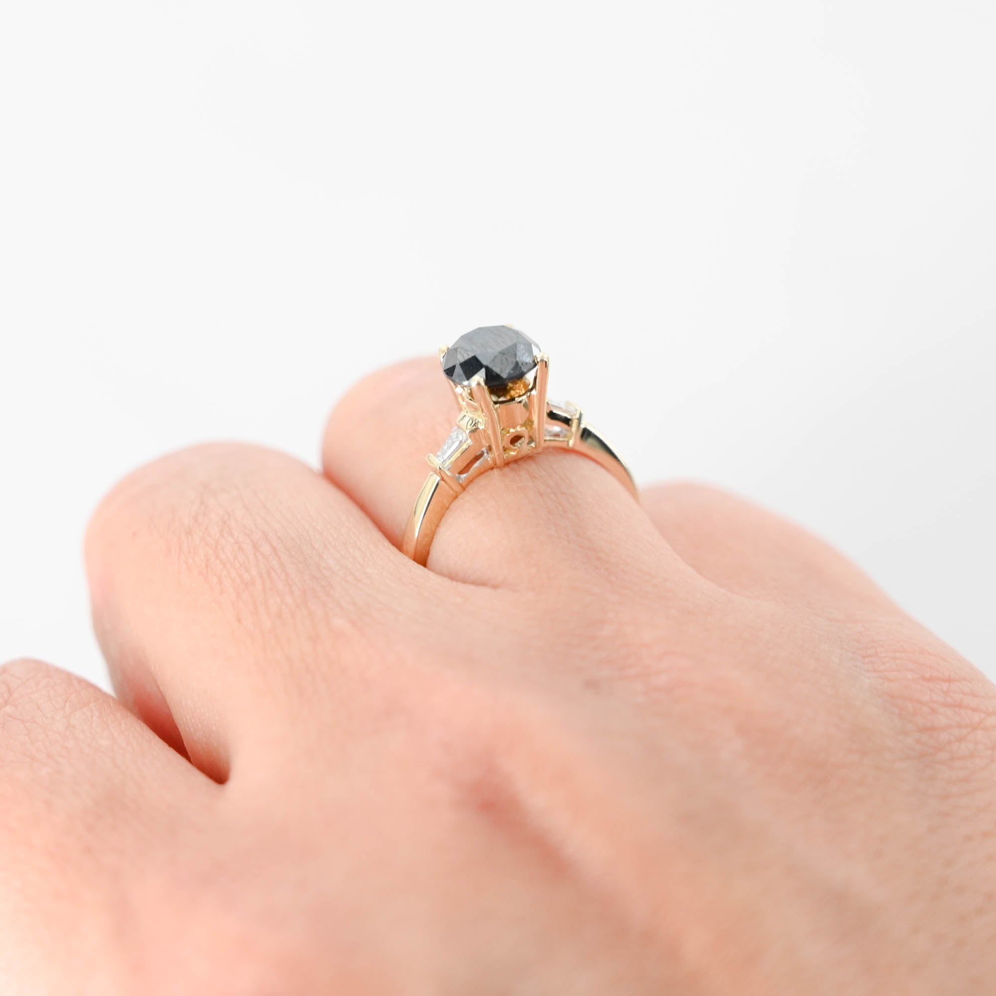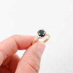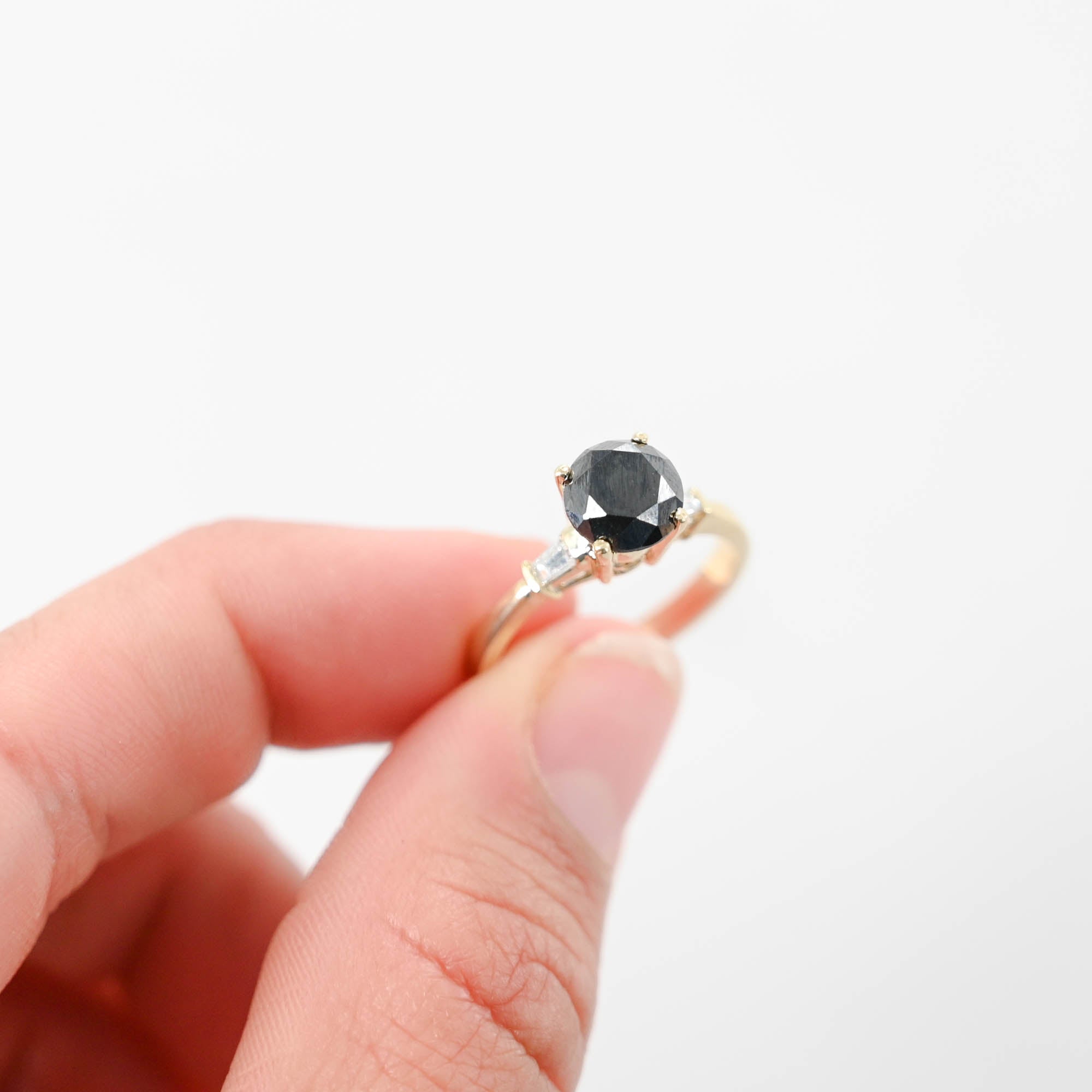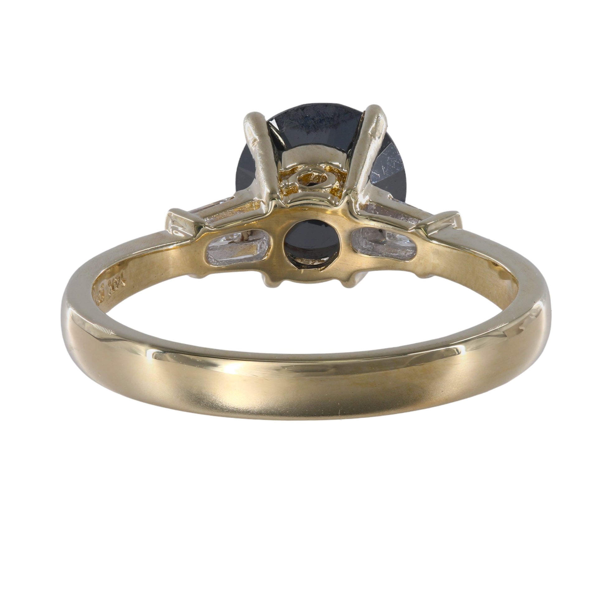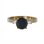This ring features a striking round-cut black diamond as the focal point, exuding sophistication and allure. The addition of accent baguette diamonds enhances the ring's elegance and adds a touch of sparkle to the design. Made from high-quality 14k yellow gold, this ring boasts both durability and timeless beauty. Whether worn as an engagement ring, anniversary gift, or statement piece, this ring is sure to captivate attention and make a bold statement.