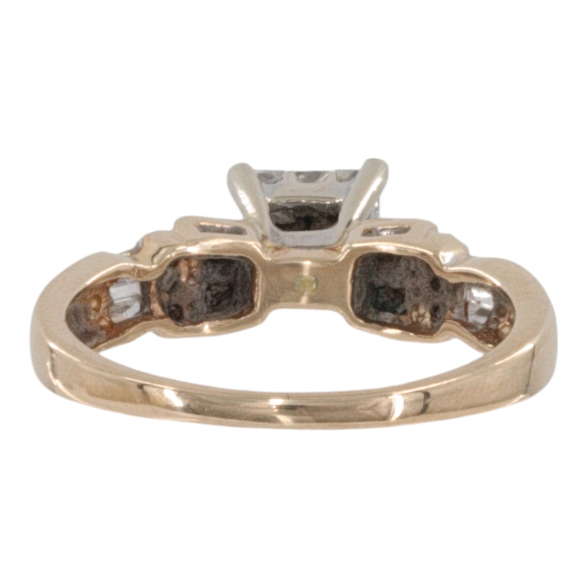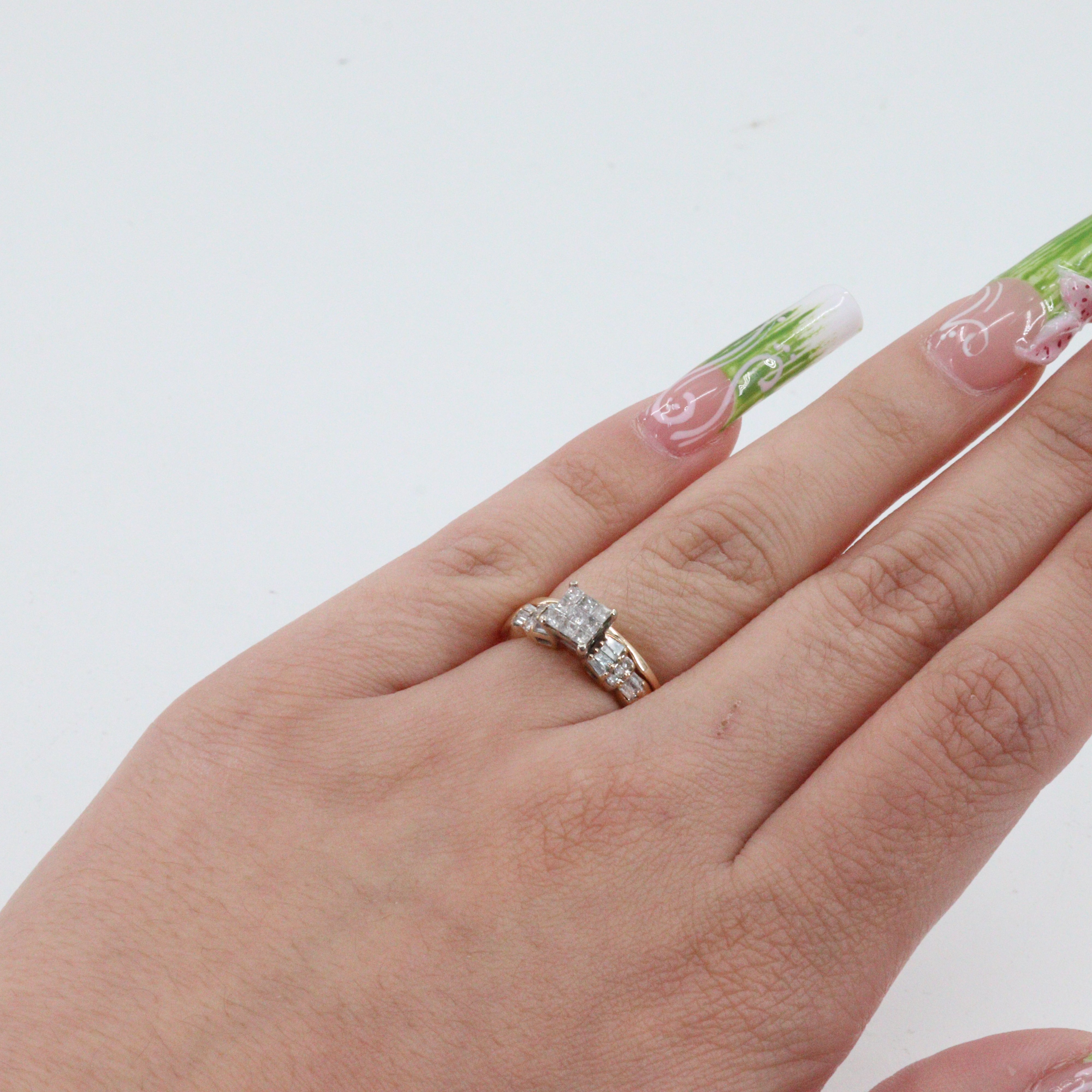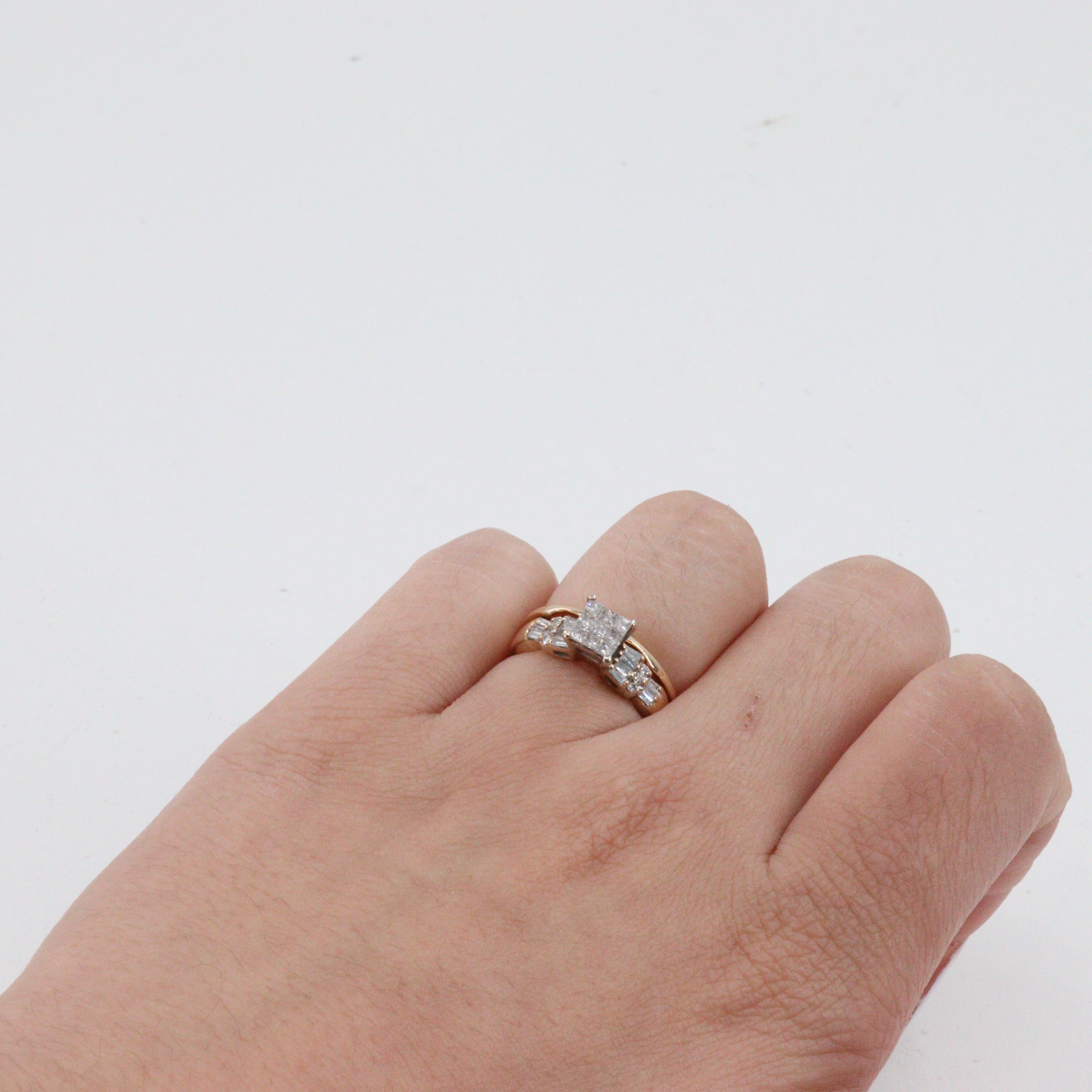 This stunning 14k Yellow Gold Cluster Diamond Engagement Set features a dazzling array of diamonds, totaling approximately 0.77 carats. The engagement ring showcases 9 princess-cut diamonds, 17 baguette-cut diamonds, and 6 round brilliant-cut diamonds, all carefully clustered for maximum sparkle. This set includes a perfectly matching wedding band. Crafted from high-quality 14k yellow gold, this beautiful set is a symbol of everlasting love.
