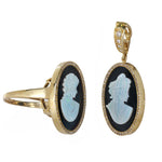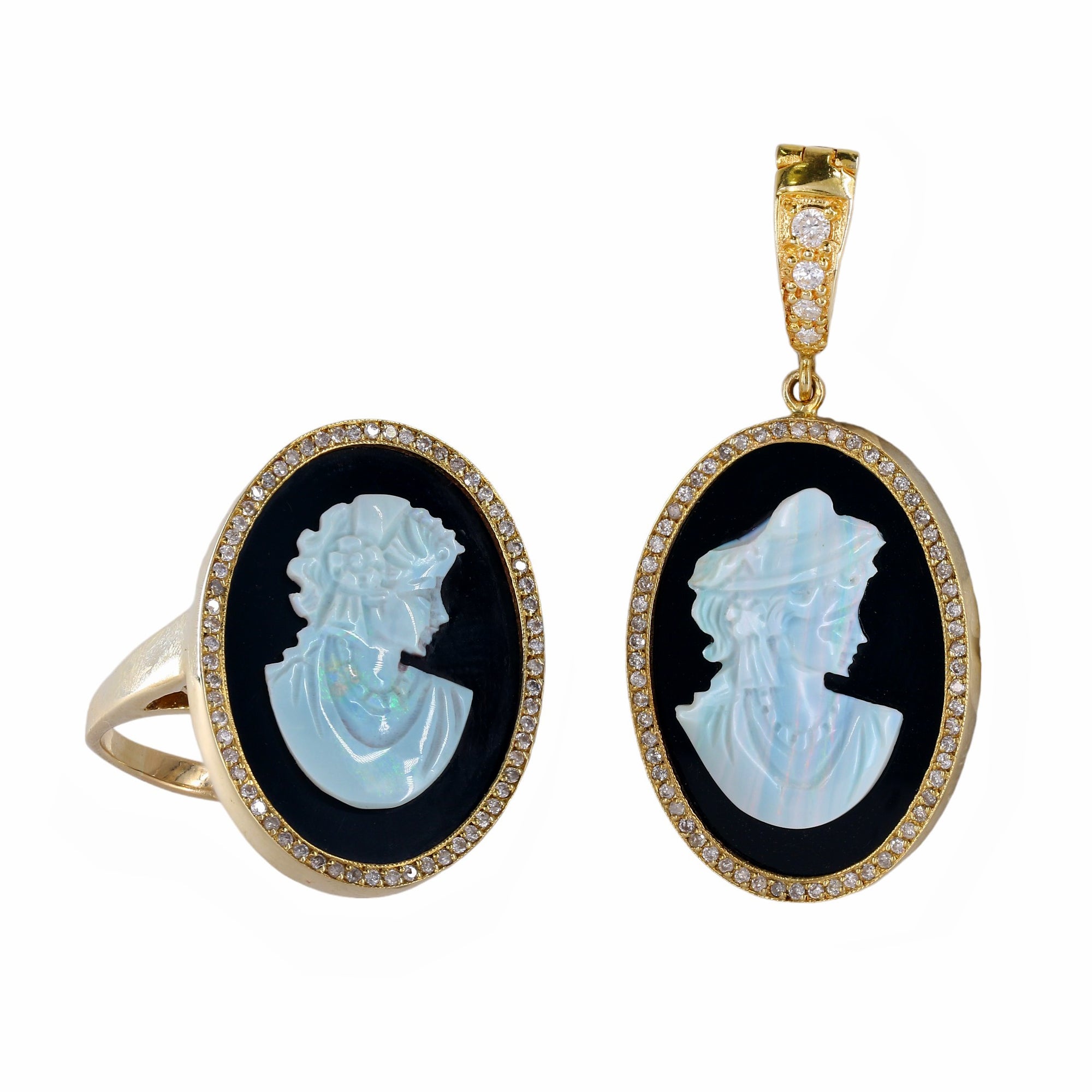 14k Yellow Gold Diamond Onyx and Opal Ring and Pendant Set