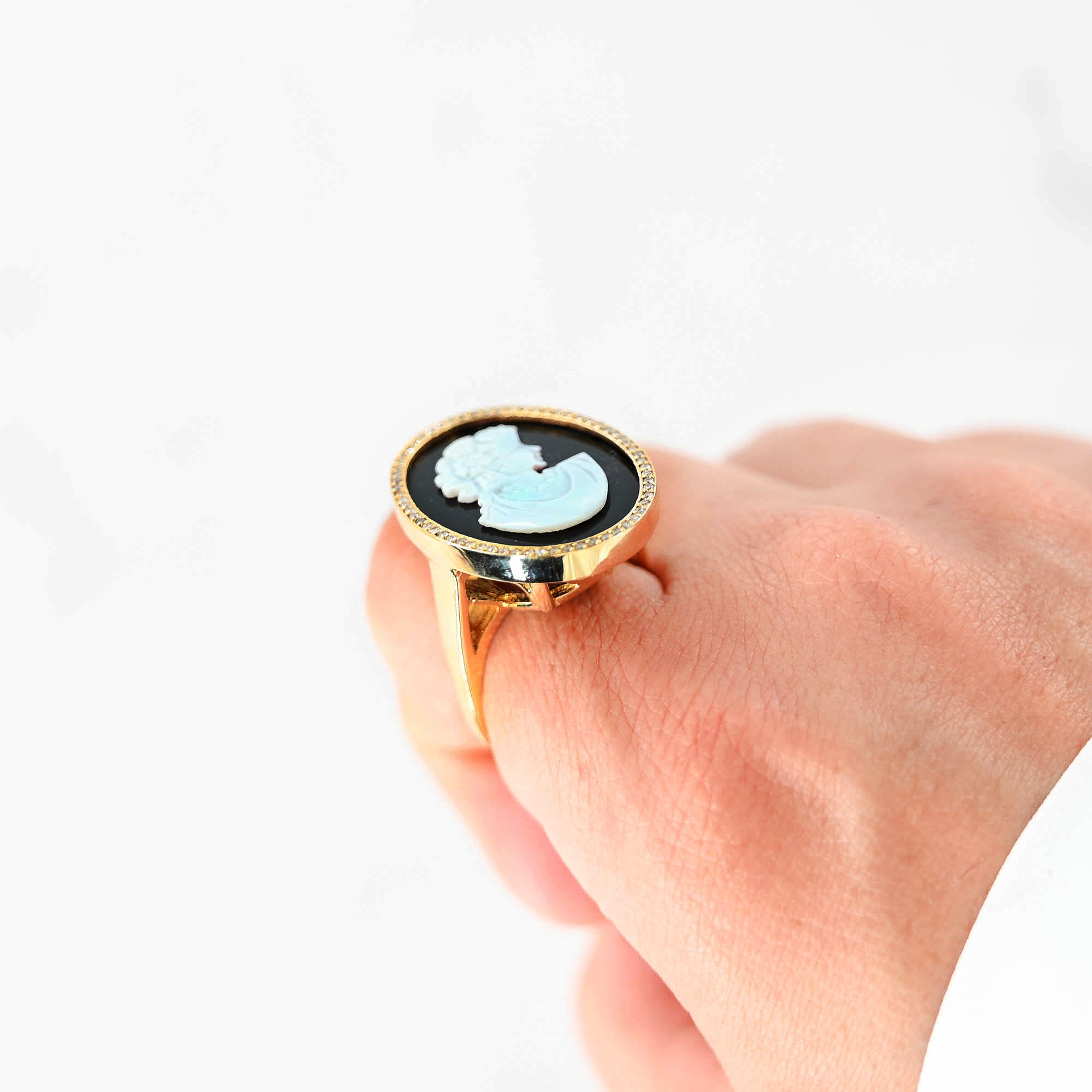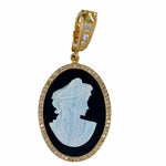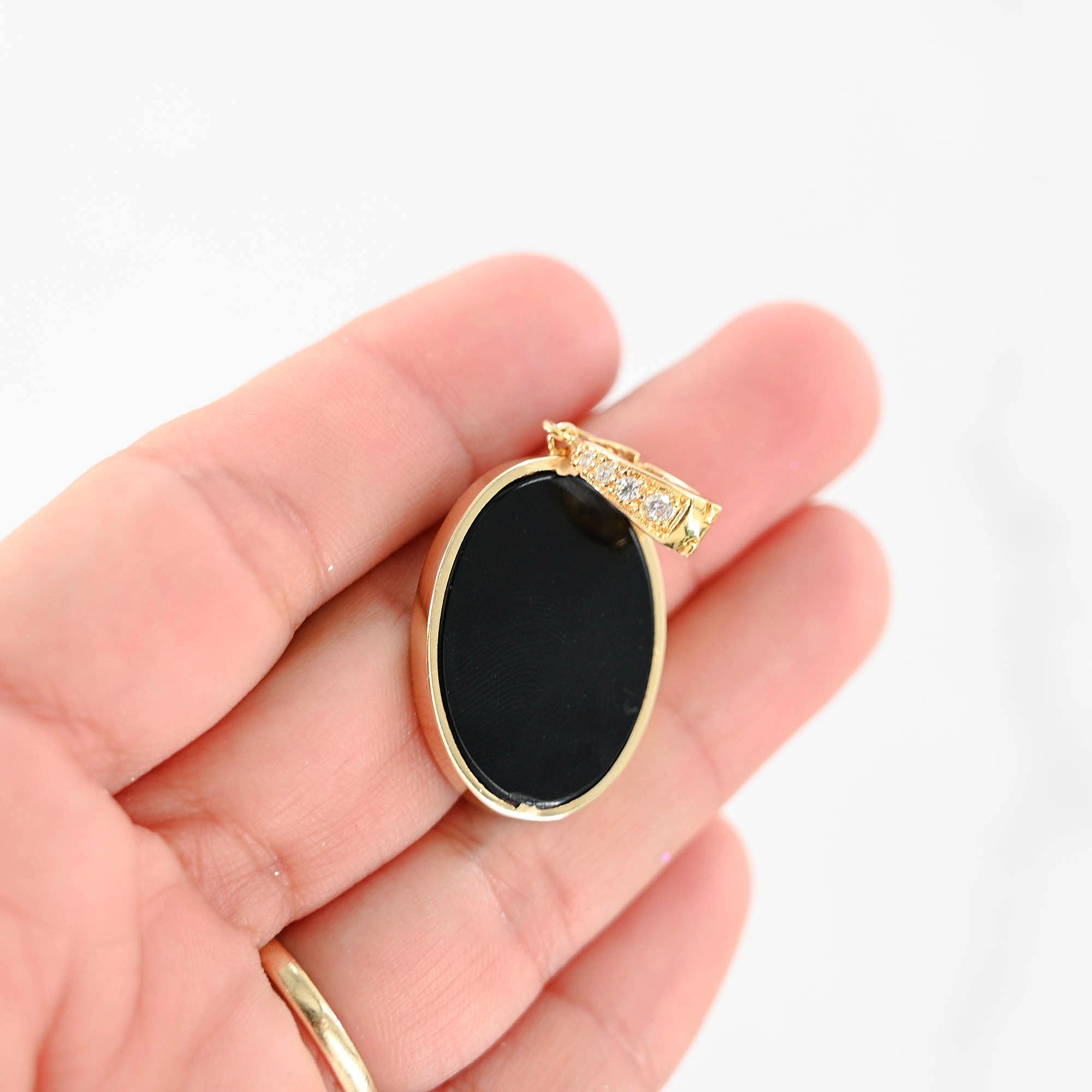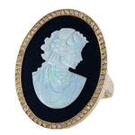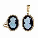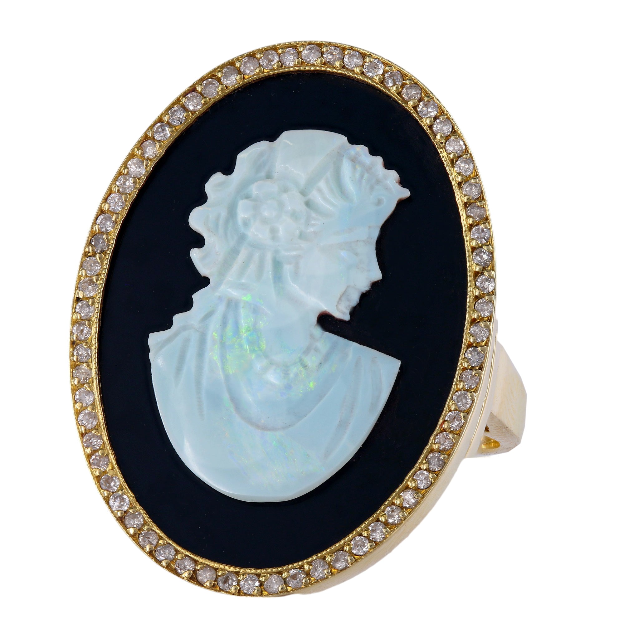 Indulge in the captivating allure of the 14k Yellow Gold Diamond Onyx and Opal Ring and Pendant Set. The meticulously crafted pendant, with dimensions of 43mm length and 20mm width, features a remarkable Onyx inlay adorned with an Opal Cameo, evoking a sense of mystique and elegance. The ensemble includes a matching ring sized at 7.25, with a 2mm shank and a head measuring 27 x 20mm. The set is embellished with 132 Round brilliant cut diamonds, each weighing 0.005 carats, with a total carat weight of 0.66. The diamonds boast a clarity of I1 and a color range of H-J. The pieces are set in luxurious 14k yellow gold, exuding a radiant warmth, and weigh a total of 16.3 grams. Secured with a reliable latchback closure, the pendant becomes a wearable masterpiece, and the ring, a symbol of timeless sophistication.