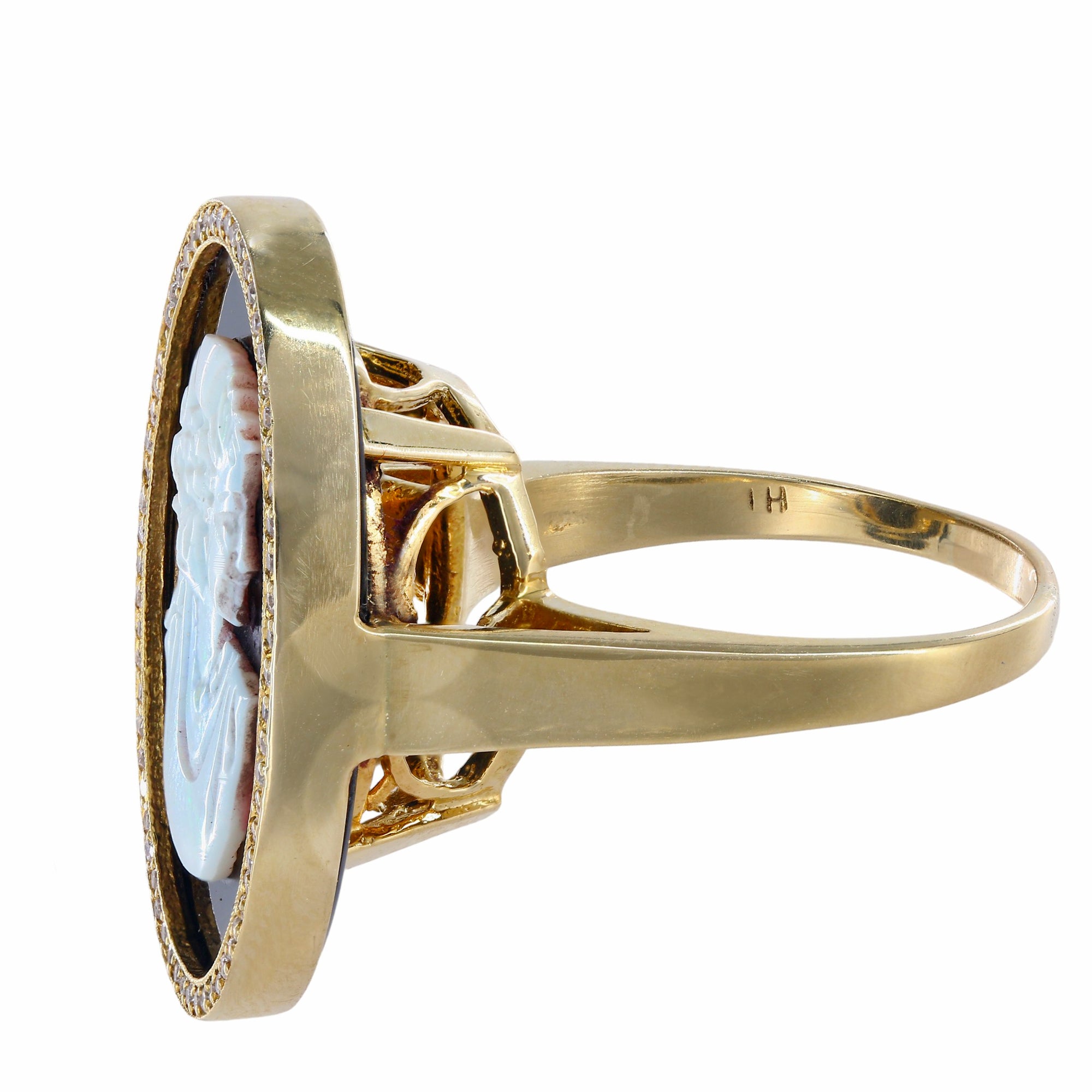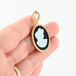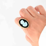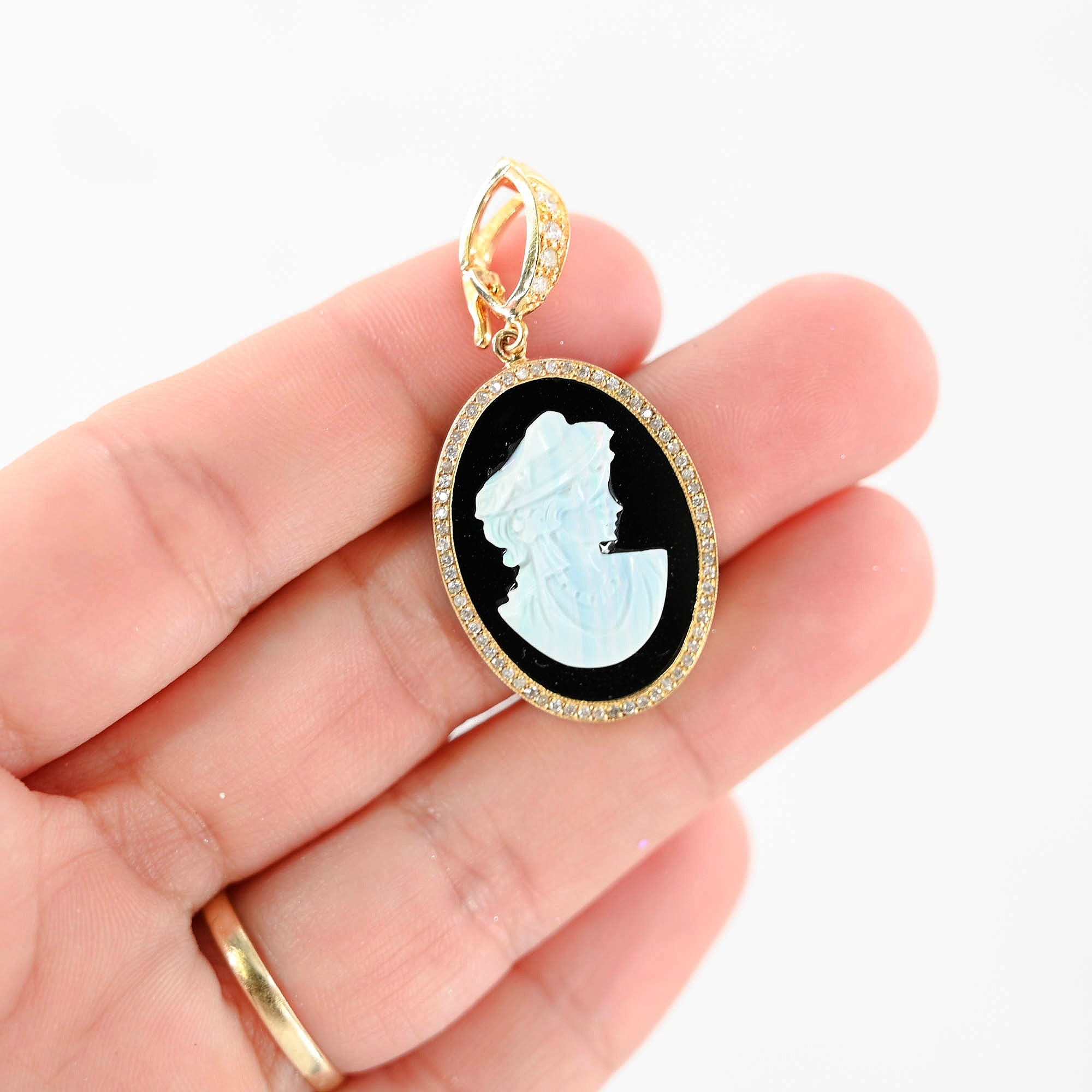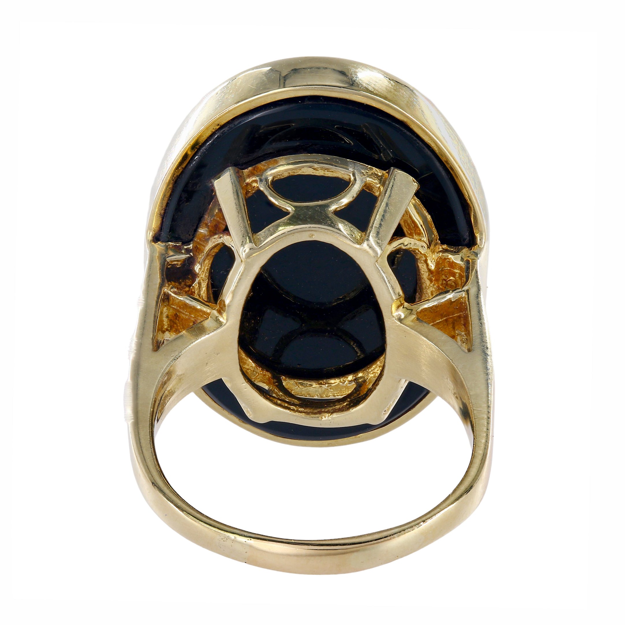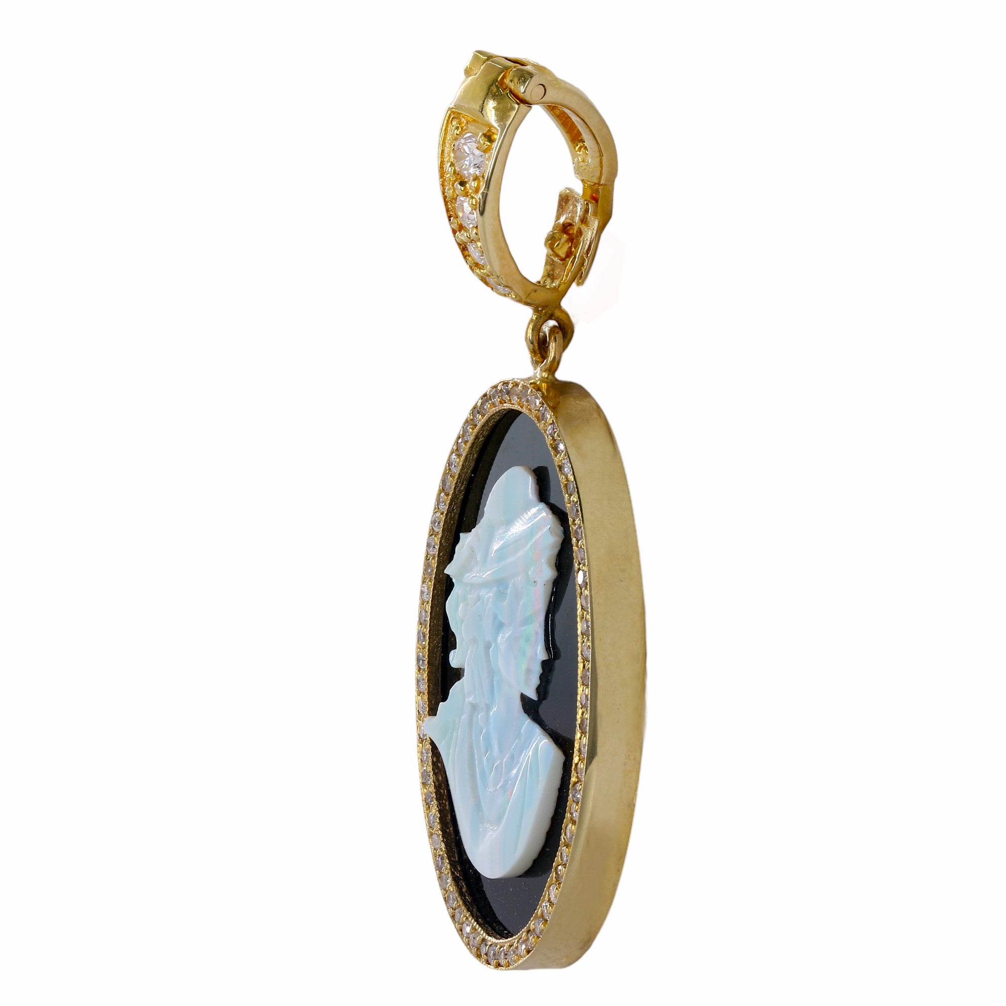 Indulge in the captivating allure of the 14k Yellow Gold Diamond Onyx and Opal Ring and Pendant Set. The meticulously crafted pendant, with dimensions of 43mm length and 20mm width, features a remarkable Onyx inlay adorned with an Opal Cameo, evoking a sense of mystique and elegance. The ensemble includes a matching ring sized at 7.25, with a 2mm shank and a head measuring 27 x 20mm. The set is embellished with 132 Round brilliant cut diamonds, each weighing 0.005 carats, with a total carat weight of 0.66. The diamonds boast a clarity of I1 and a color range of H-J. The pieces are set in luxurious 14k yellow gold, exuding a radiant warmth, and weigh a total of 16.3 grams. Secured with a reliable latchback closure, the pendant becomes a wearable masterpiece, and the ring, a symbol of timeless sophistication.