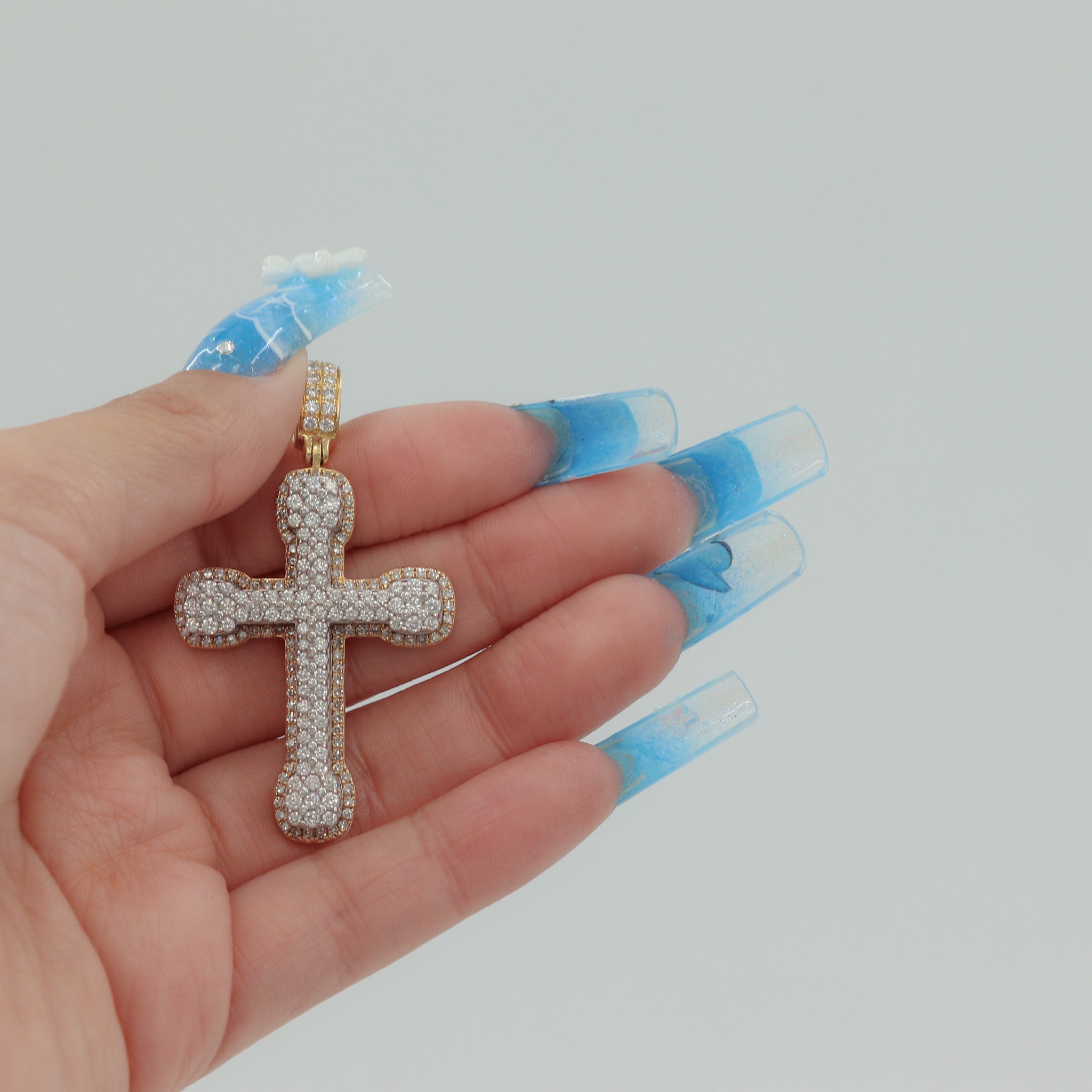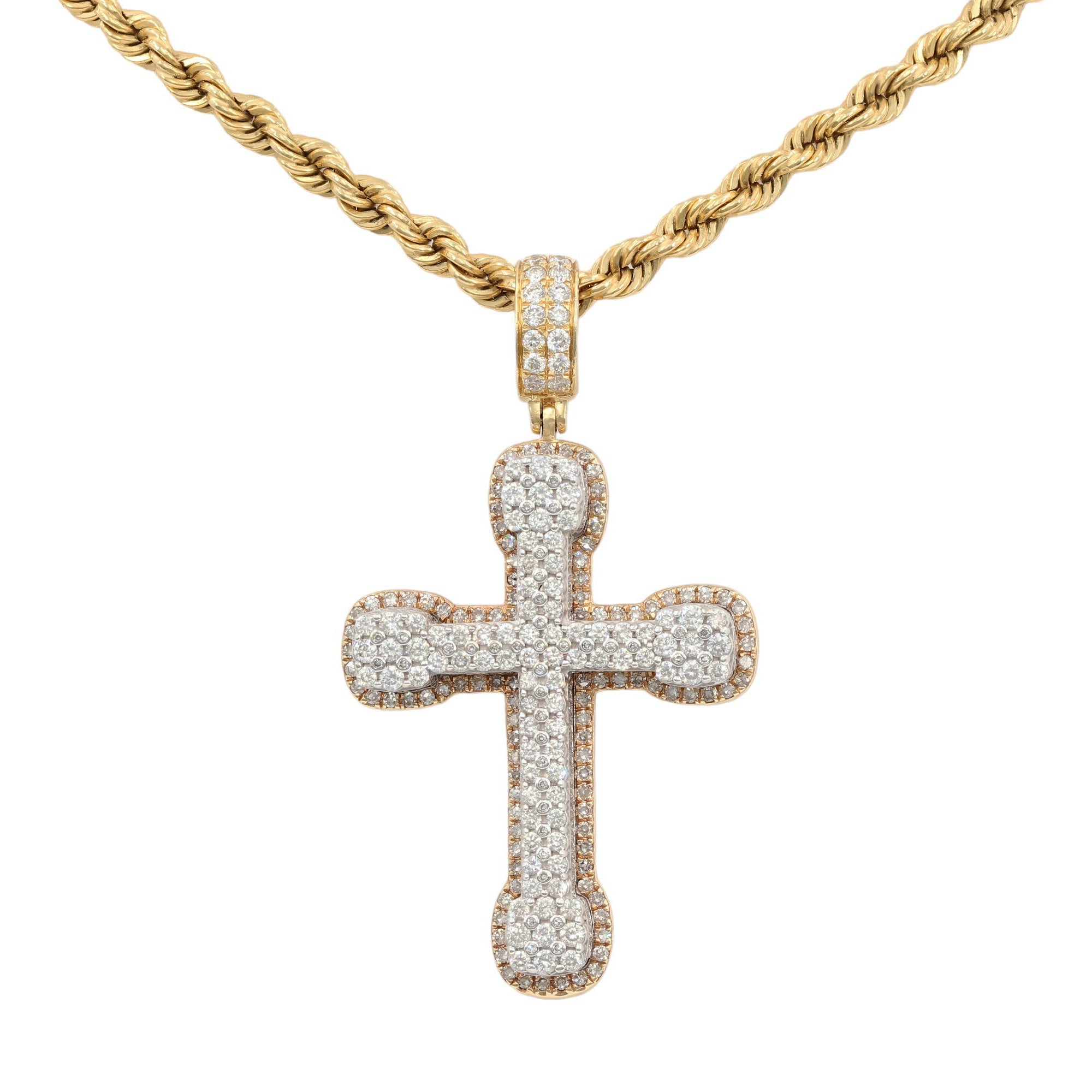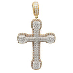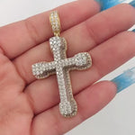 Elevate your faith with this resplendent 14k Yellow Gold Diamond Studded Cross Pendant, a radiant symbol of devotion. The pendant, measuring 2.2 inches (56mm) in length and 1.25 inches (32mm) in width, features an intricate arrangement of diamonds. The design includes 16 round brilliant-cut diamonds with a weight of 0.02ct each, 104 diamonds with a weight of 0.0067ct each, 39 diamonds with a weight of 0.0012ct each, 20 diamonds with a weight of 0.02ct each, 16 diamonds with a weight of 0.01ct each, and 48 diamonds with a weight of 0.01ct each. In total, these diamonds contribute to a stunning 3.02ctw. The stones exhibit a beautiful range of H-J color and SI2 clarity. Crafted in lustrous 14k yellow gold, this pendant weighs 18.2g, providing a substantial and enduring piece to express your spirituality in style.