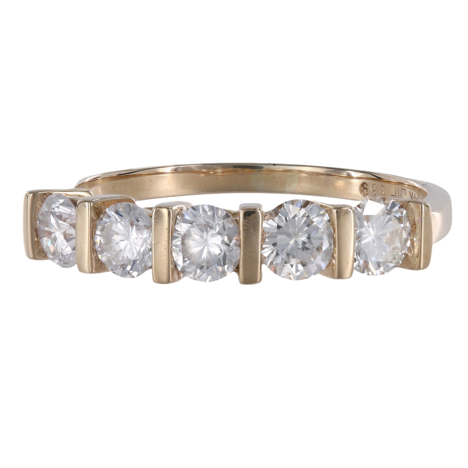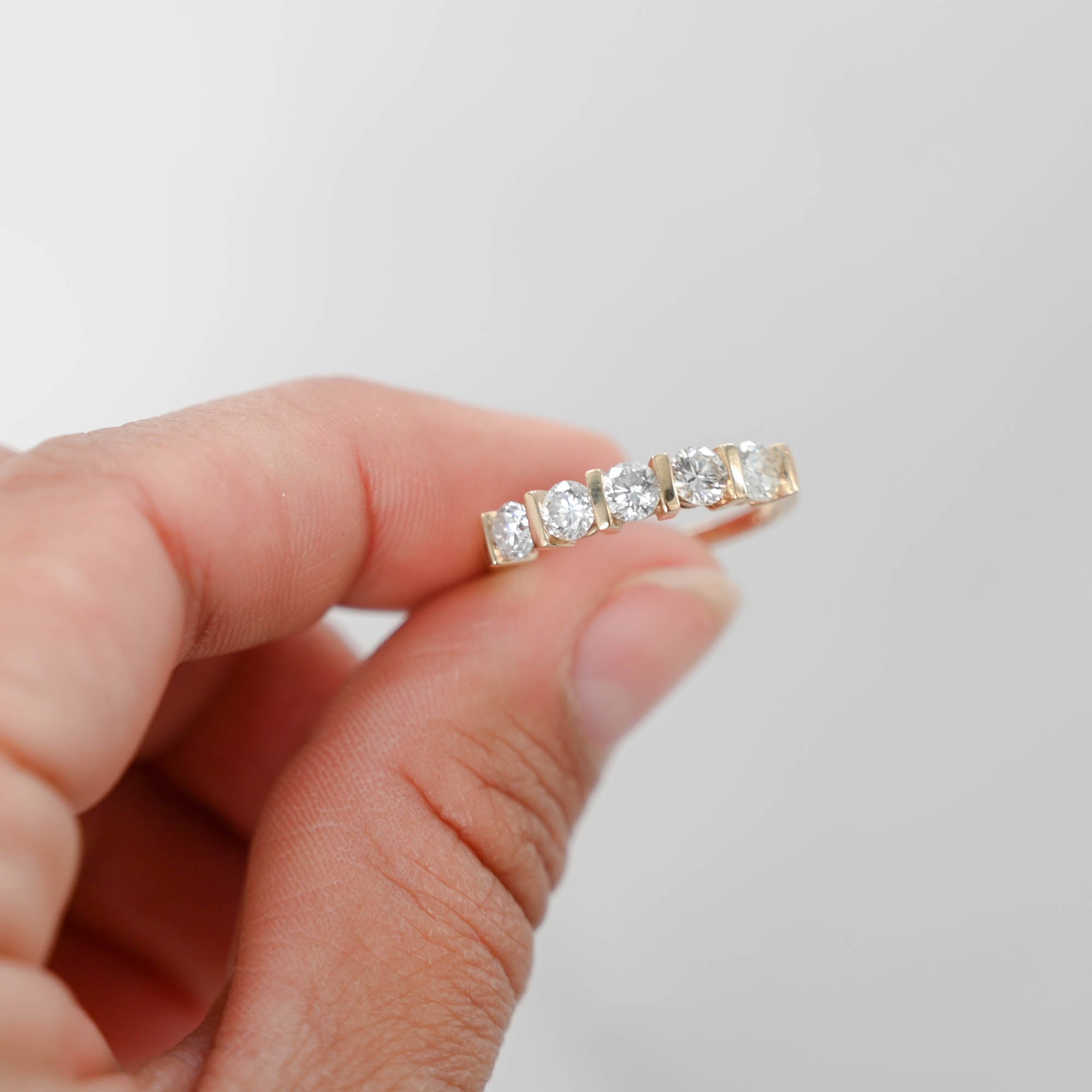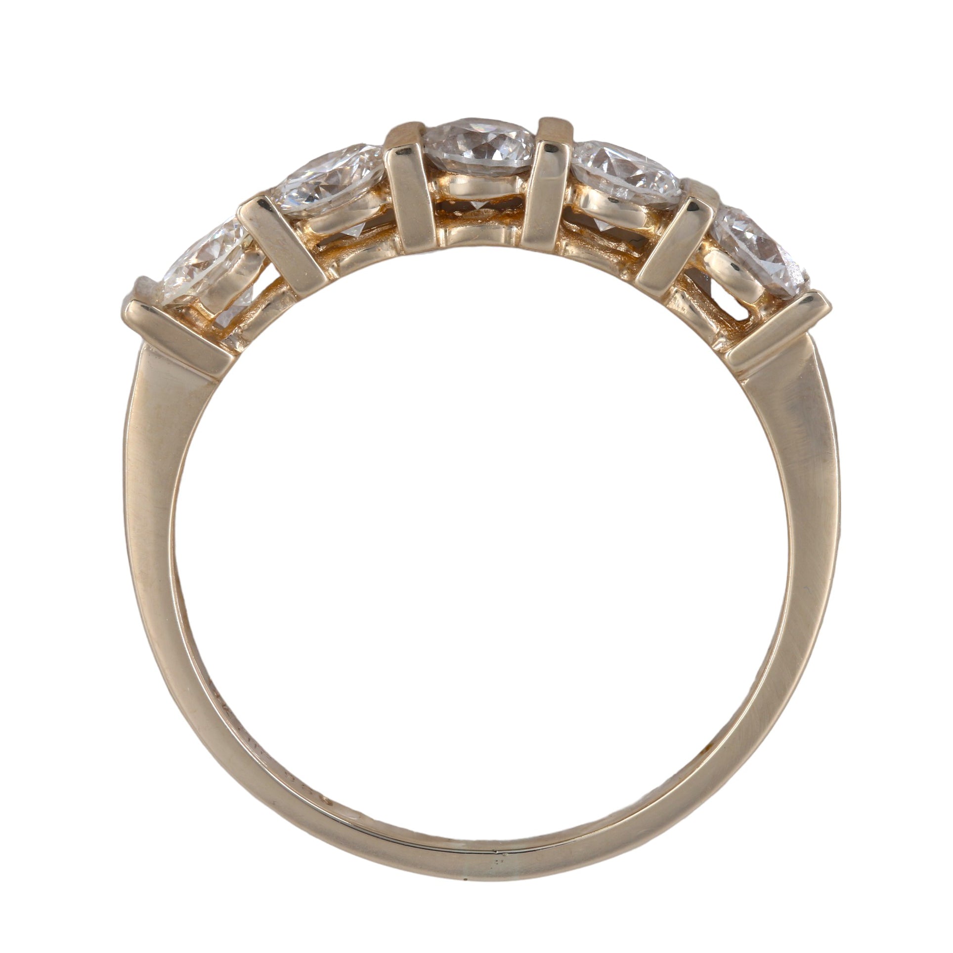 Embrace everlasting love with this exquisite 14k Yellow Gold Diamond Wedding Band. Delicately crafted with a slender shank size of 1.5mm and a band size of 4mm, this ring boasts five dazzling round brilliant cut diamonds, each weighing 0.21ct. With a total carat weight of 1.05ctw and adorned with stones of VS2 clarity and H-K color, it radiates beauty and elegance. Designed in luxurious 14k yellow gold and featuring a ring size of 7.25, this enchanting piece symbolizes eternal commitment and sophistication.