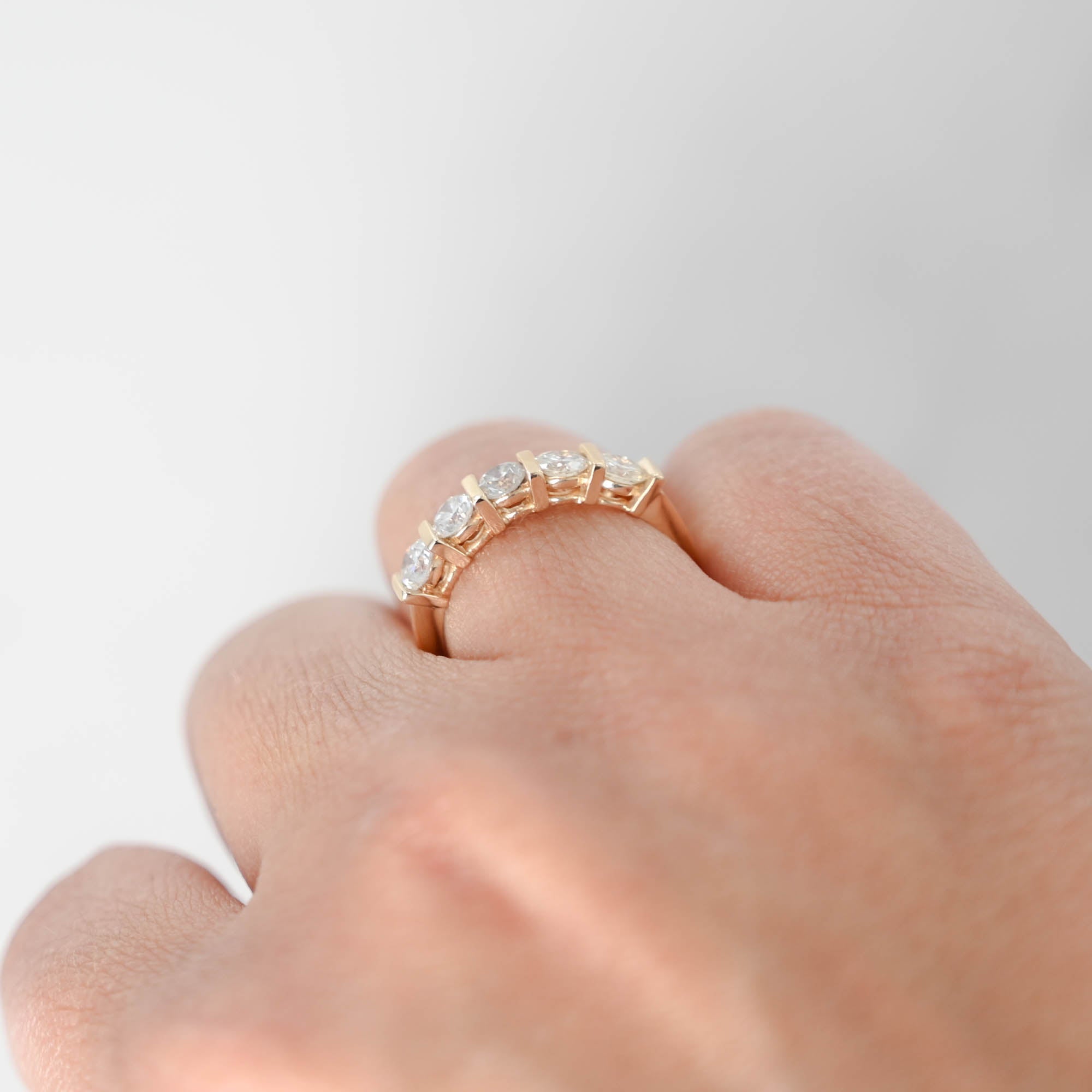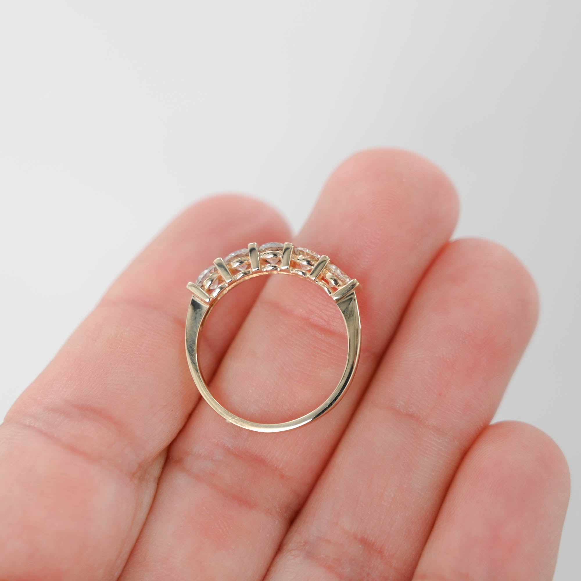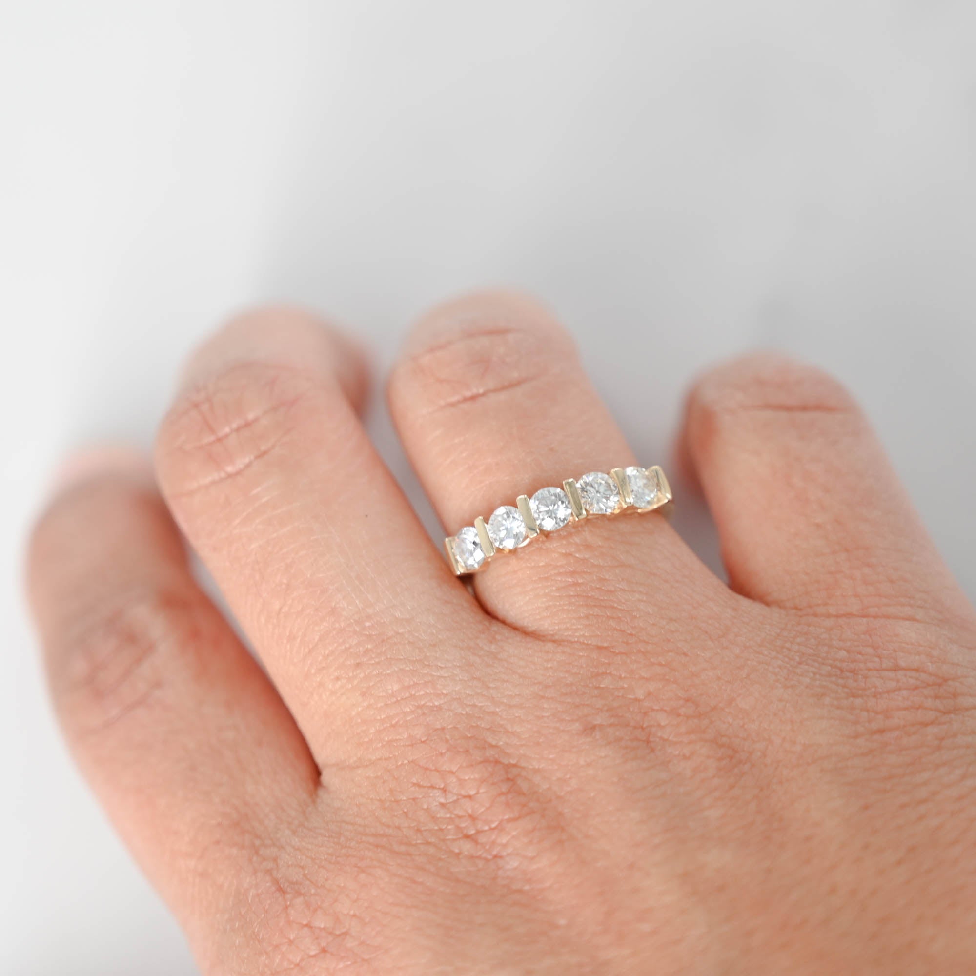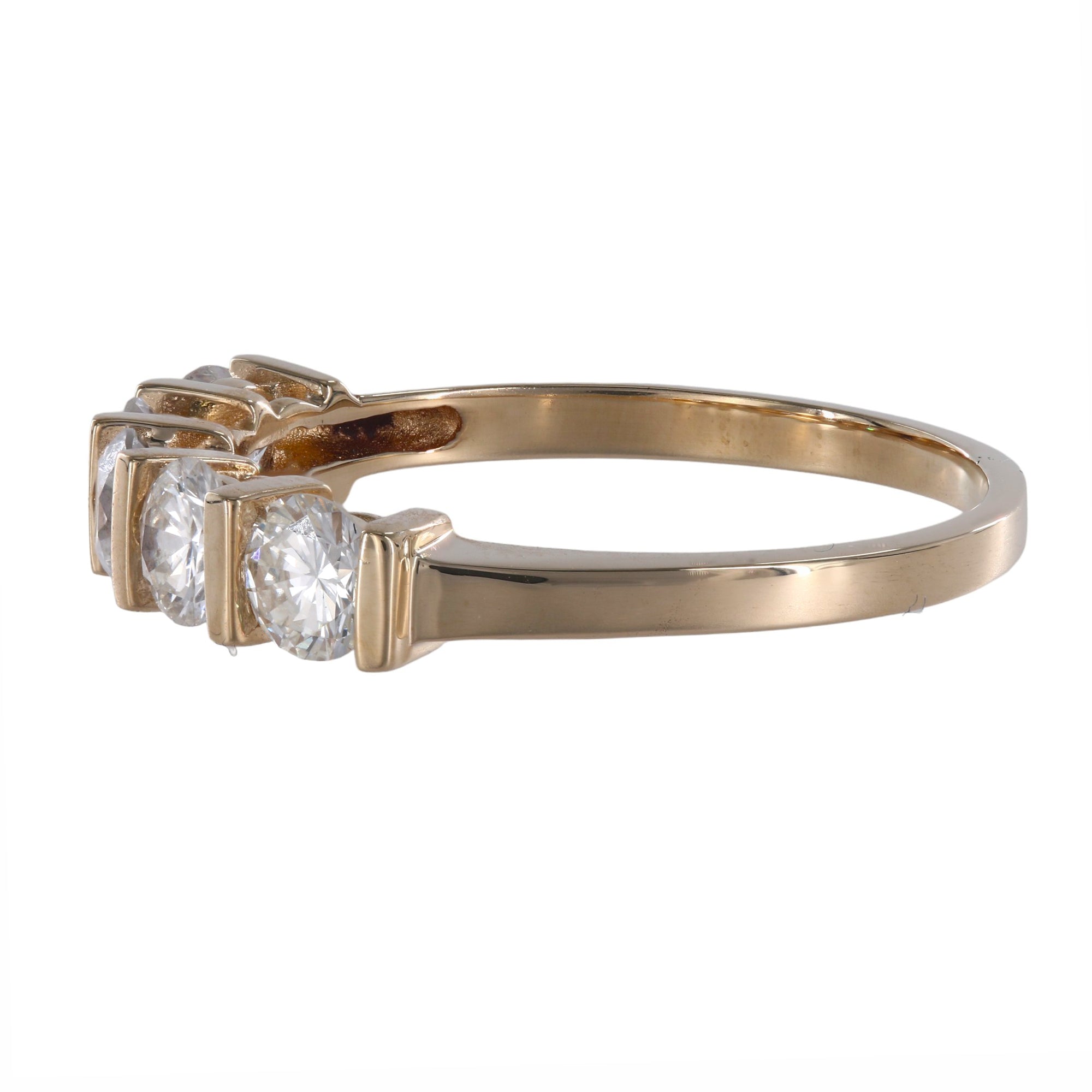 Embrace everlasting love with this exquisite 14k Yellow Gold Diamond Wedding Band. Delicately crafted with a slender shank size of 1.5mm and a band size of 4mm, this ring boasts five dazzling round brilliant cut diamonds, each weighing 0.21ct. With a total carat weight of 1.05ctw and adorned with stones of VS2 clarity and H-K color, it radiates beauty and elegance. Designed in luxurious 14k yellow gold and featuring a ring size of 7.25, this enchanting piece symbolizes eternal commitment and sophistication.